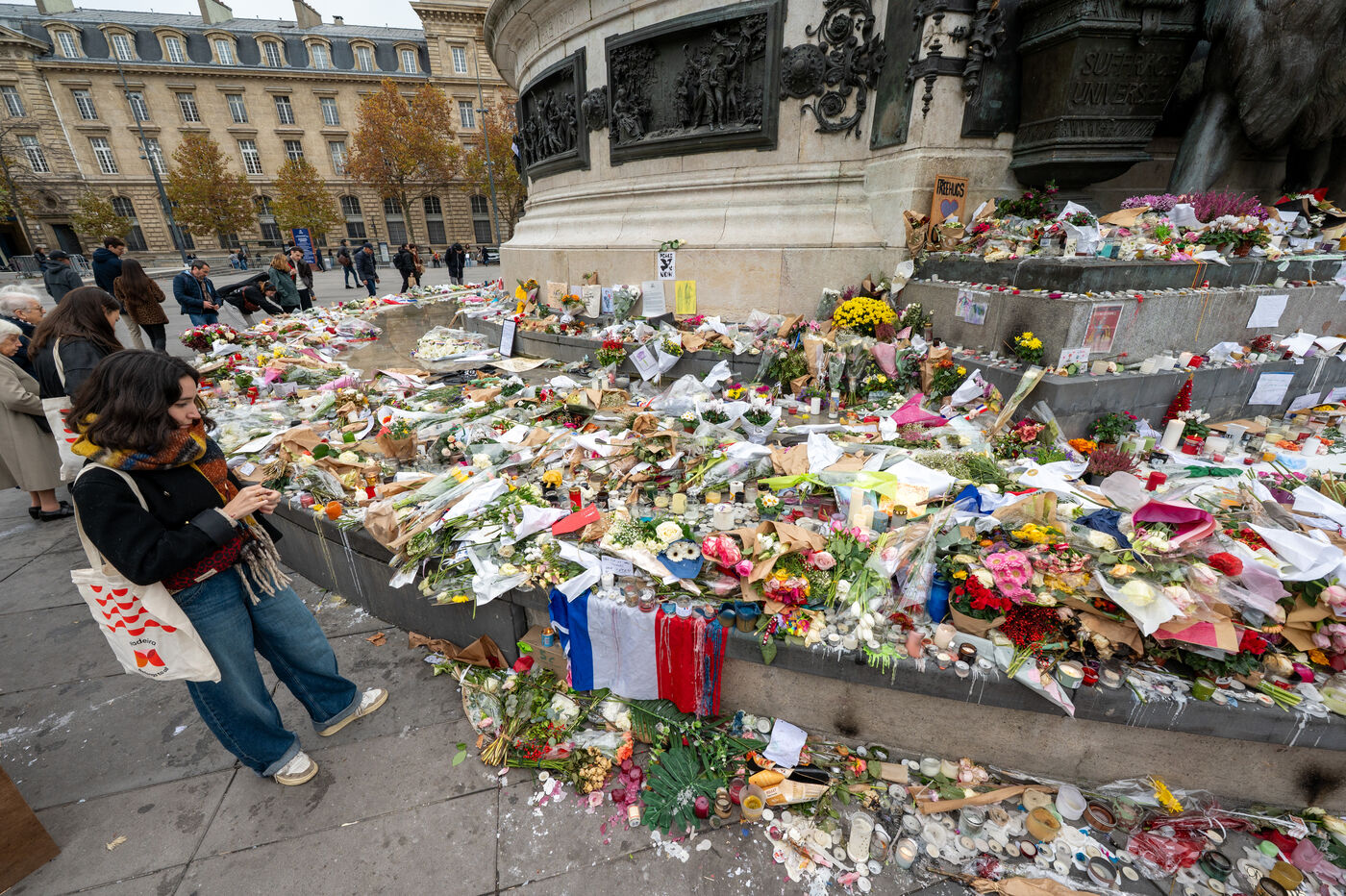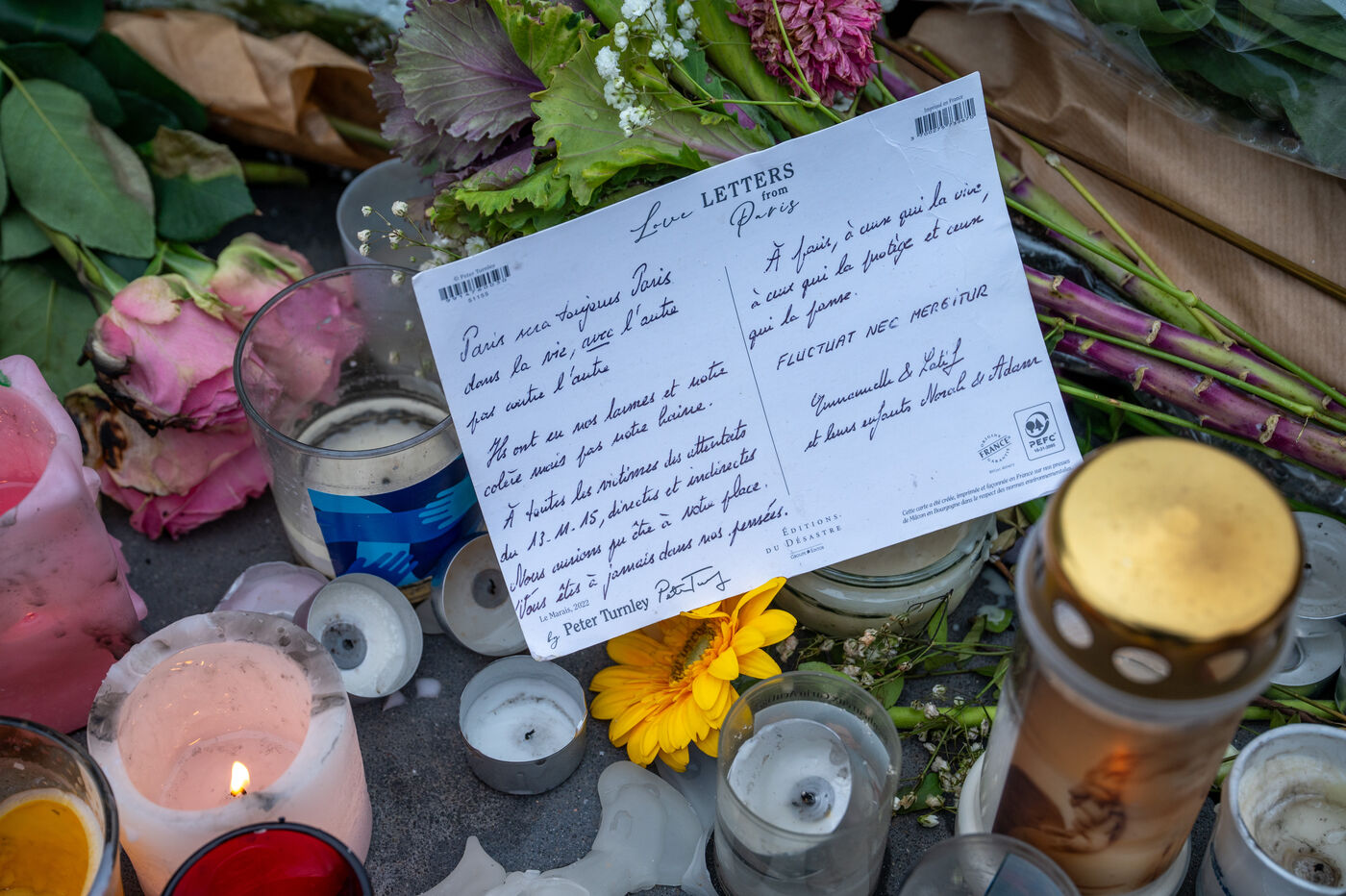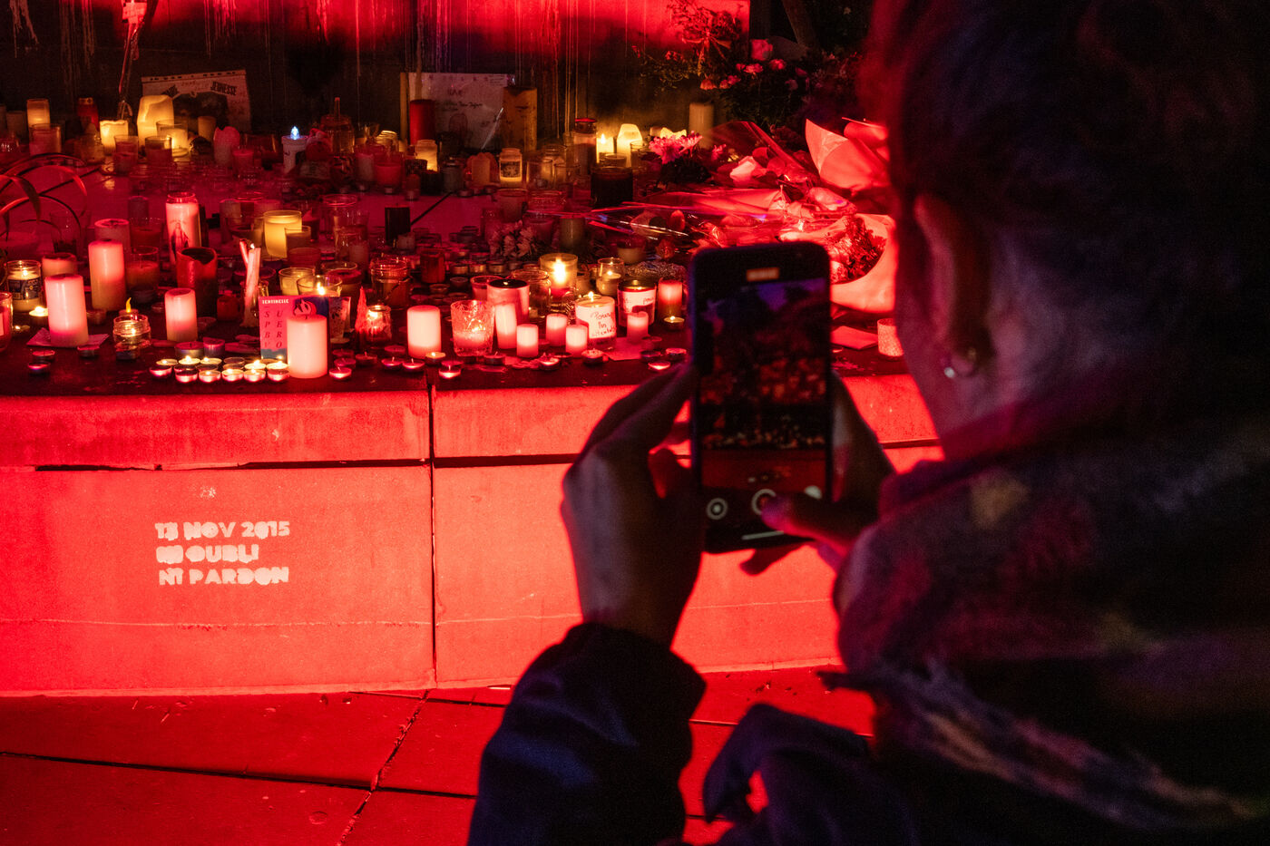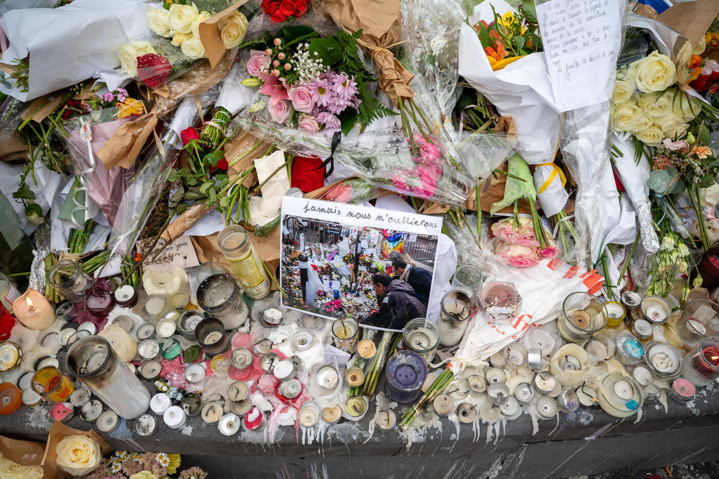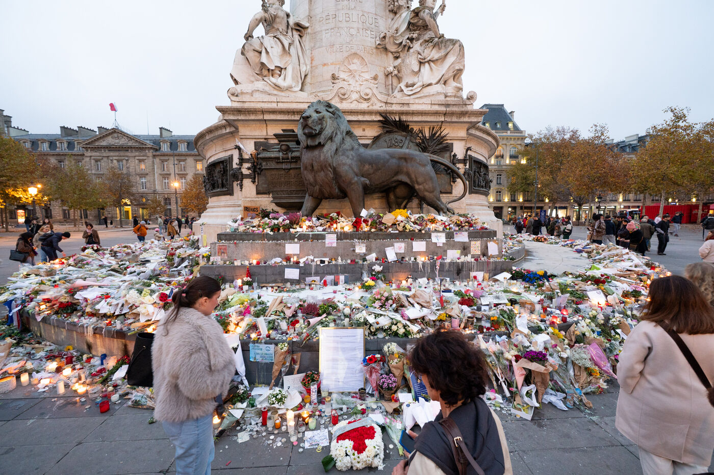 Fleurs et bougies, messages d'amour et d'amitié, commémorations spontanées et manifestations officielles se déroulent 10 ans après les attentats terroristes meurtrier de 2015 dans plusieurs lieux symboliques de la ville de Paris, dont la Place de la République, à proximité de la Mairie de Paris avec l'inauguration d'un monument pour toutes les victimes ou encore sur les différents sites touchés mortellement dans la capitale.