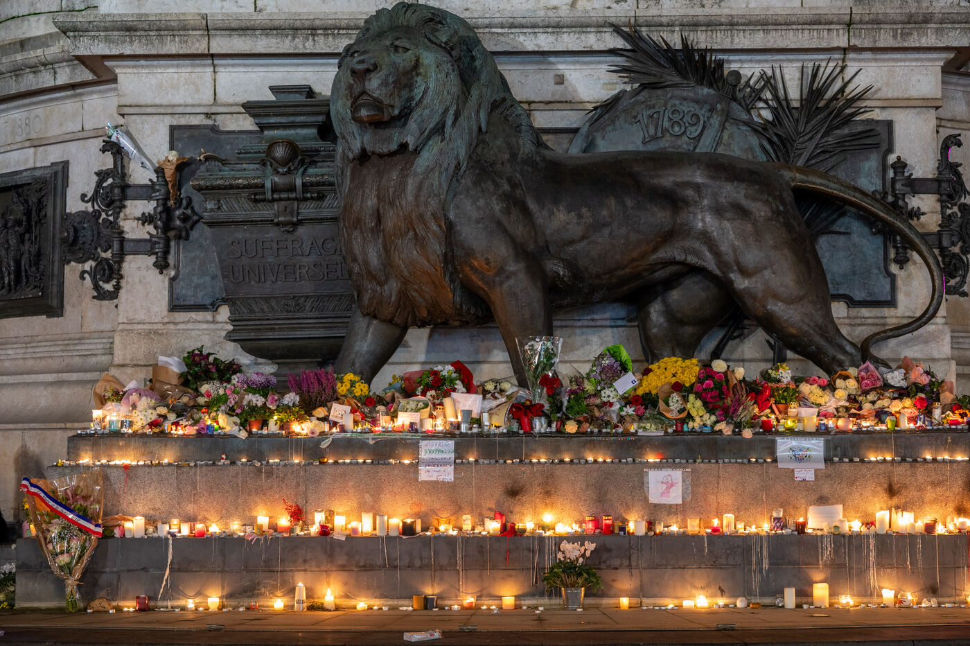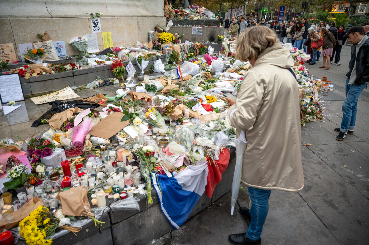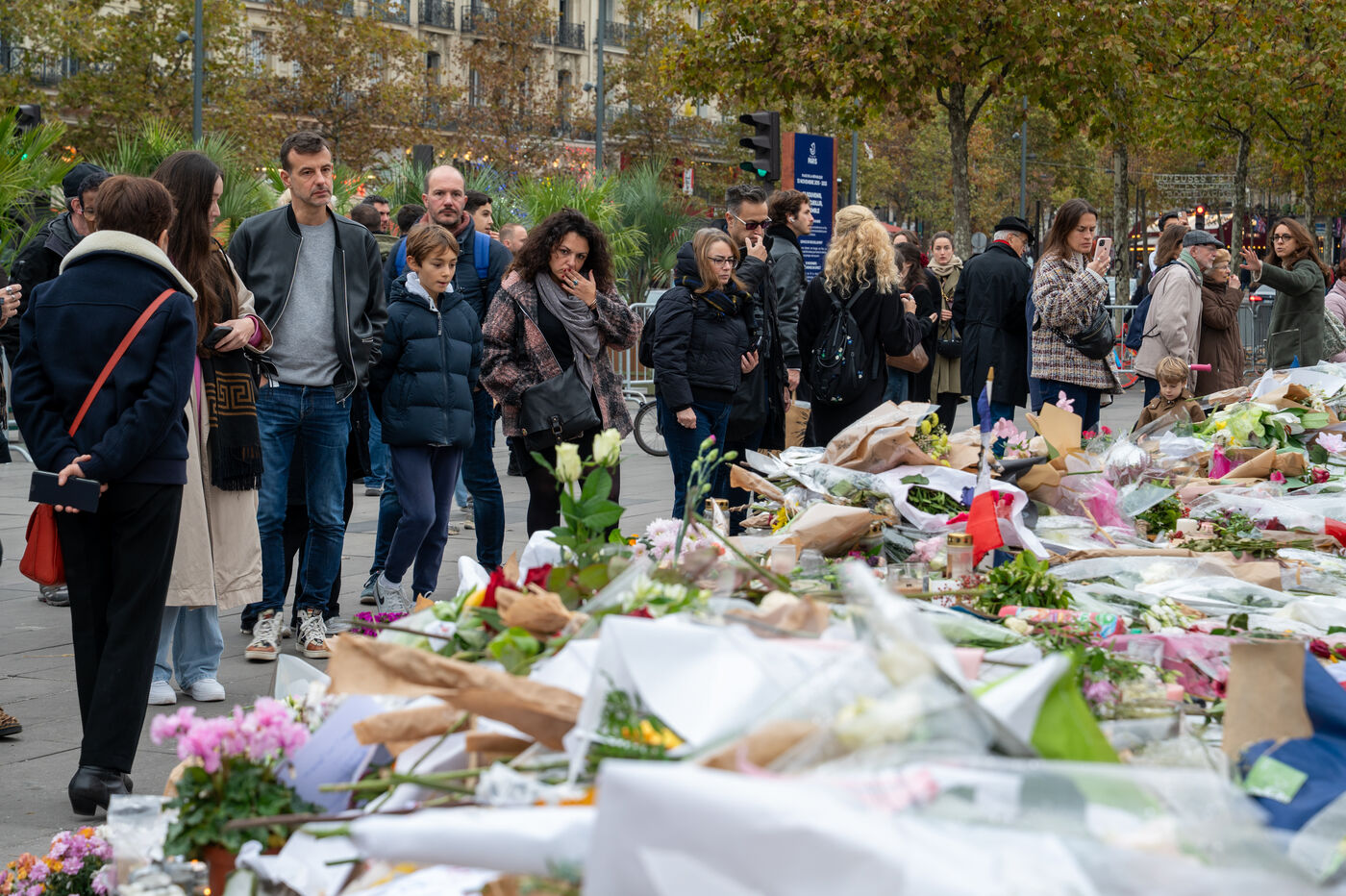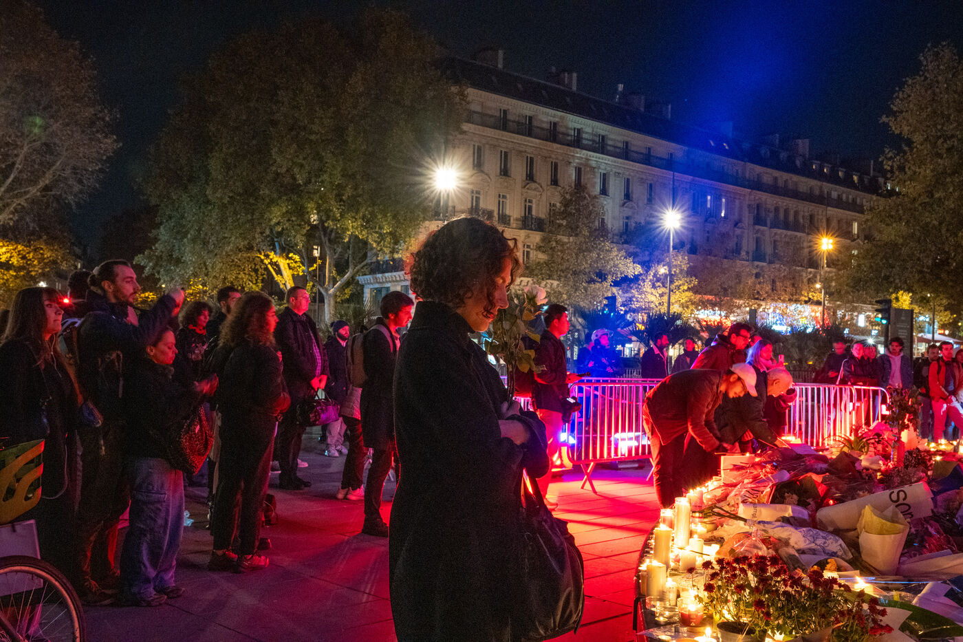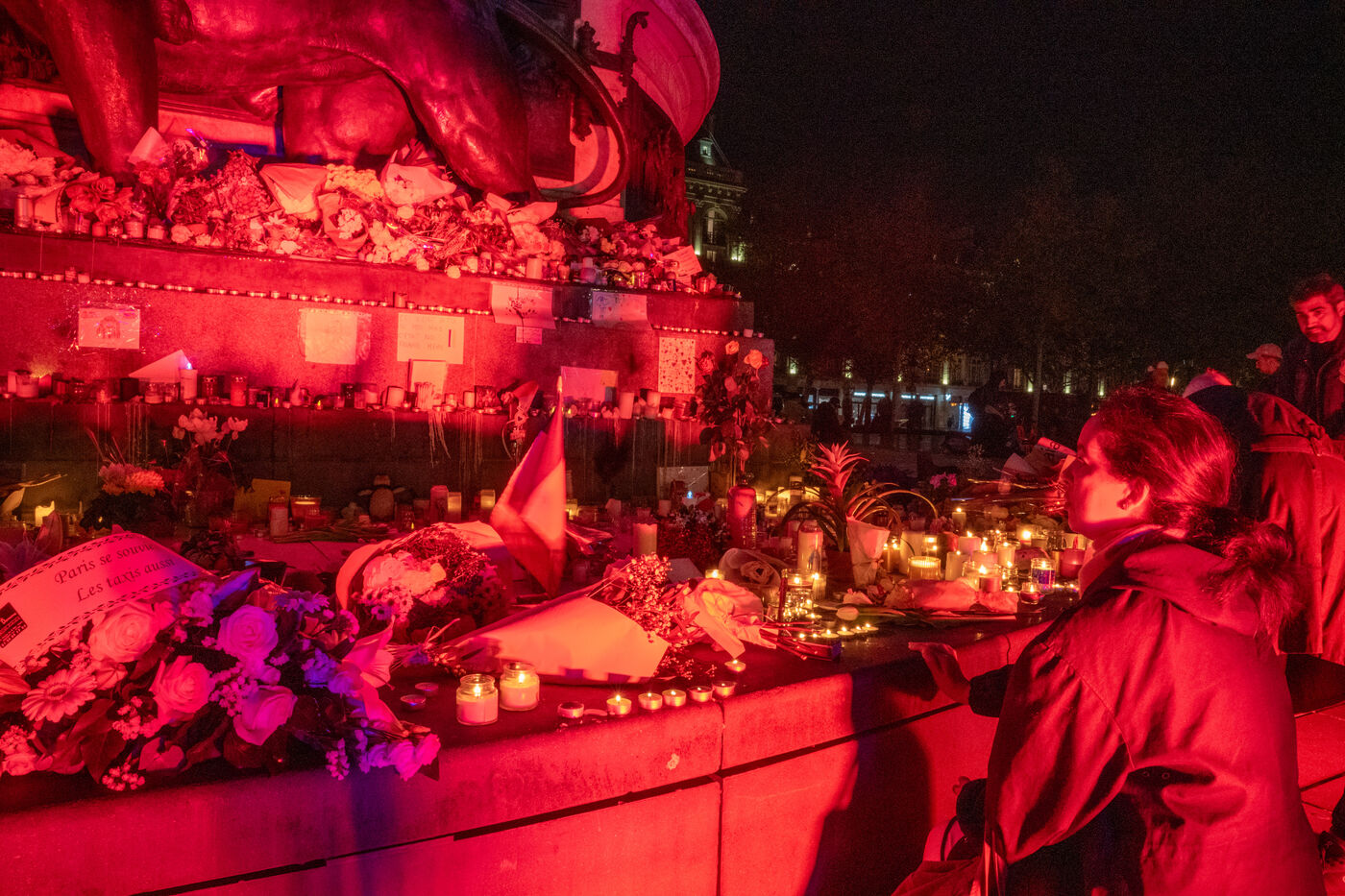 Fleurs et bougies, messages d'amour et d'amitié, commémorations spontanées et manifestations officielles se déroulent 10 ans après les attentats terroristes meurtrier de 2015 dans plusieurs lieux symboliques de la ville de Paris, dont la Place de la République, à proximité de la Mairie de Paris avec l'inauguration d'un monument pour toutes les victimes ou encore sur les différents sites touchés mortellement dans la capitale.