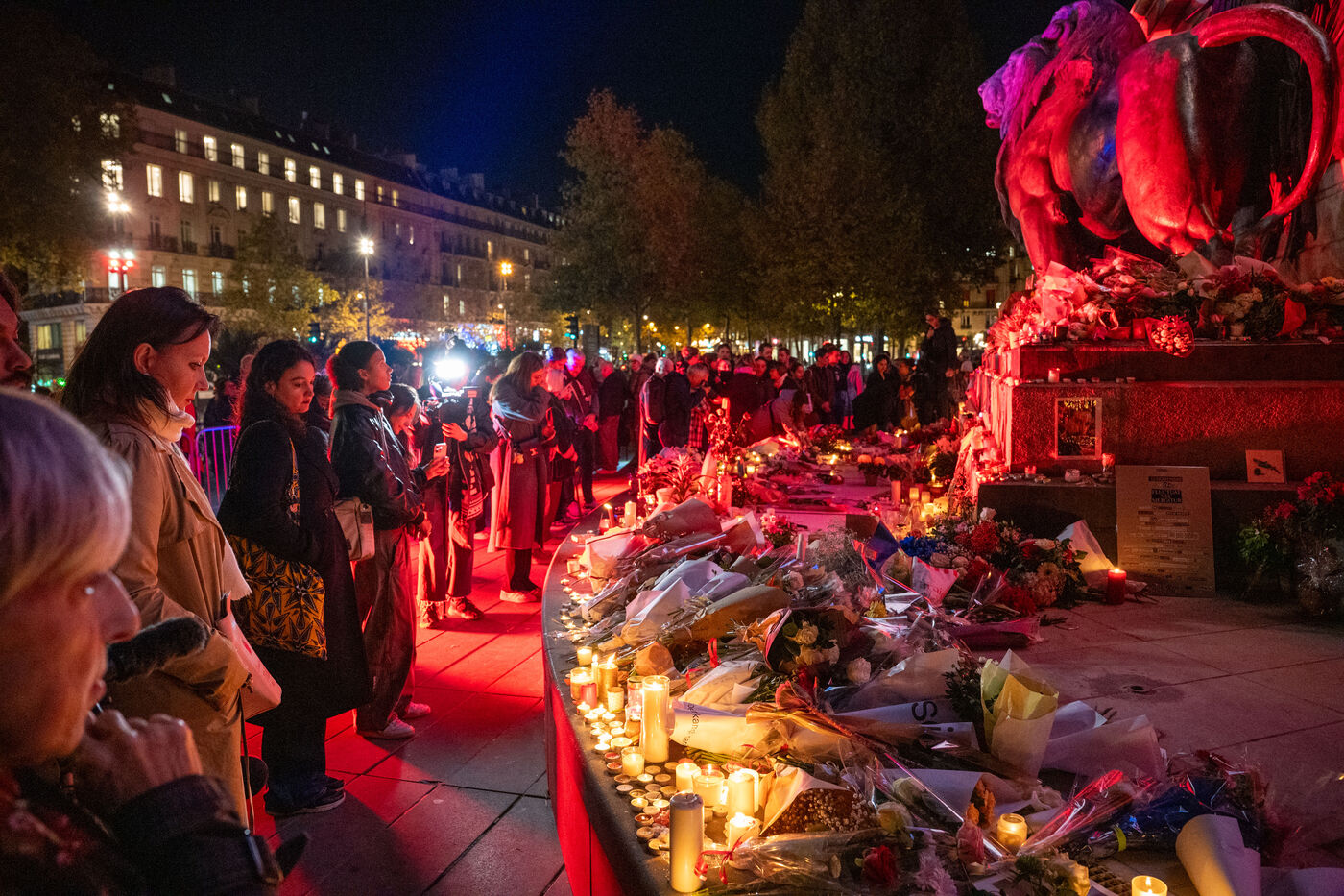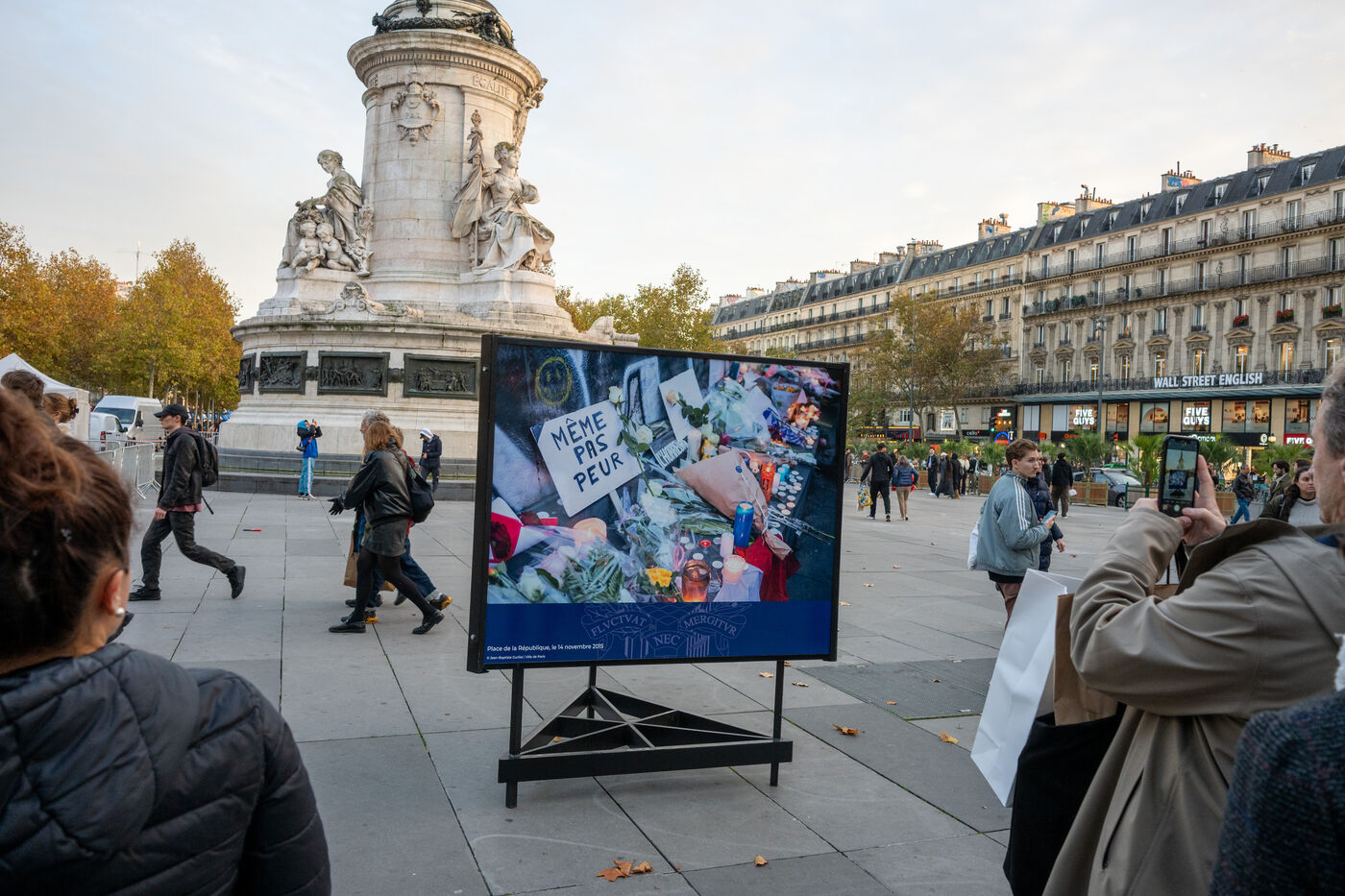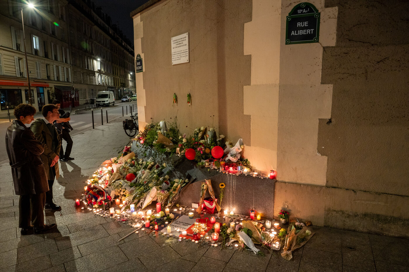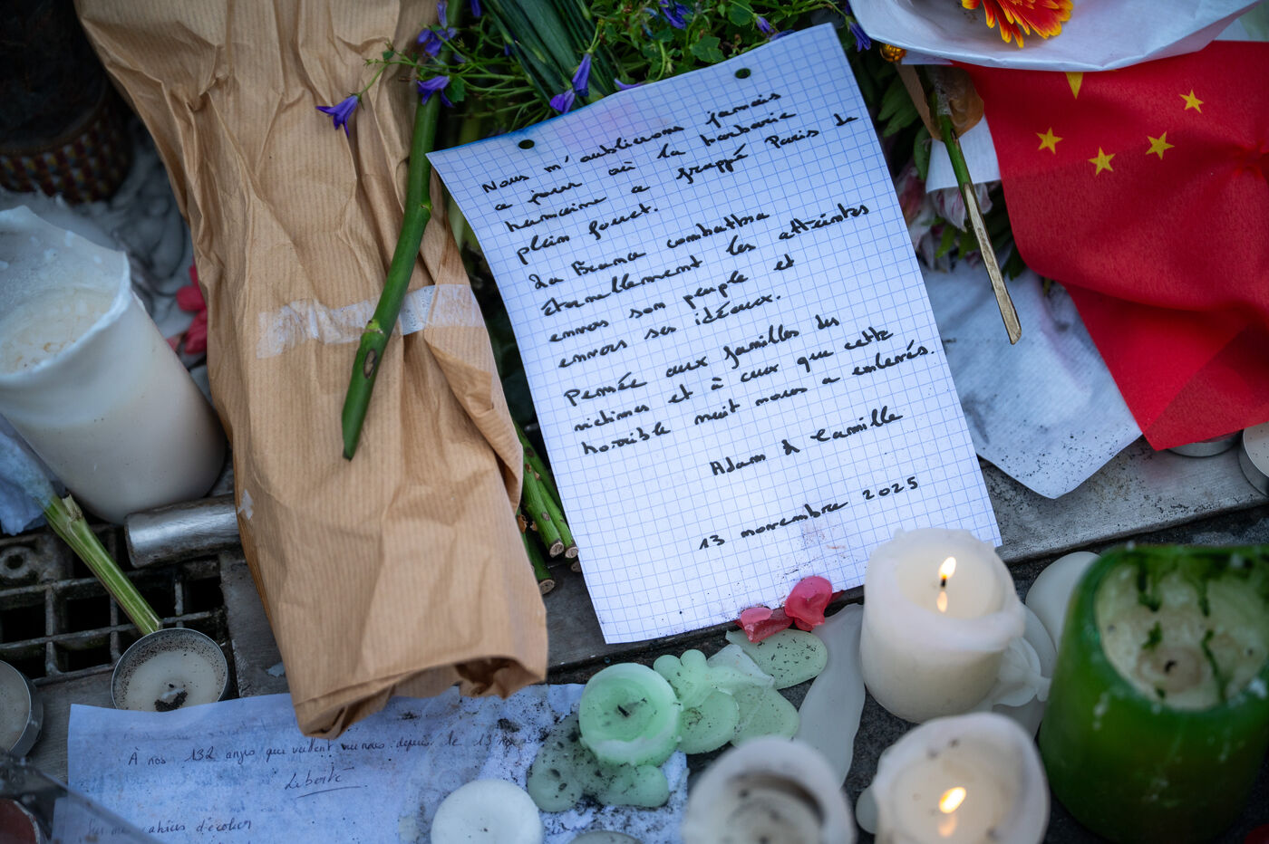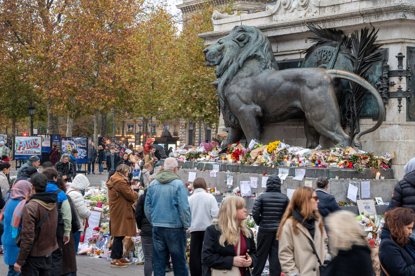 Fleurs et bougies, messages d'amour et d'amitié, commémorations spontanées et manifestations officielles se déroulent 10 ans après les attentats terroristes meurtrier de 2015 dans plusieurs lieux symboliques de la ville de Paris, dont la Place de la République, à proximité de la Mairie de Paris avec l'inauguration d'un monument pour toutes les victimes ou encore sur les différents sites touchés mortellement dans la capitale.