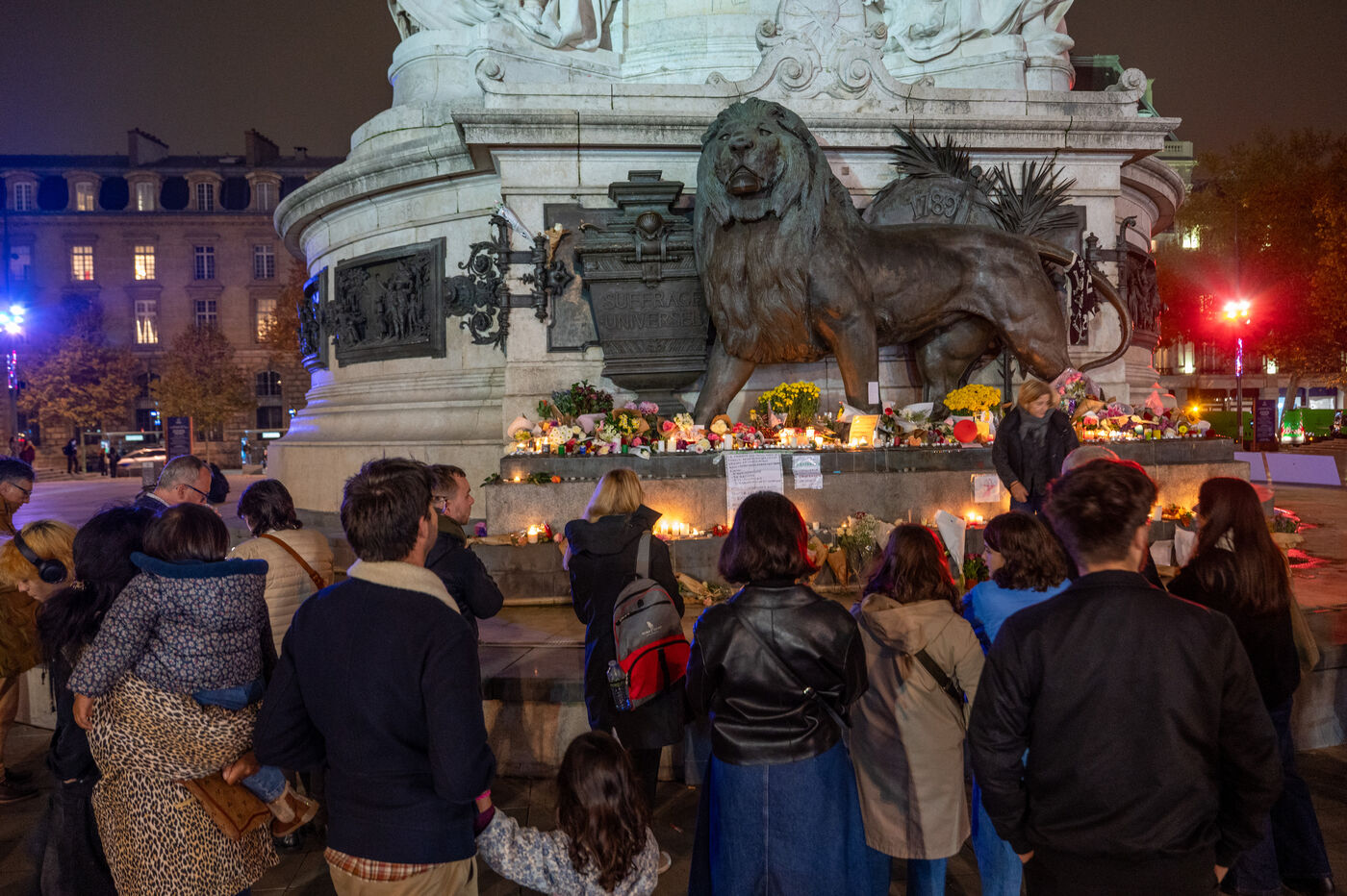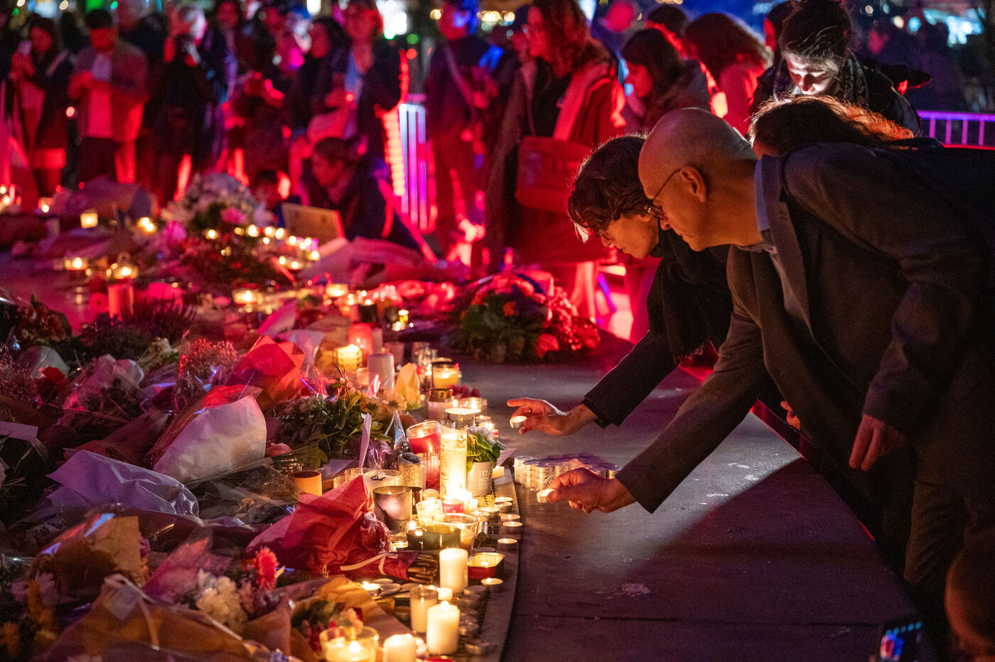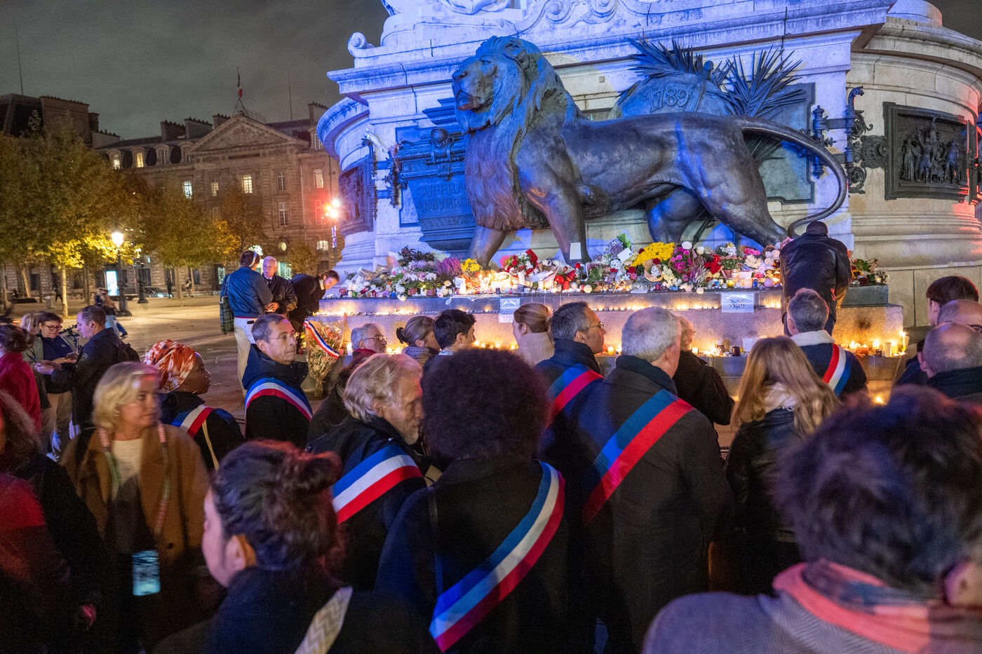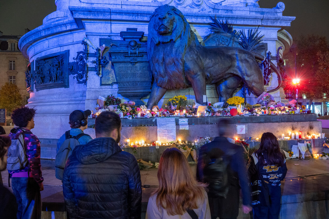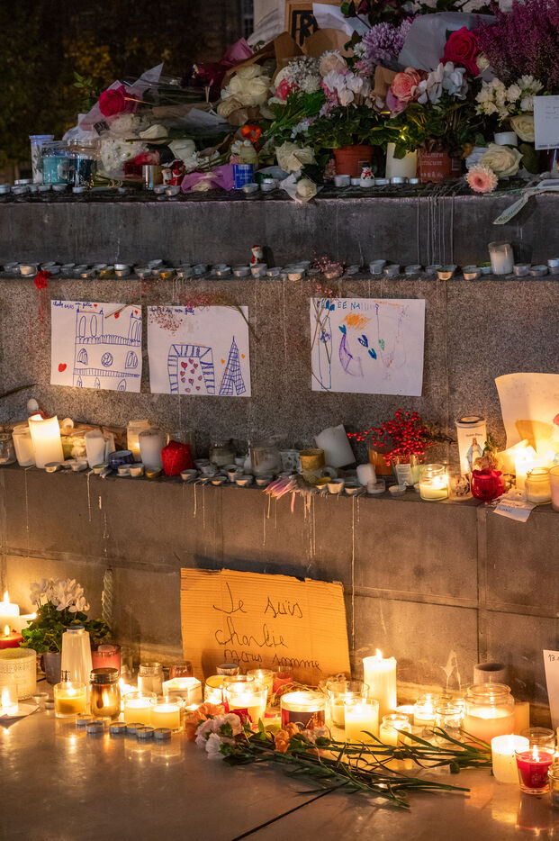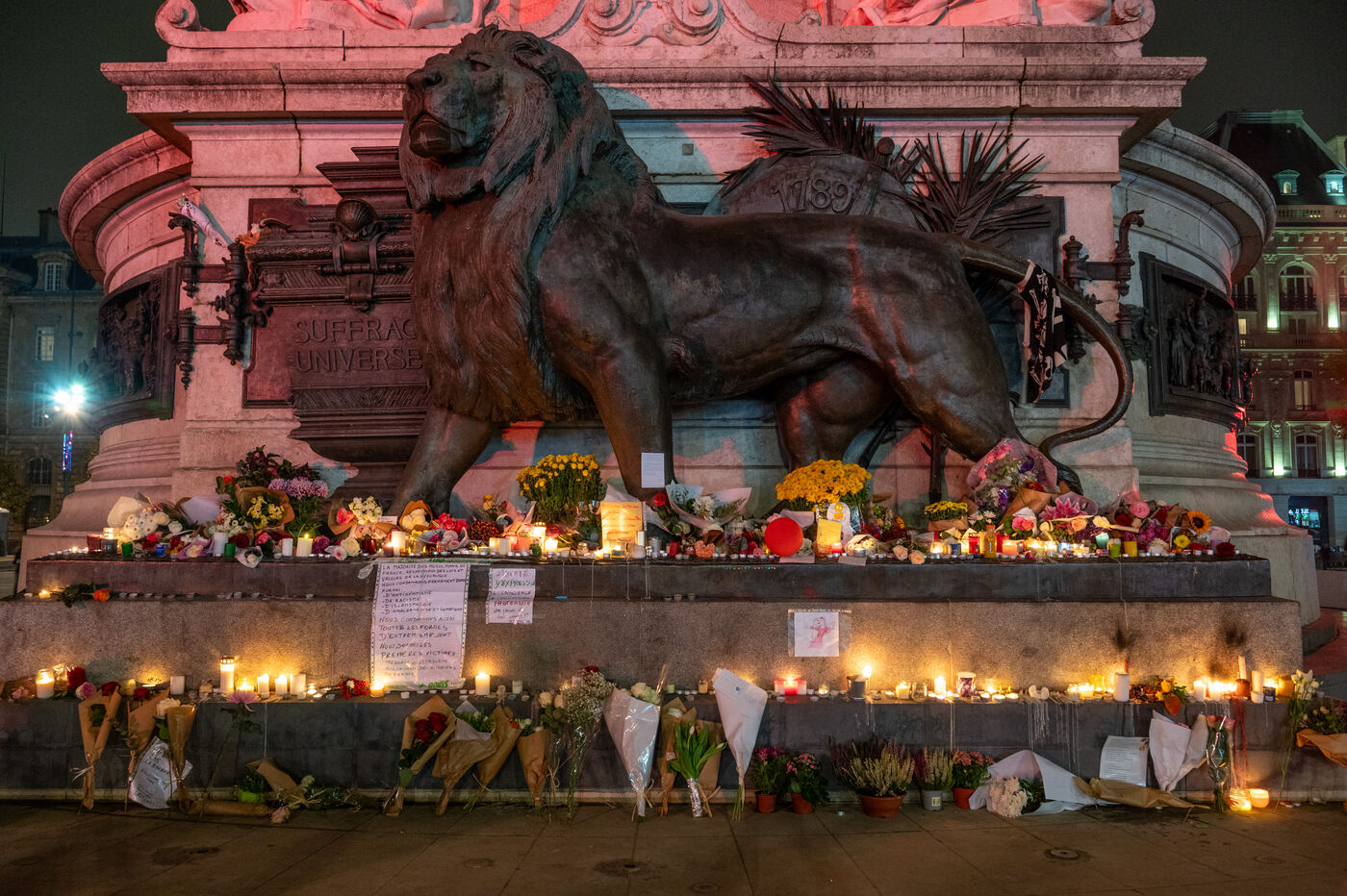 Fleurs et bougies, messages d'amour et d'amitié, commémorations spontanées et manifestations officielles se déroulent 10 ans après les attentats terroristes meurtrier de 2015 dans plusieurs lieux symboliques de la ville de Paris, dont la Place de la République, à proximité de la Mairie de Paris avec l'inauguration d'un monument pour toutes les victimes ou encore sur les différents sites touchés mortellement dans la capitale.