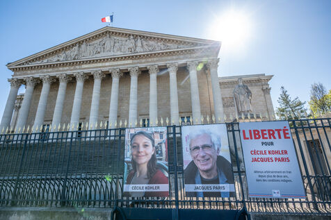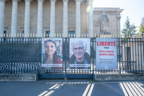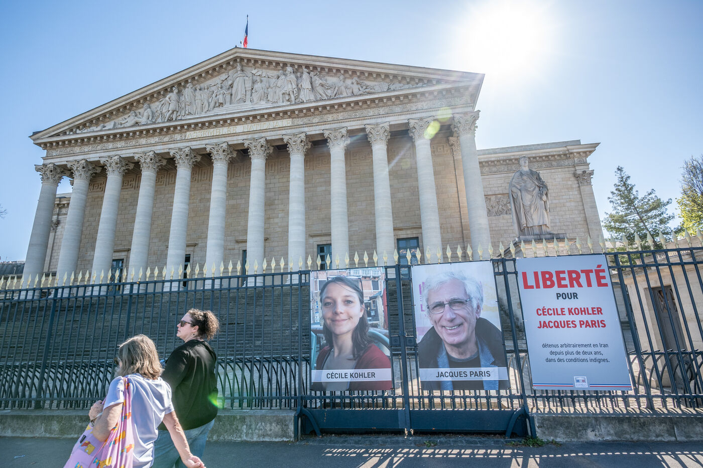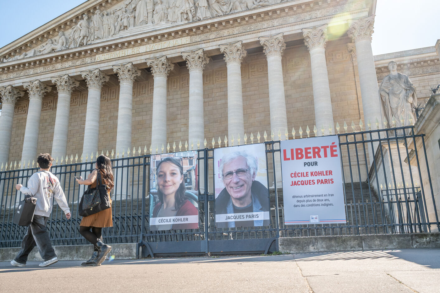 The portraits of French hostages Cecile Kohler and Jacques Paris remained on the railings of the National Assembly on the day of their return to Paris on Wednesday, April 8, 2026. The portraits of the two hostages were shown to the public during their captivity in Iran with a poster bearing the slogan FREEDOM FOR CECILE KOHLER JACQUES PARIS arbitrarily detained in Iran for more than two years in inhumane conditions.