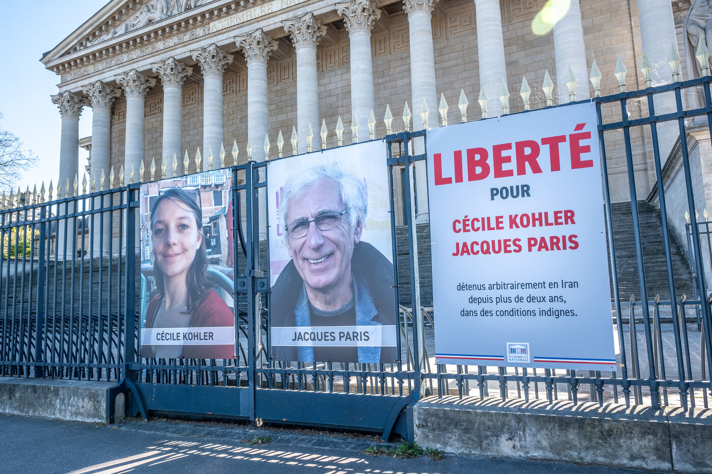 Les portraits des otages français Cecile Kohler et Jacques Paris demeuraient sur les grilles de l’Assemblée nationale le jour de leur retour a Paris le mercredi 8 avril 2026. Les portraits des deux otages ont été montrées au public pendant la captivité en Iran avec une affiche portant le slogan LIBERTE POUR CECILE KOHLER JACQUES PARIS détenus arbitrairement en Iran depuis plus de deux ans dans des conditions indignes.