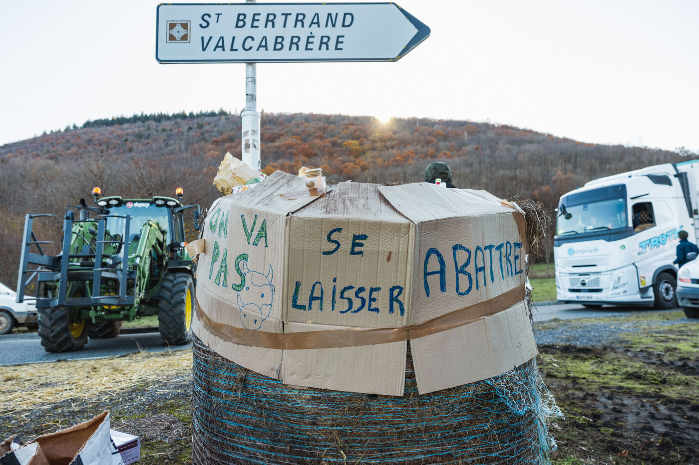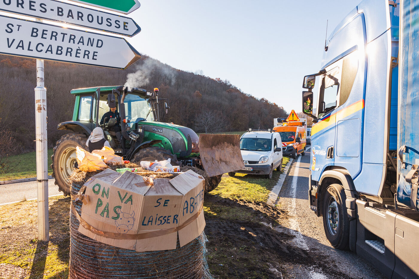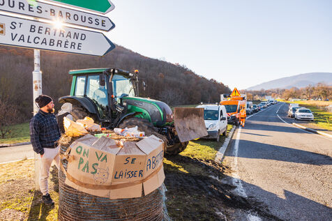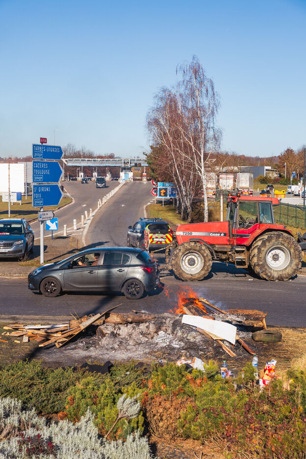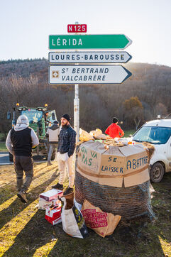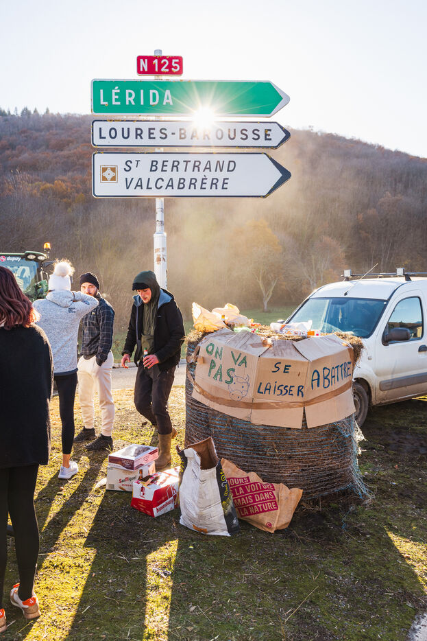 Des agriculteurs manifestent sur les ronds-points du Comminges pour protester contre les décisions d'abattage des troupeaux de bovins dans un contexte de propagation de la dermatose nodulaire contagieuse (DNC). Dans le sud-ouest de la France, le 13 décembre 2025.