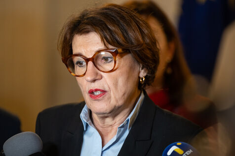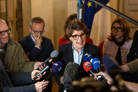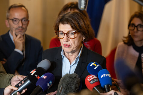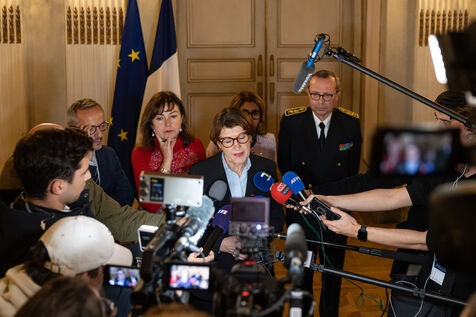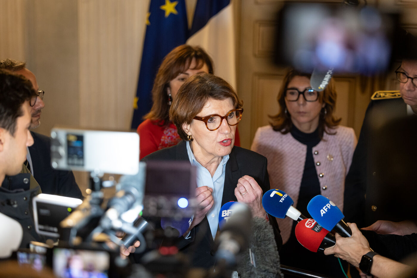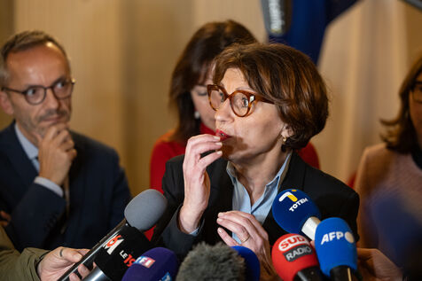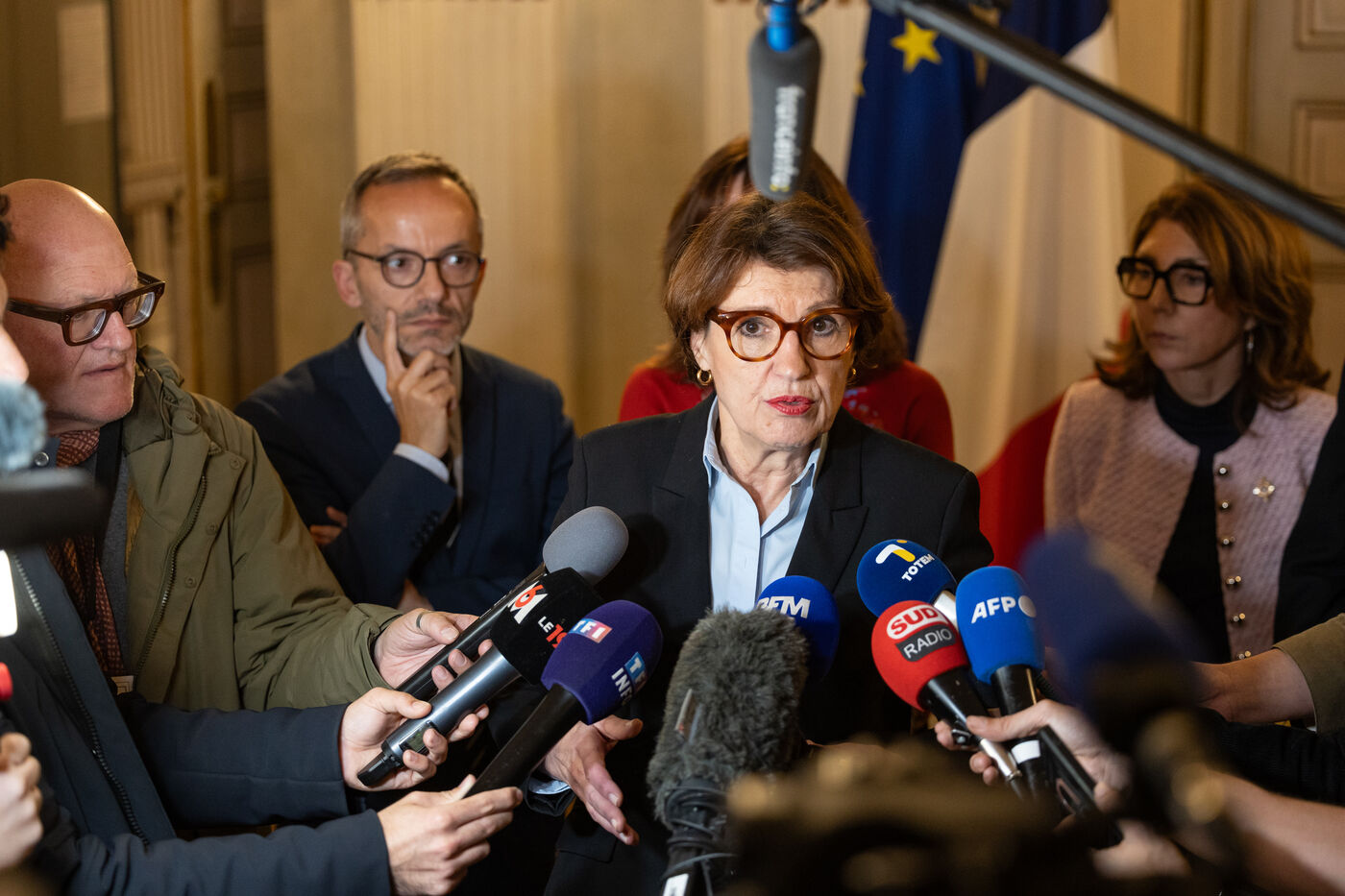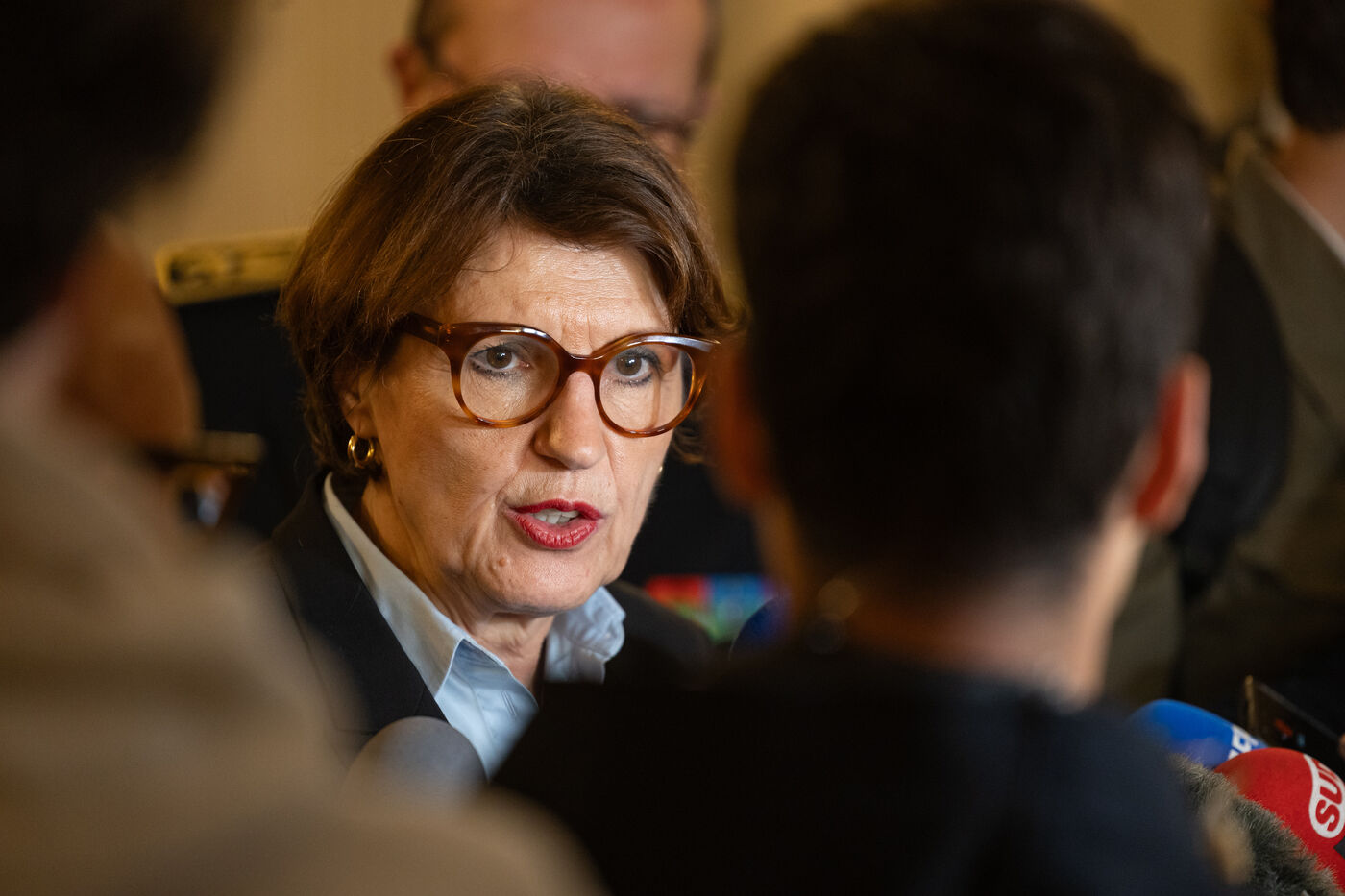Micro-tendu avec la presse pour Annie Genevard, Ministre de l'Agriculture. Dans un contexte tendu avec les agriculteurs français touchés par un virus de Dermatose Nodulaire Contagieuse (DNC).