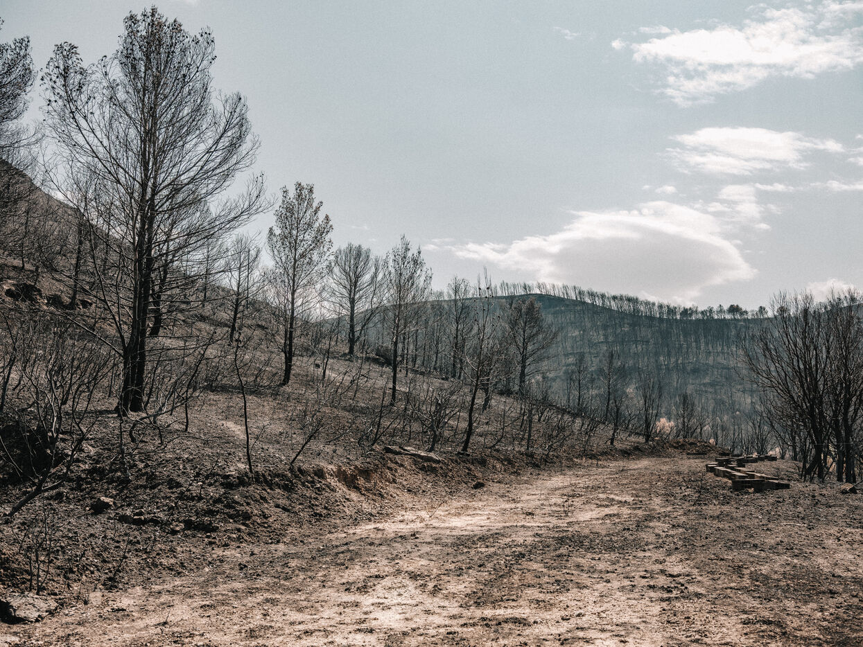 Paysages du Massif des Corbières après l'incendie d'août 2025. 17 000 hectares ont été brulés en quelques jours ce qui fait de cet incendie le plus important en France depuis 80 ans.