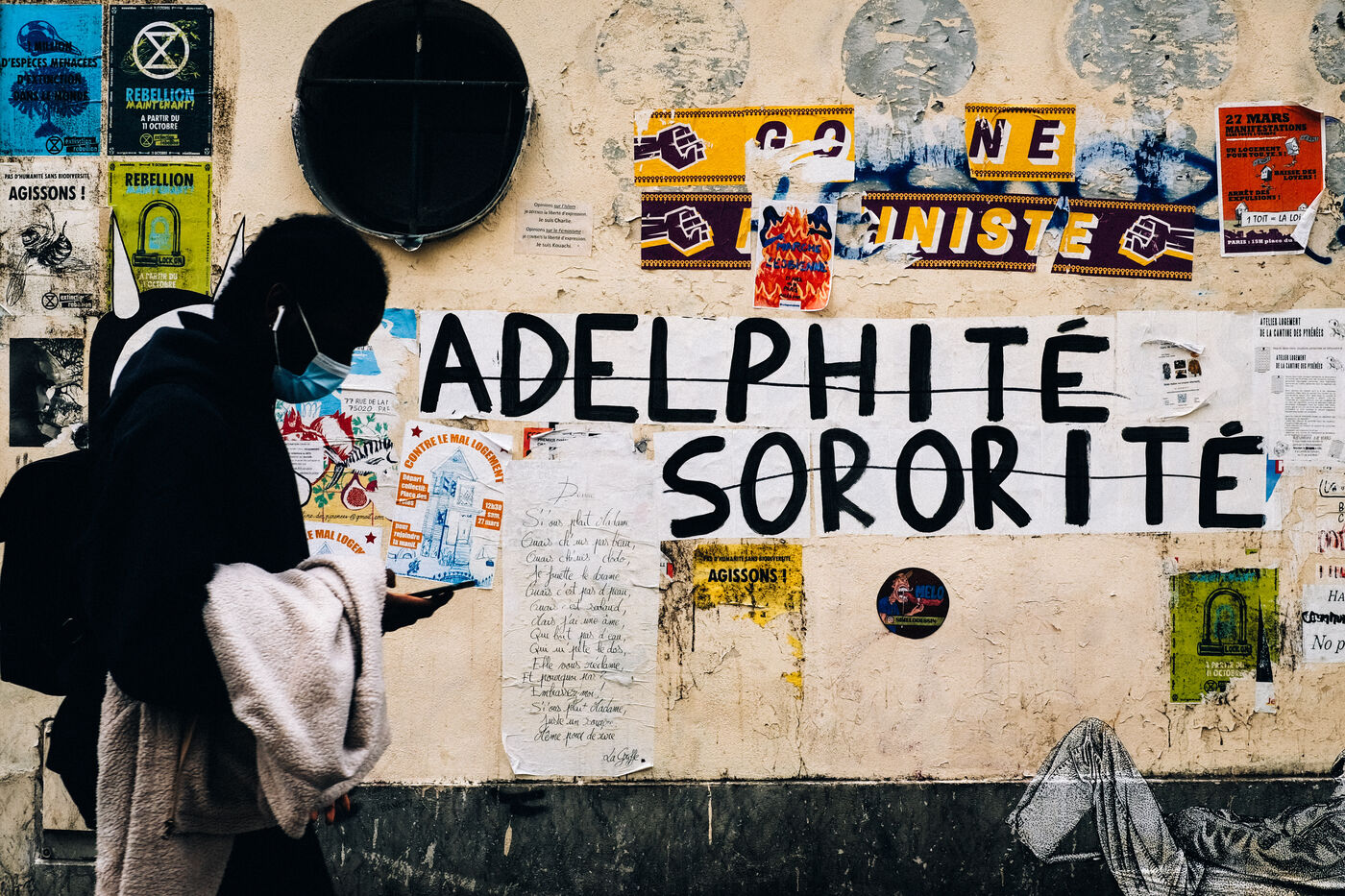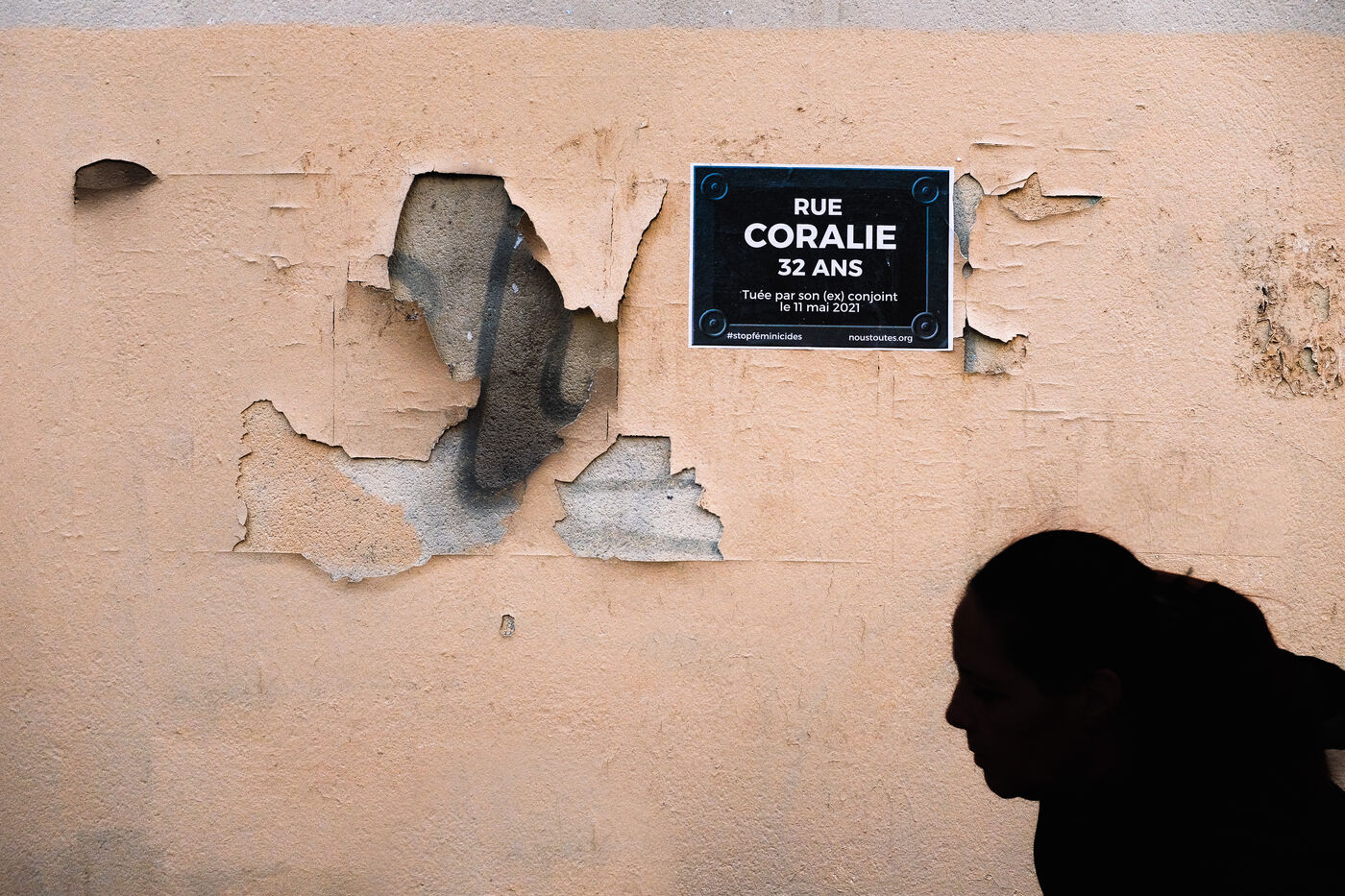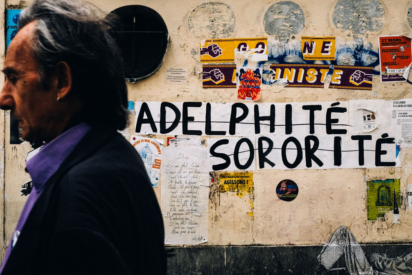 Since 2019, a feminist wheatpaste movement has covered the walls of French cities with messages in bold black capitals on white paper. This series documents their presence across Paris, through changing seasons and neighborhoods. Denunciations of femicide, memorial plaques bearing victims’ names, demands for action against gender-based violence, calls for equal rights and solidarity: the inscriptions span a wide range of struggles. The dominant use of black and white heightens the graphic power of the painted letters. Anonymous silhouettes pass through the frame, a reminder that these words are addressed to everyone.