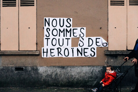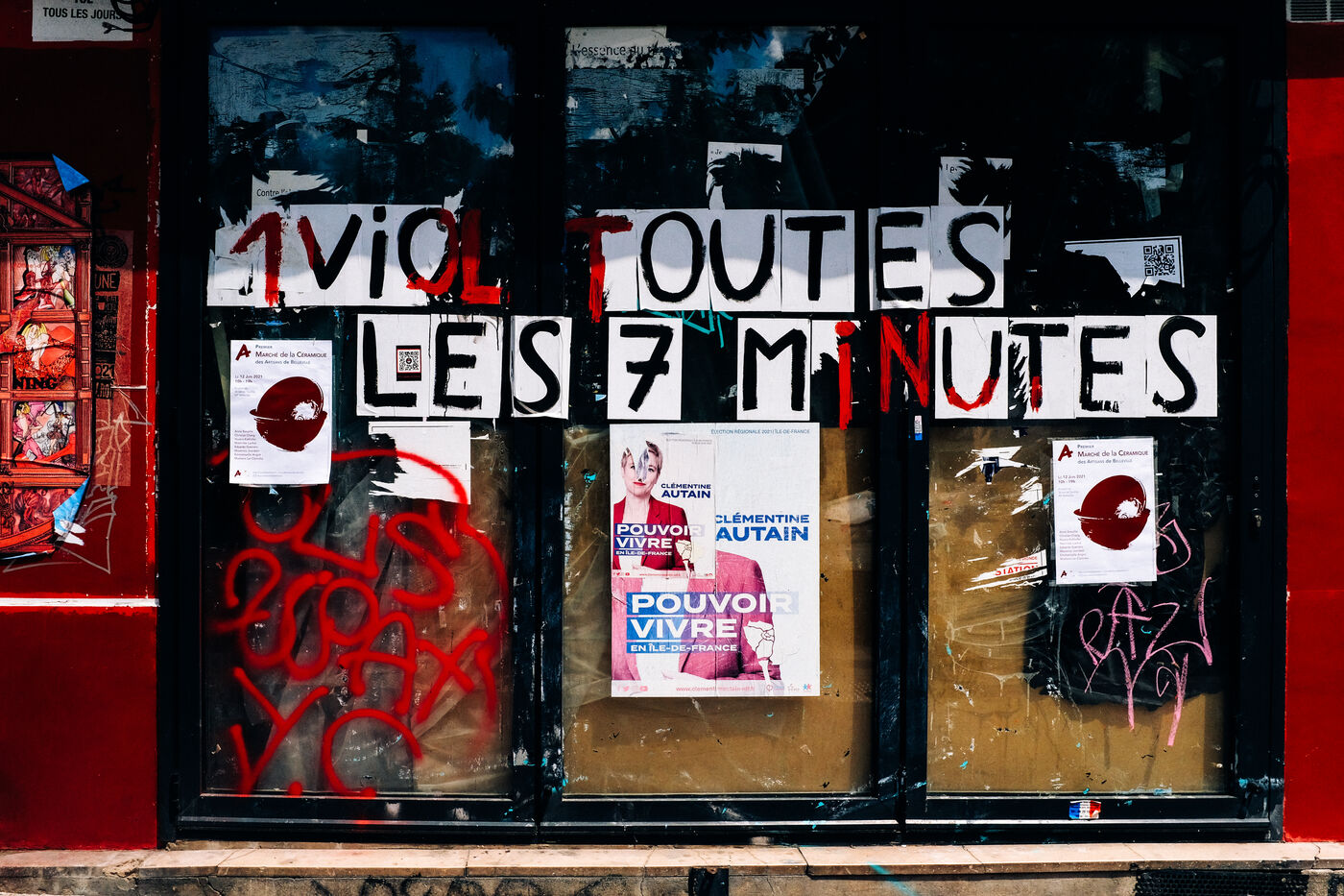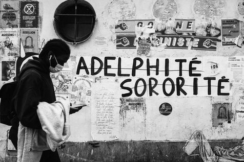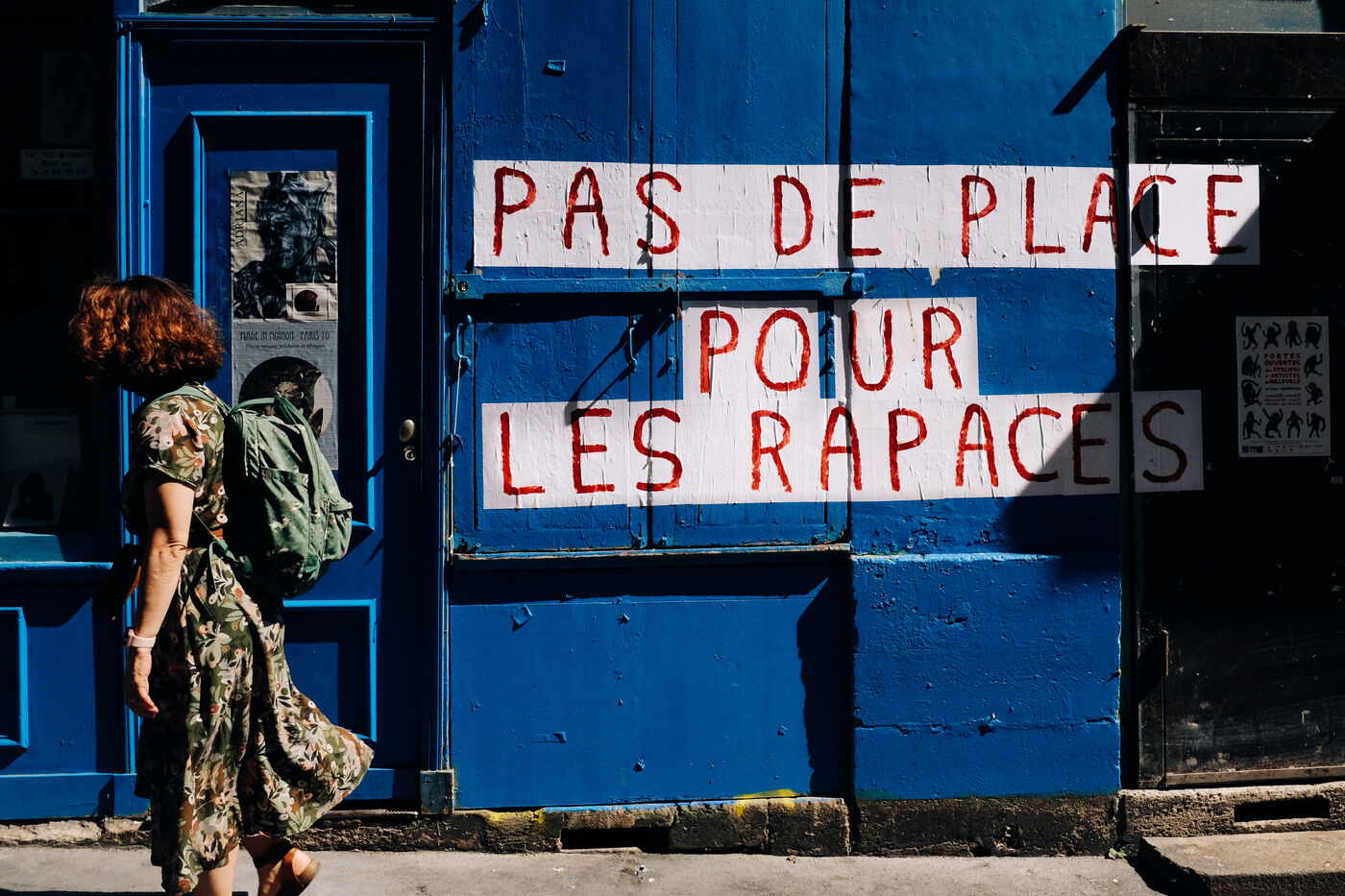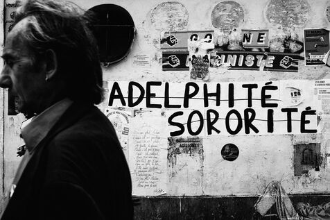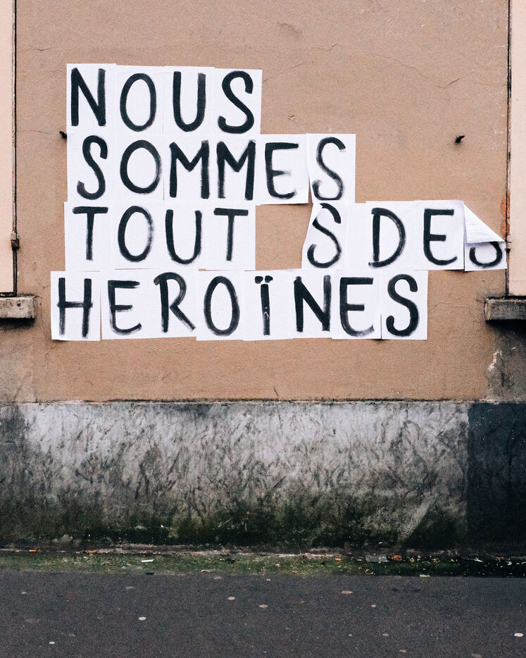 Since 2019, a feminist wheatpaste movement has covered the walls of French cities with messages in bold black capitals on white paper. This series documents their presence across Paris, through changing seasons and neighborhoods. Denunciations of femicide, memorial plaques bearing victims’ names, demands for action against gender-based violence, calls for equal rights and solidarity: the inscriptions span a wide range of struggles. The dominant use of black and white heightens the graphic power of the painted letters. Anonymous silhouettes pass through the frame, a reminder that these words are addressed to everyone.