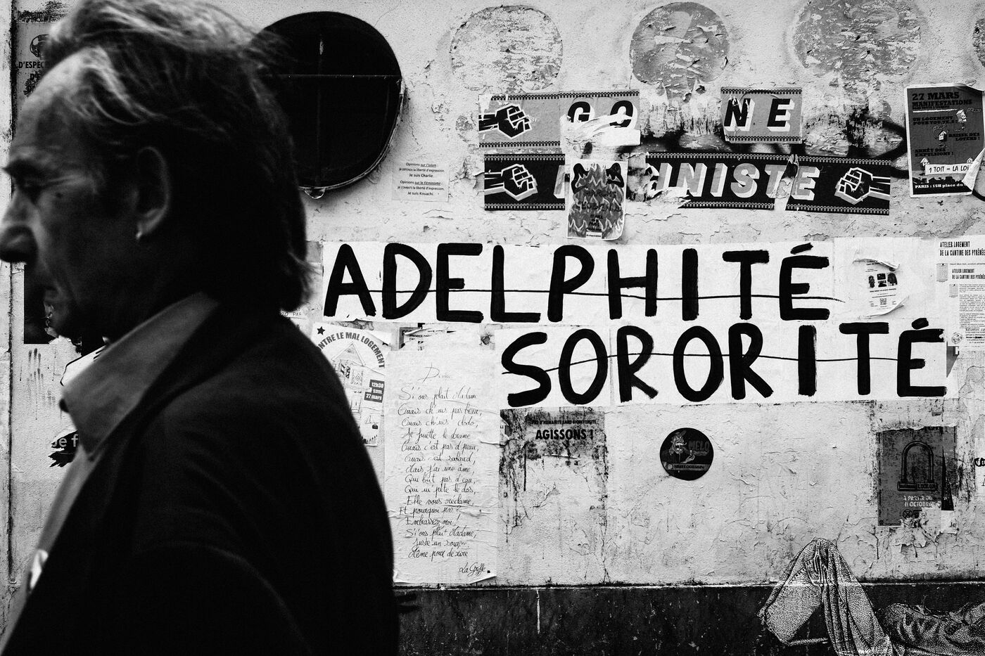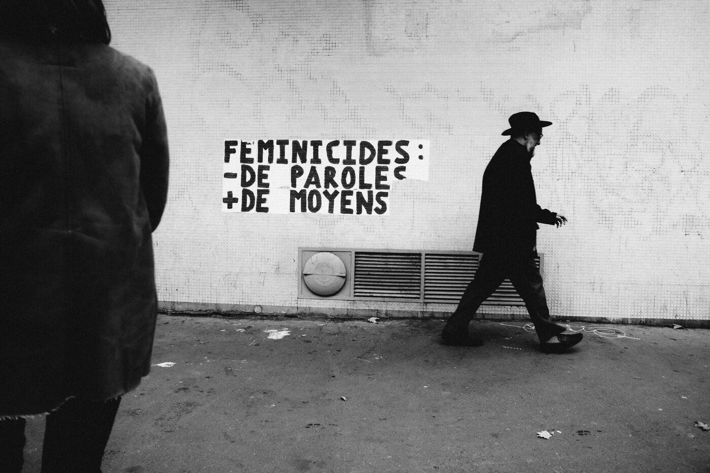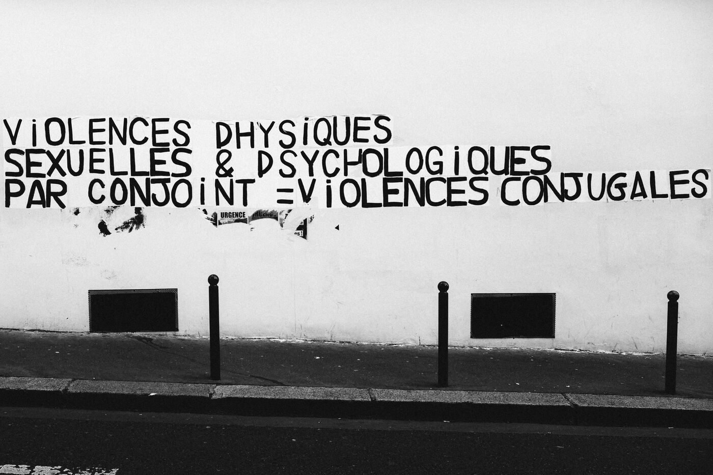Depuis 2019, un mouvement de collages féministes a recouvert les murs des villes françaises de messages en lettres capitales noires sur papier blanc. Cette série en documente la présence à Paris, au fil des mois et des quartiers. Dénonciations de féminicides, hommages nominatifs aux victimes, exigence de moyens contre les violences, revendications pour l’égalité des droits, appels à la solidarité : les inscriptions captées couvrent un large spectre de luttes. Le noir et blanc dominant renforce la puissance graphique des lettres peintes. Des silhouettes anonymes traversent le cadre, rappelant que ces mots s’adressent à chacun.