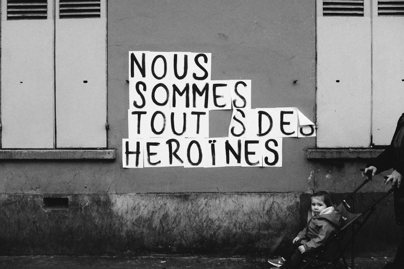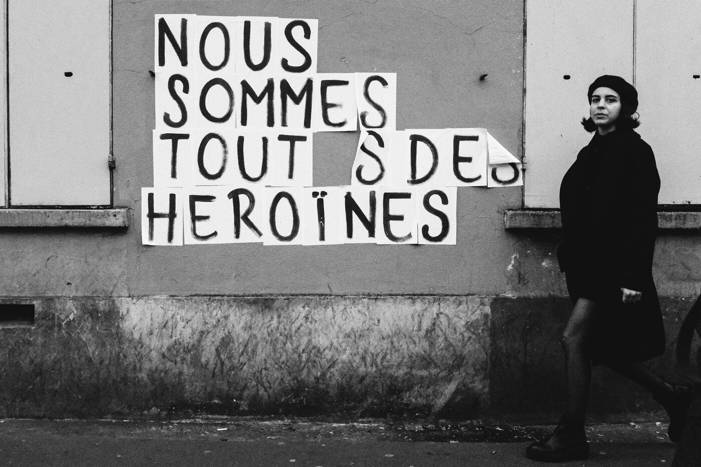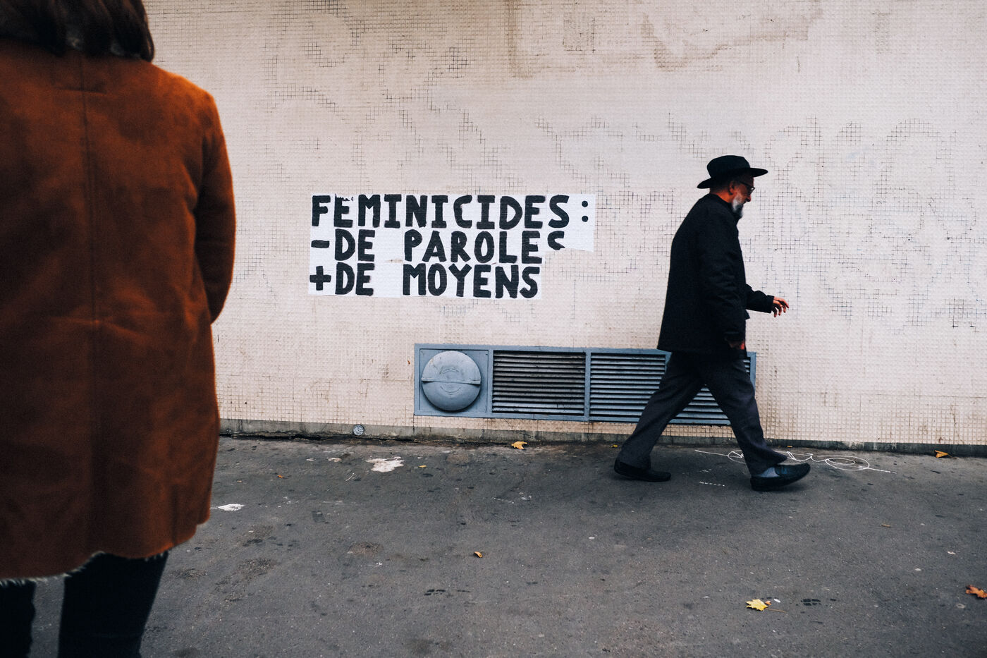 Depuis 2019, un mouvement de collages féministes a recouvert les murs des villes françaises de messages en lettres capitales noires sur papier blanc. Cette série en documente la présence à Paris, au fil des mois et des quartiers. Dénonciations de féminicides, hommages nominatifs aux victimes, exigence de moyens contre les violences, revendications pour l’égalité des droits, appels à la solidarité : les inscriptions captées couvrent un large spectre de luttes. Le noir et blanc dominant renforce la puissance graphique des lettres peintes. Des silhouettes anonymes traversent le cadre, rappelant que ces mots s’adressent à chacun.