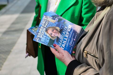Pau, 27 février 2026 - Margaux Taillefer, tête de liste du Rassemblement National est allée à la rencontre des palois en compagnie de plusieurs militants et membres de la liste « L’Espérance pour Pau » profitant de l’affluence générée par la braderie d’hiver de Pau.