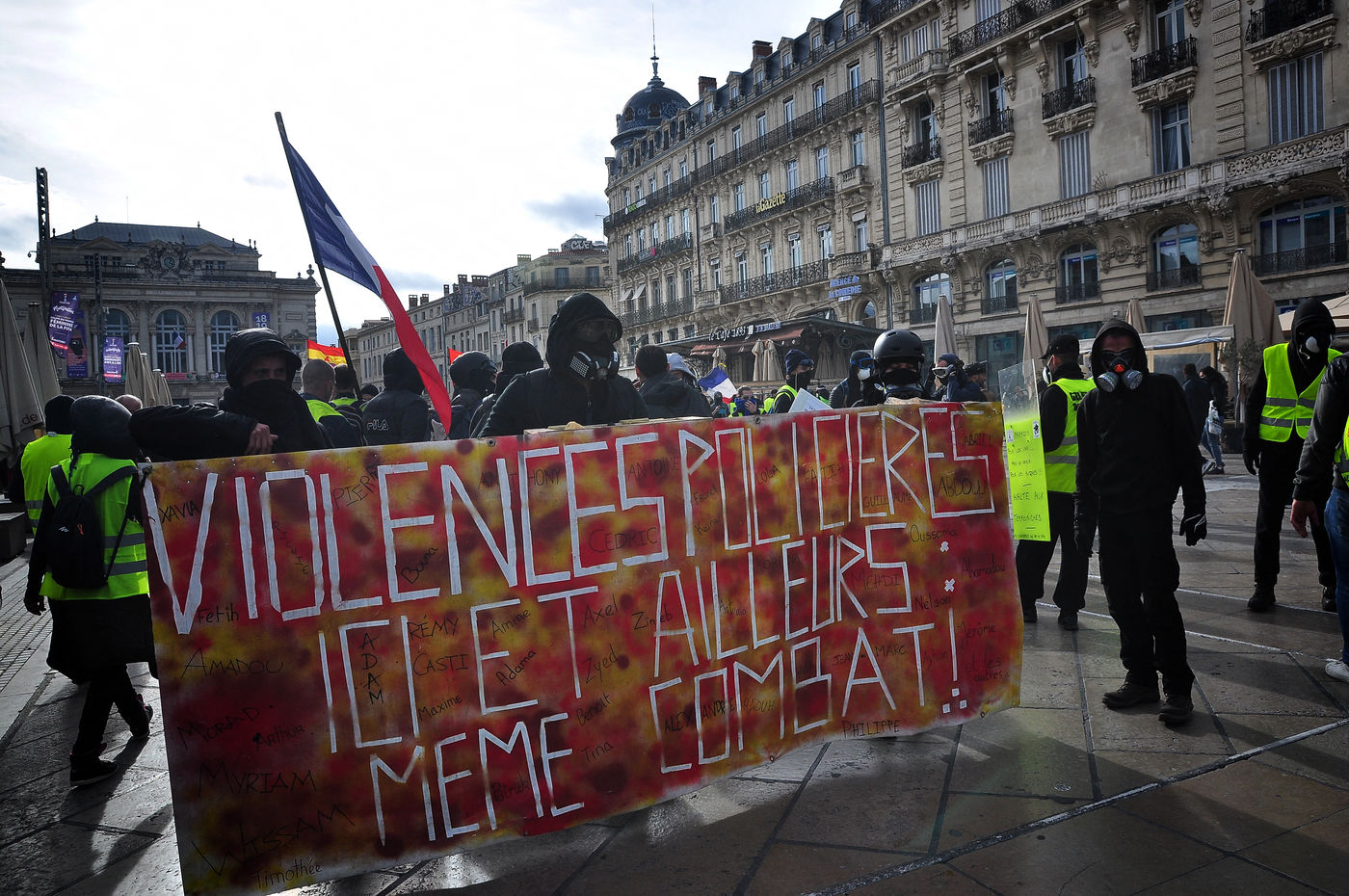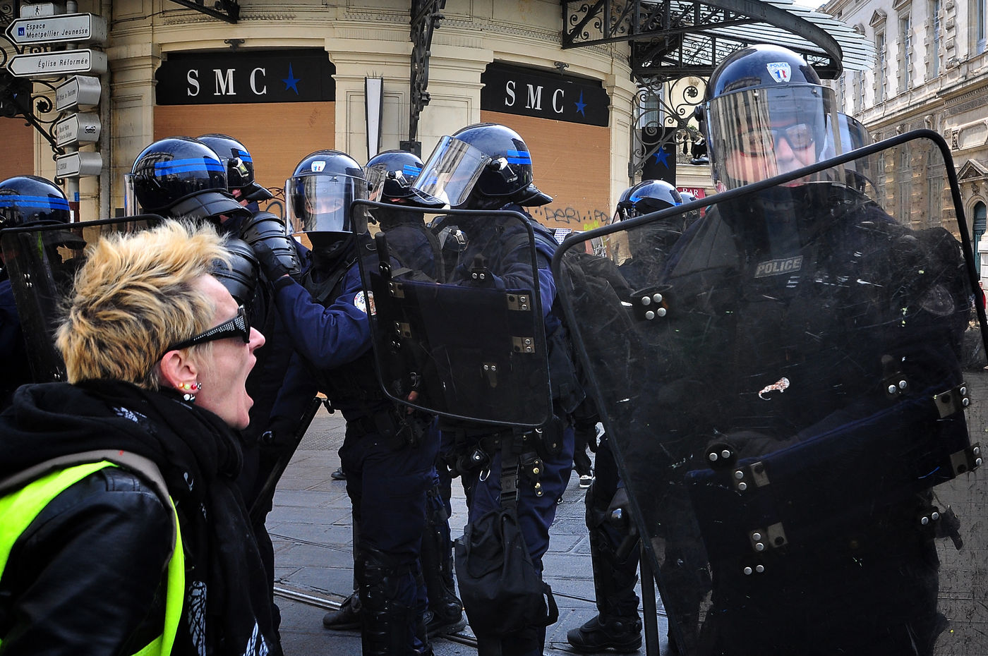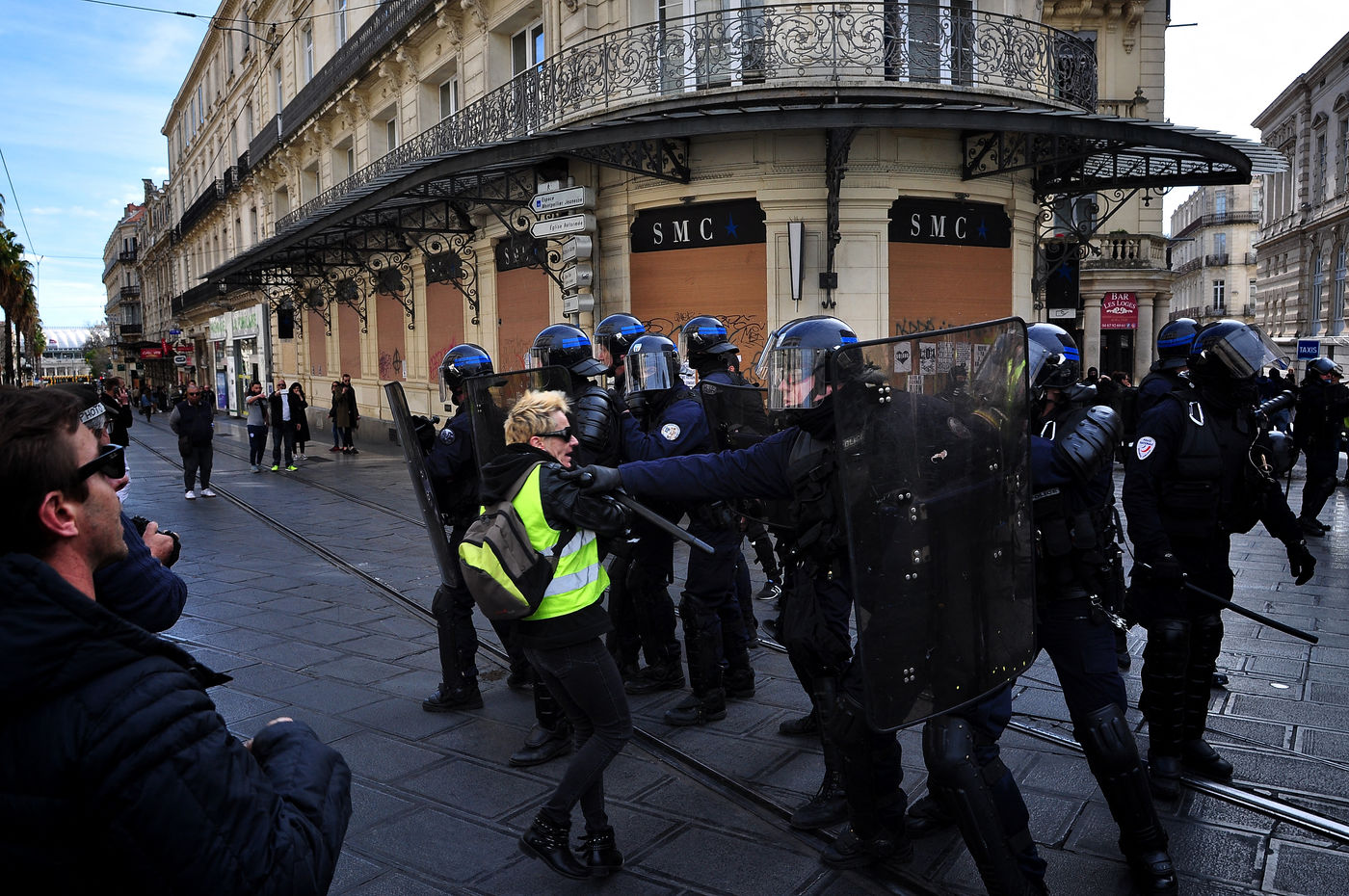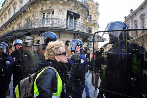 Montpellier, place de la comédie. Dès le début d'après-midi, on est dans le dur. Vers 14h30, alors que le défilé sapprête à partir, la brigade anti-criminalité fait une inhabituelle apparition à cette heure, ce qui provoque la colère des gilets jaunes, qui les chassent à coup d'invectives. La suite est, elle, habituelle, entre défilé pacifique, casse et répression policière qui s'accentue au fil des manifestations.