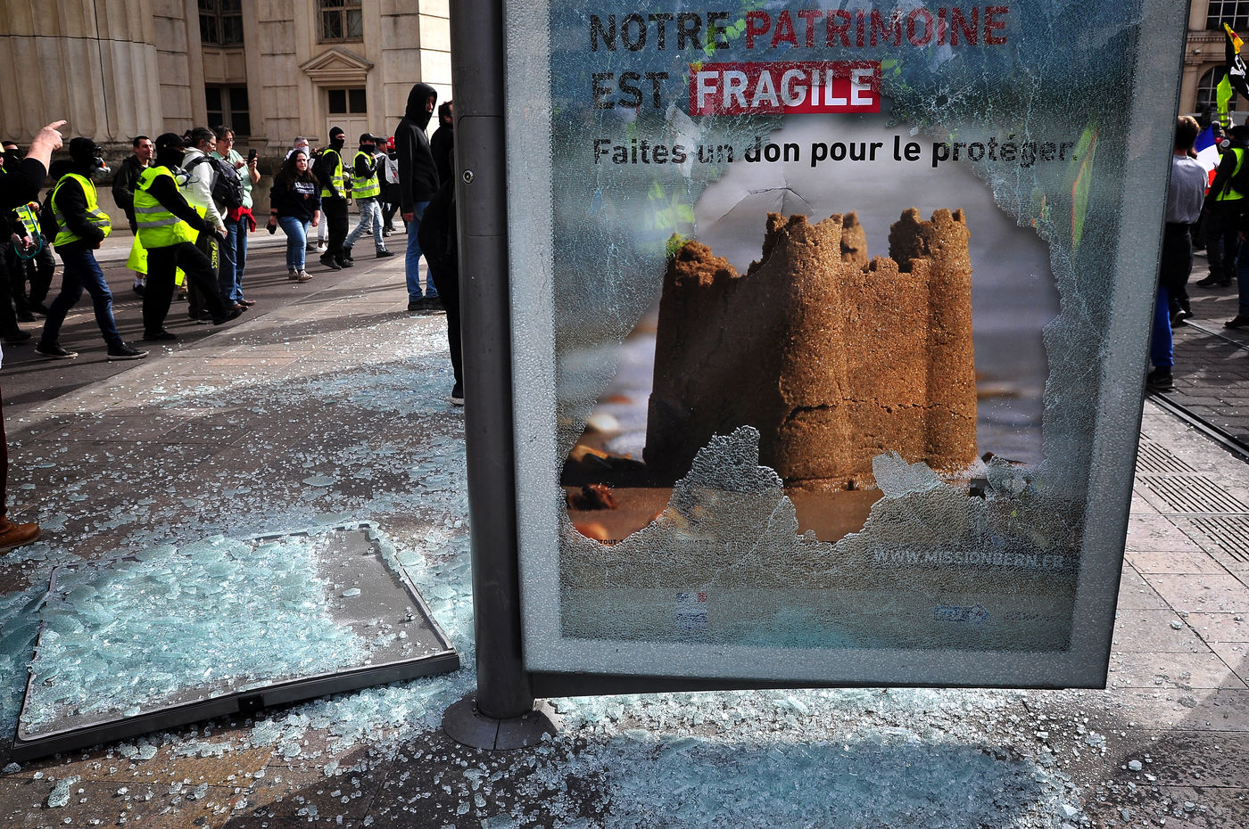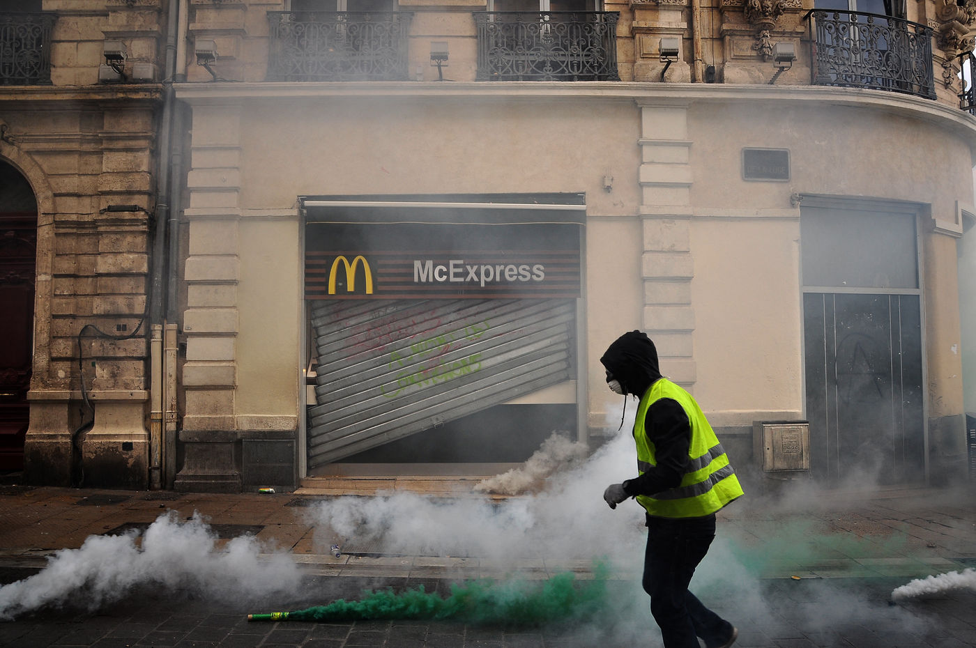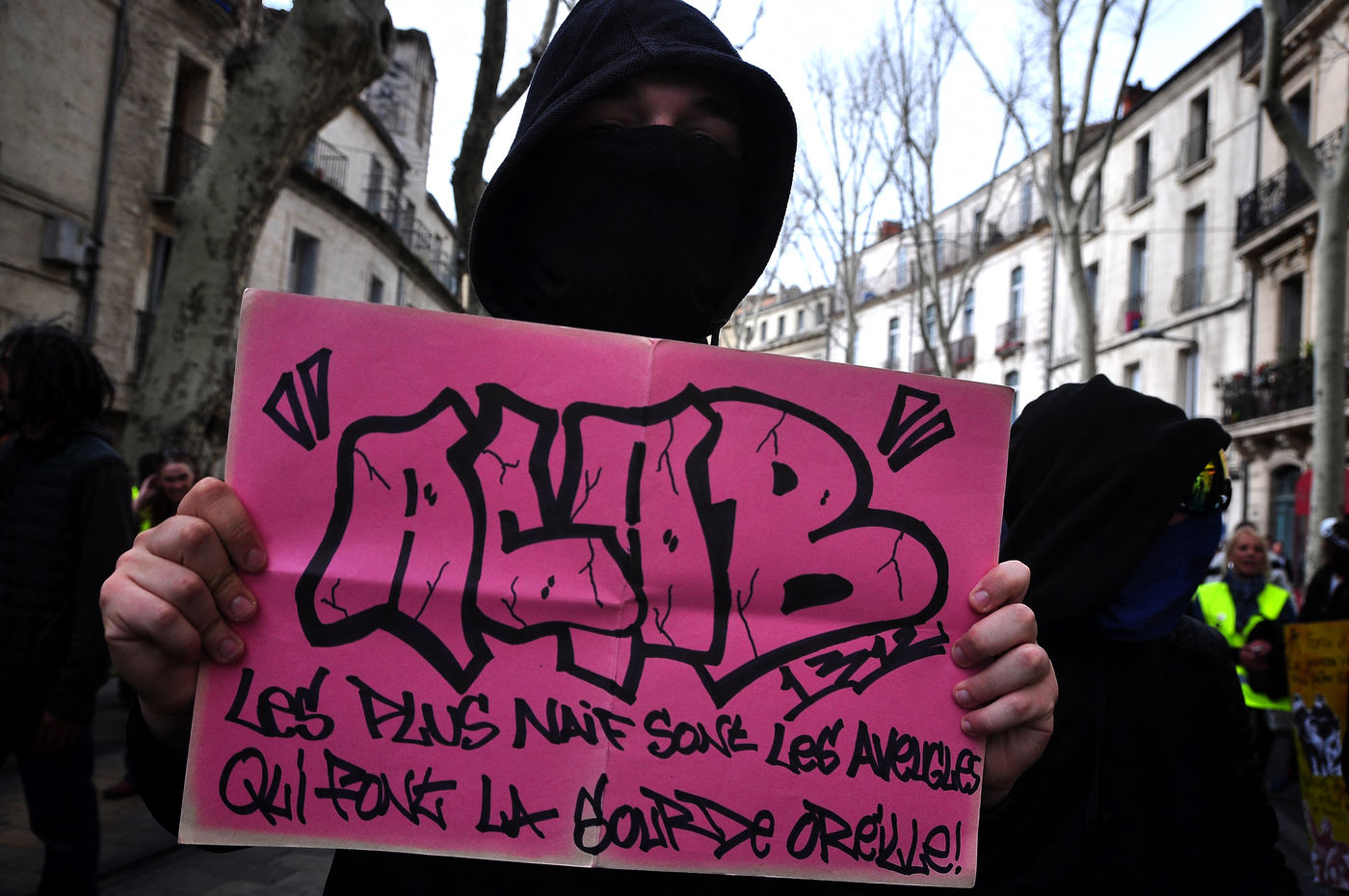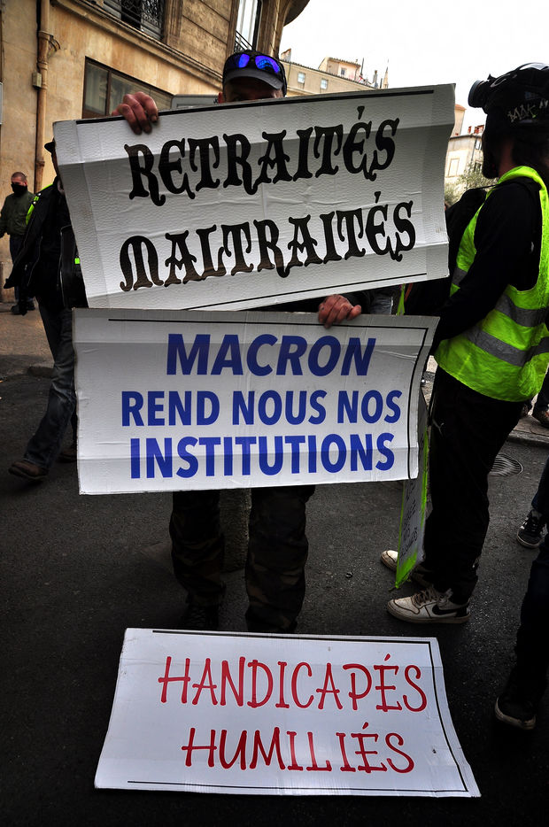 Montpellier, place de la comédie. Dès le début d'après-midi, on est dans le dur. Vers 14h30, alors que le défilé sapprête à partir, la brigade anti-criminalité fait une inhabituelle apparition à cette heure, ce qui provoque la colère des gilets jaunes, qui les chassent à coup d'invectives. La suite est, elle, habituelle, entre défilé pacifique, casse et répression policière qui s'accentue au fil des manifestations.
