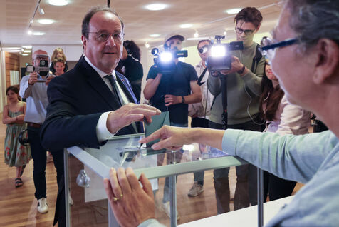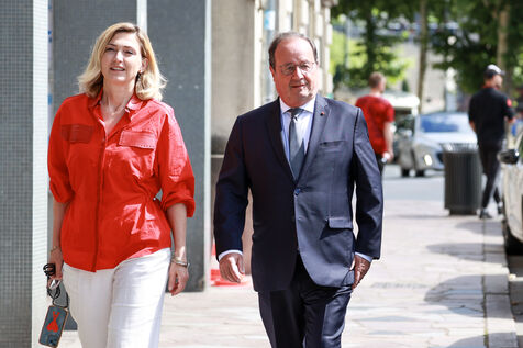 Former French President Francois Hollande arrives with his wife French actress Julie Gayet to vote in the second round of the early parliamentary elections at a polling station in Tulle, Central France, on July 7, 2024.