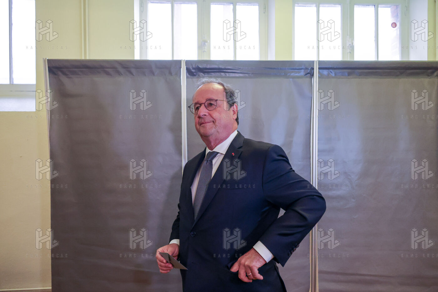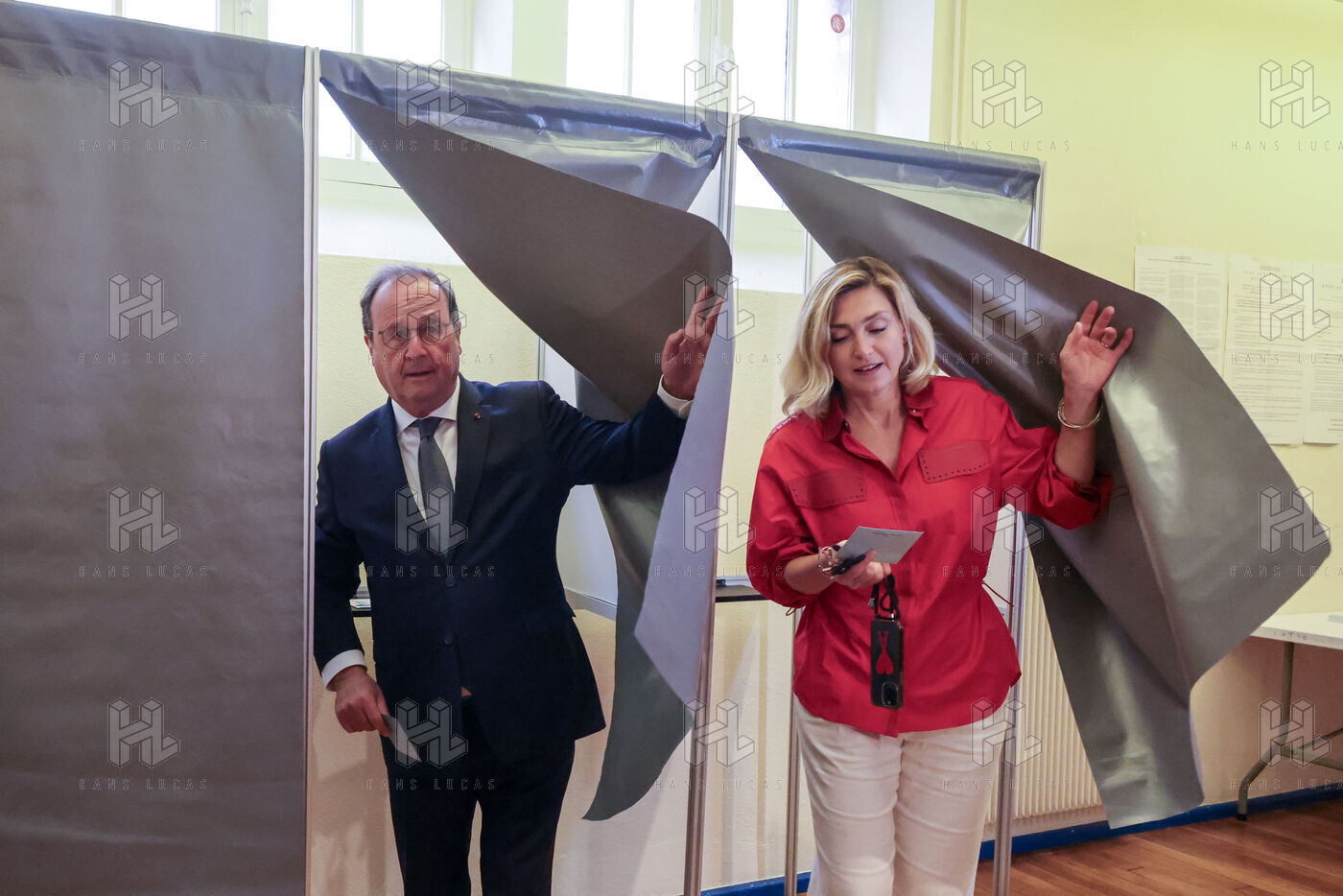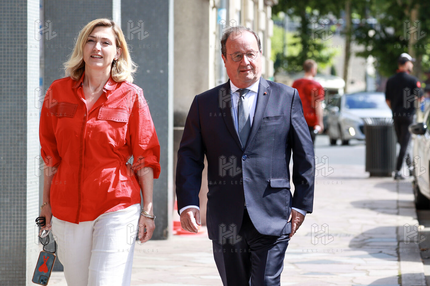 L ancien president français François Hollande arrive avec son epouse, l actrice francaise Julie Gayet pour voter au second tour des elections legislatives anticipees dans un bureau de vote a Tulle le 7 juillet 2024.