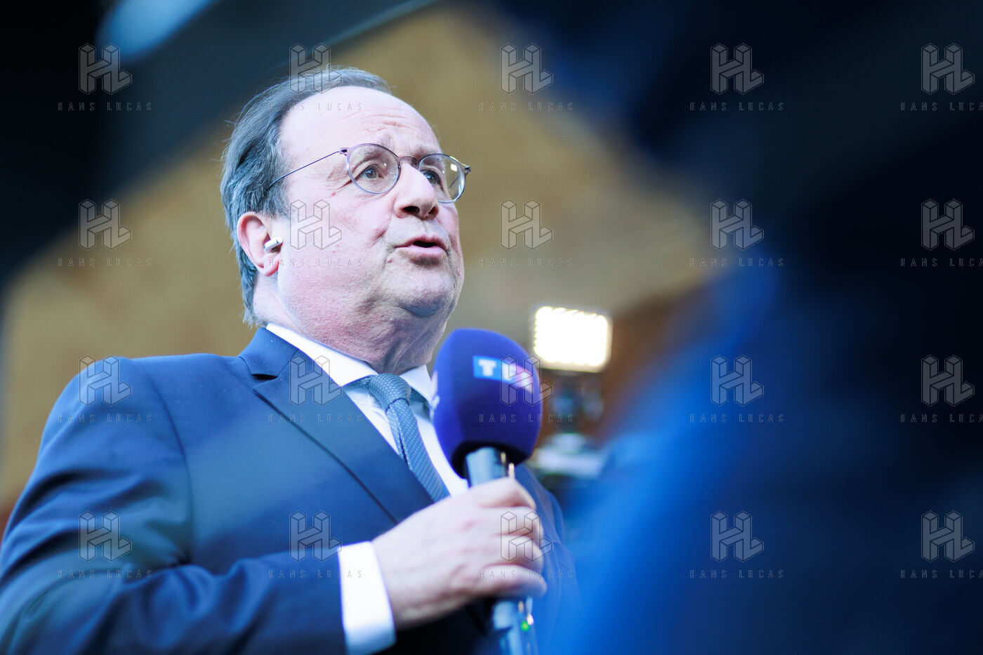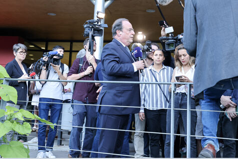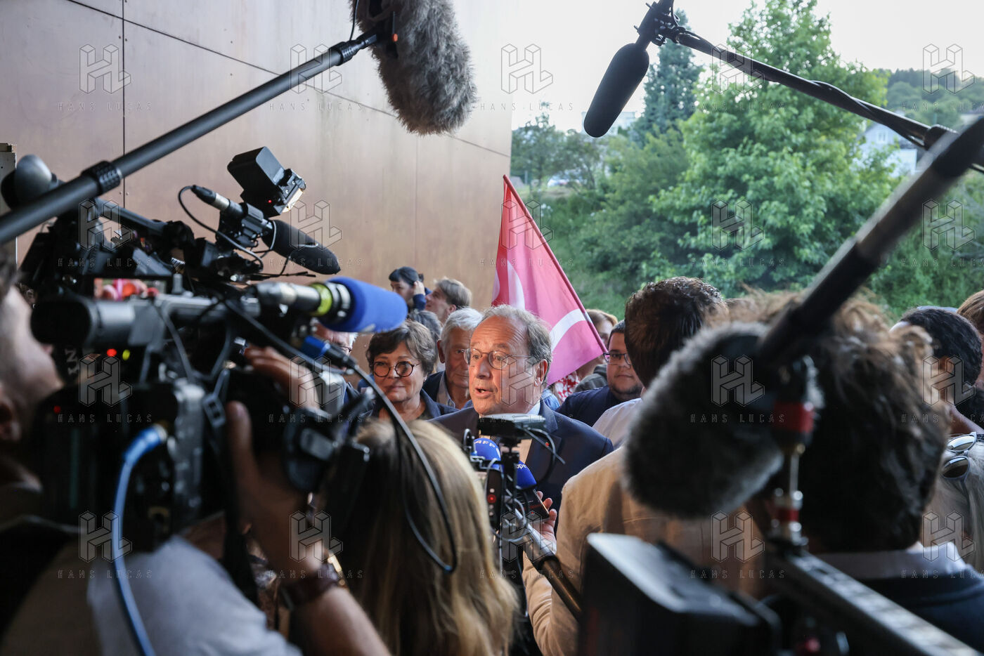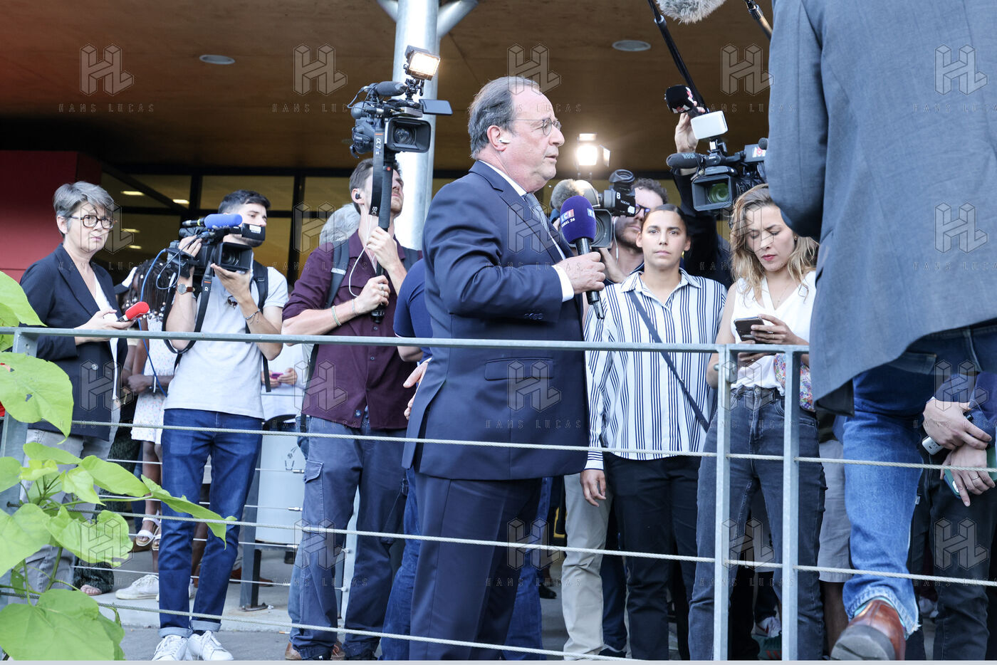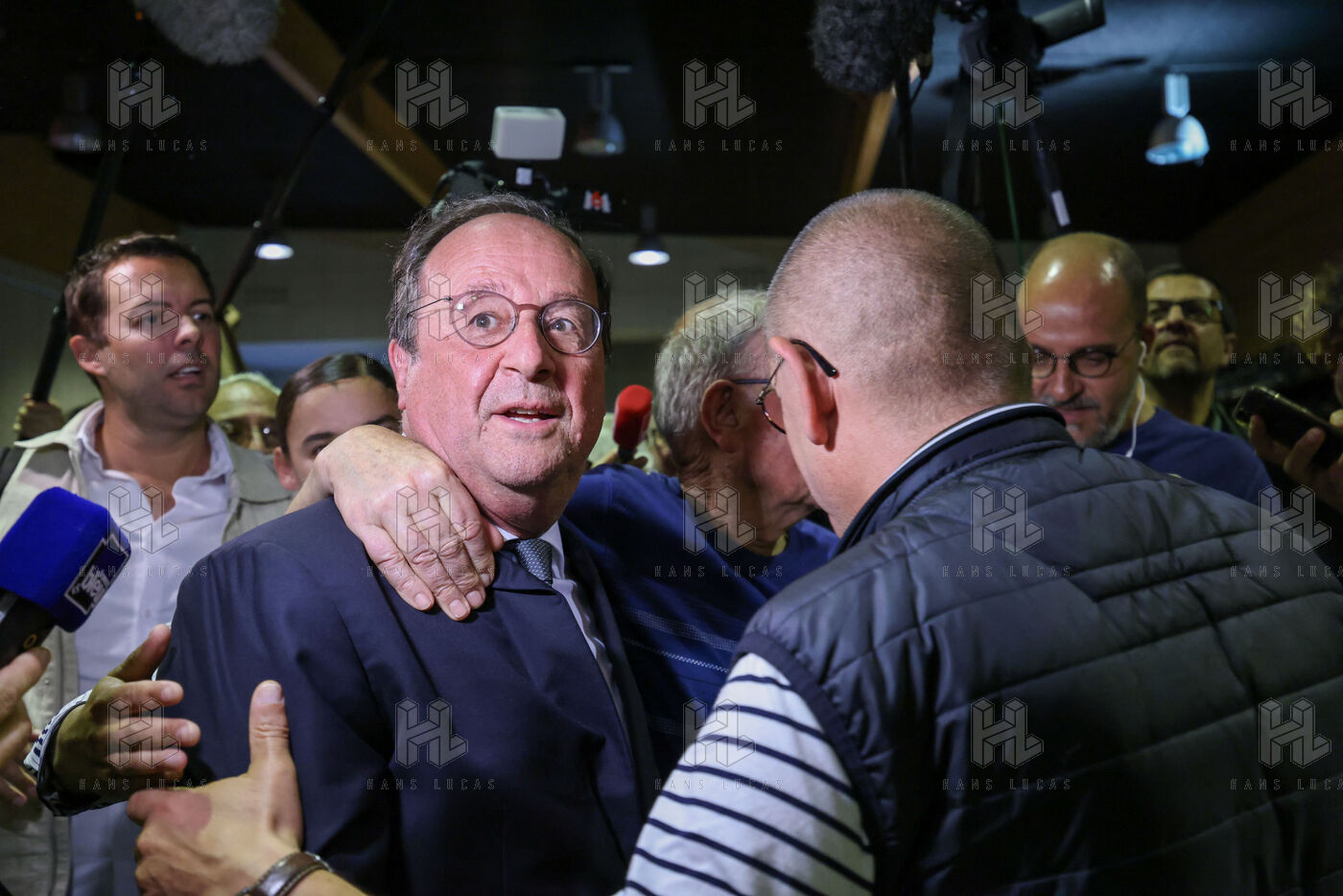 François Hollande, ancien president français, nouvellement elu depute, prononce un discours lors d une soiree electorale suivant les premiers resultats du second tour des elections legislatives francaises a Tulle, le 7 juillet 2024.