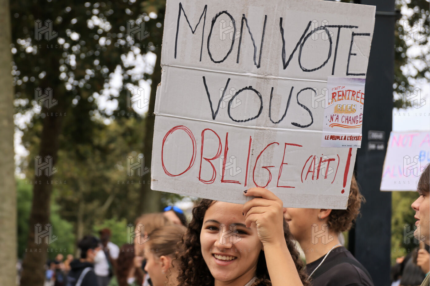 Rassemblement et manifestation a l appel des syndicats et des partis de gauche contre la nomination de Michel Barnier au poste de premier ministre. Nantes, le 7 septembre 2024.