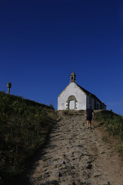 Des touristes visite le site de la chapelle au sommet du tumulus Saint Michel, site classe monument historique. Carnac le 15 juillet 2025.
