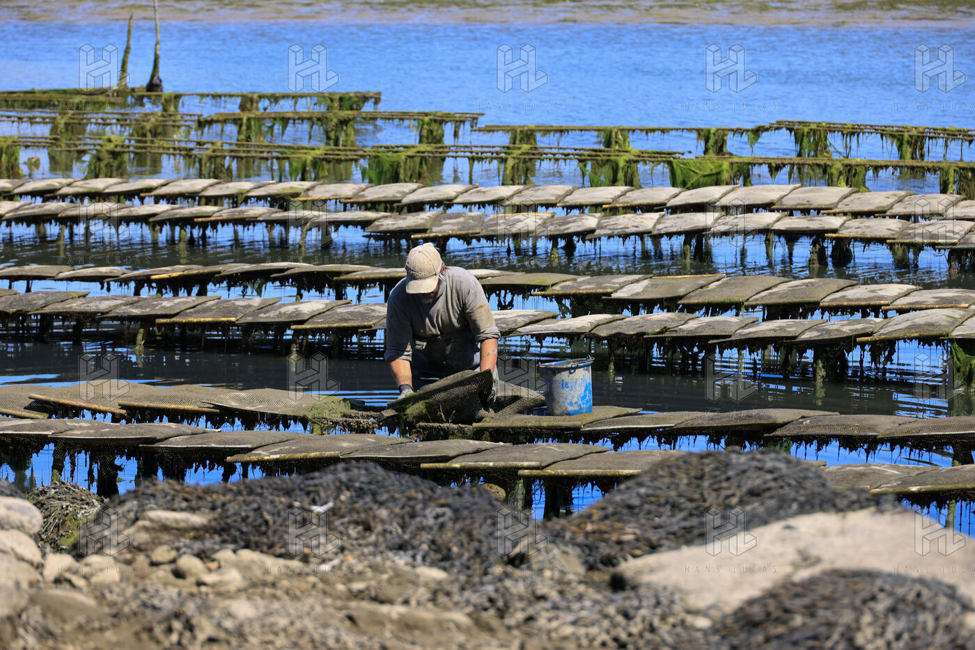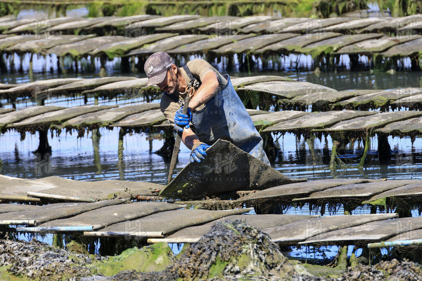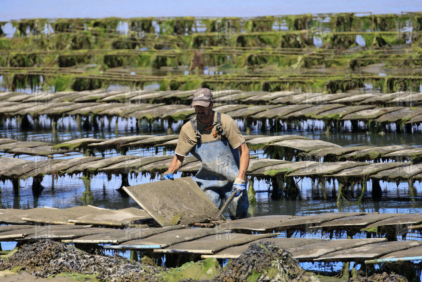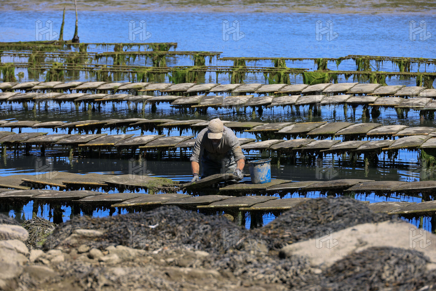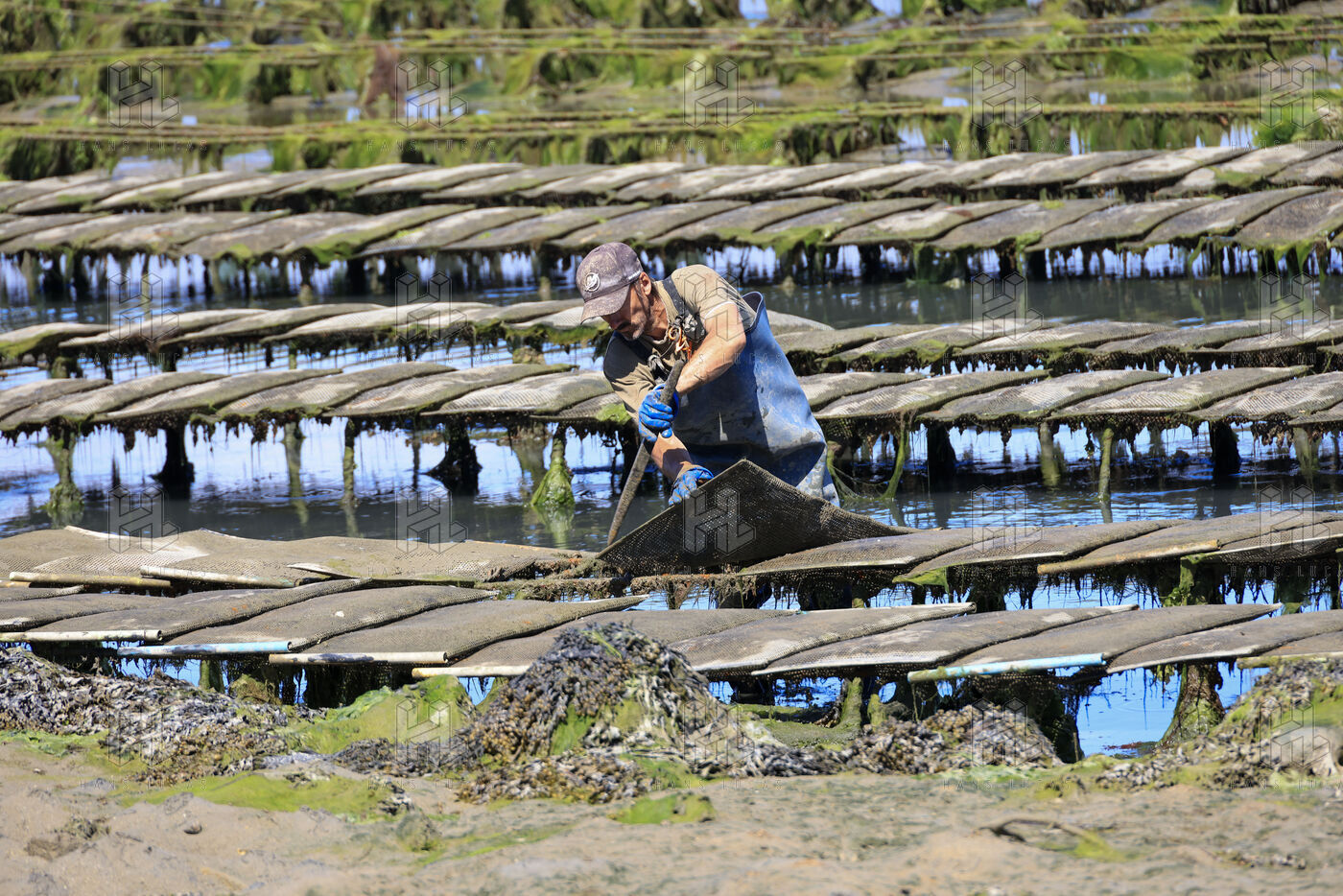 Un ostreiculteur tourne les sacs d huitres dans son parc a huitres a Saint Cado pres de Belz dans le Morbihan le 16 juillet 2025.