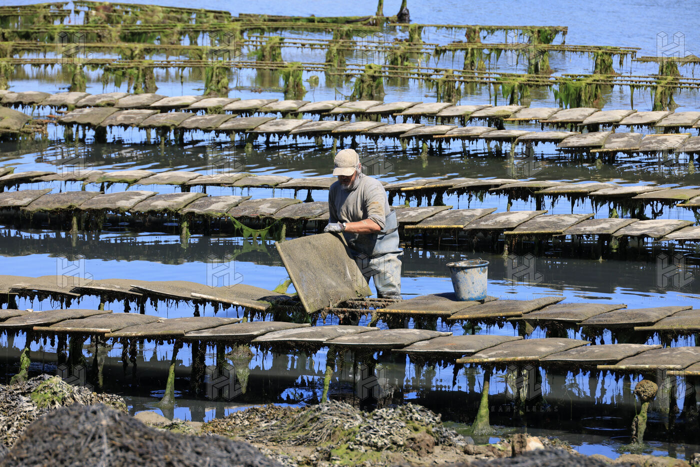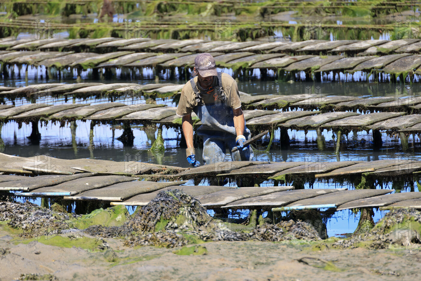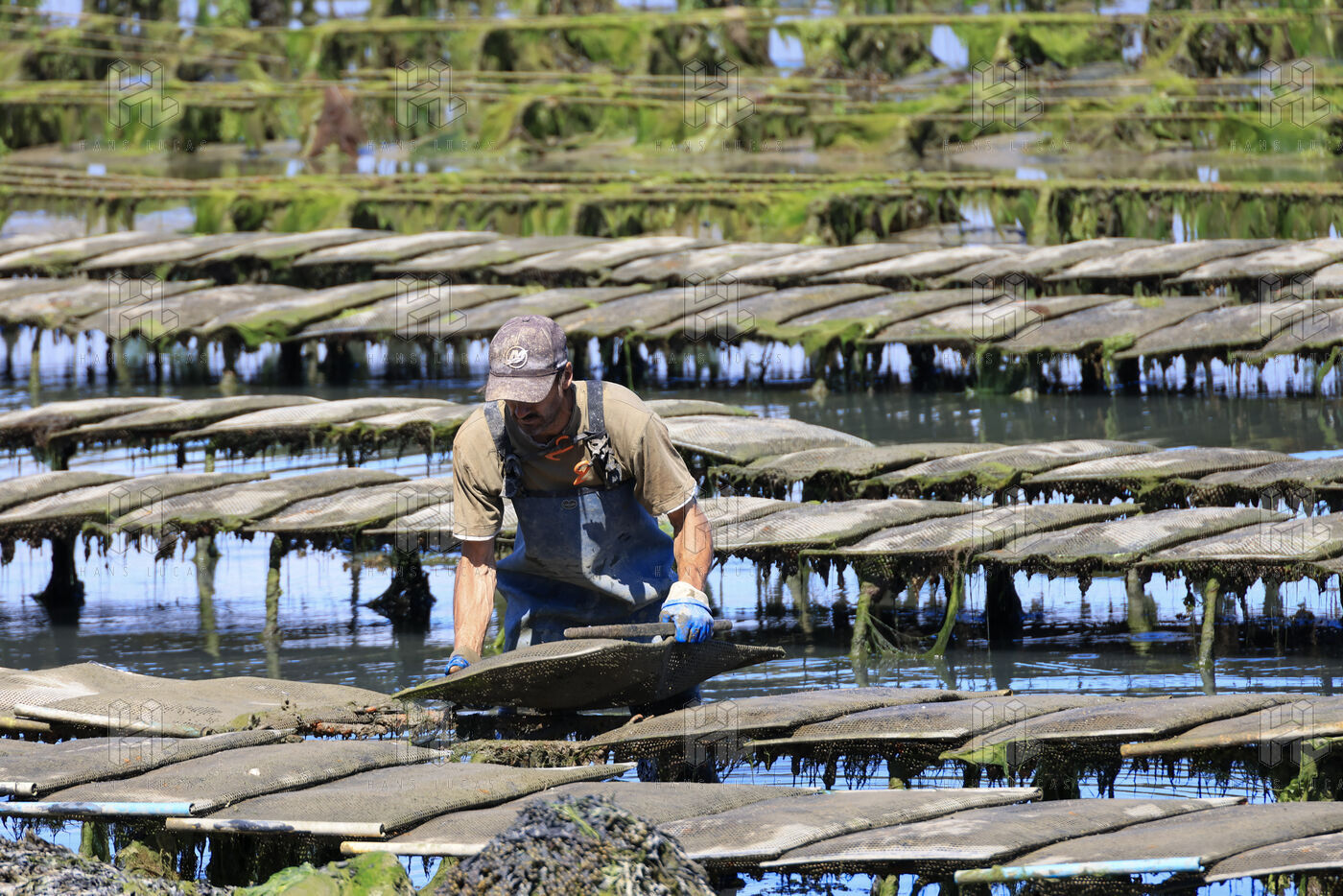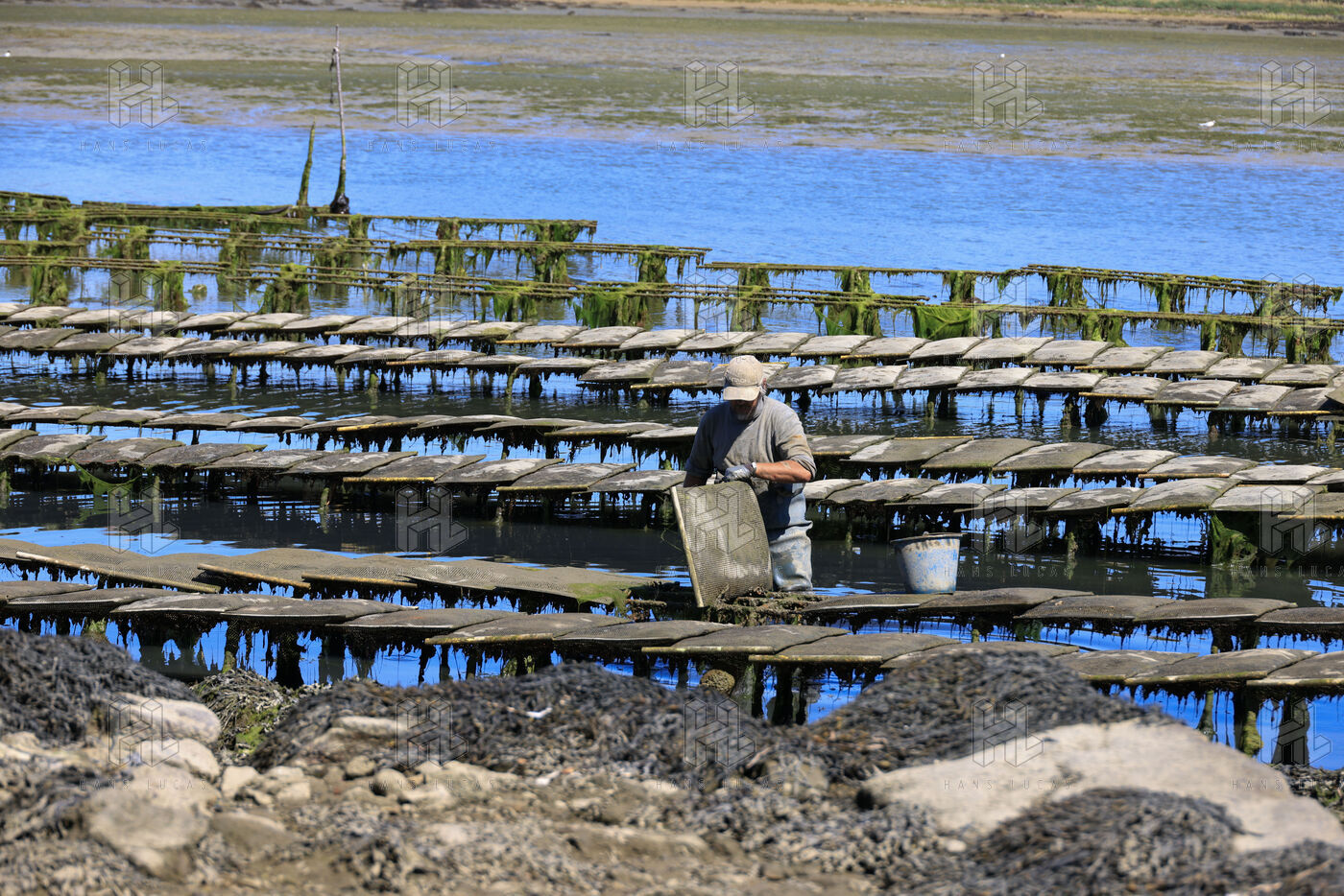 Un ostreiculteur tourne les sacs d huitres dans son parc a huitres a Saint Cado pres de Belz dans le Morbihan le 16 juillet 2025.