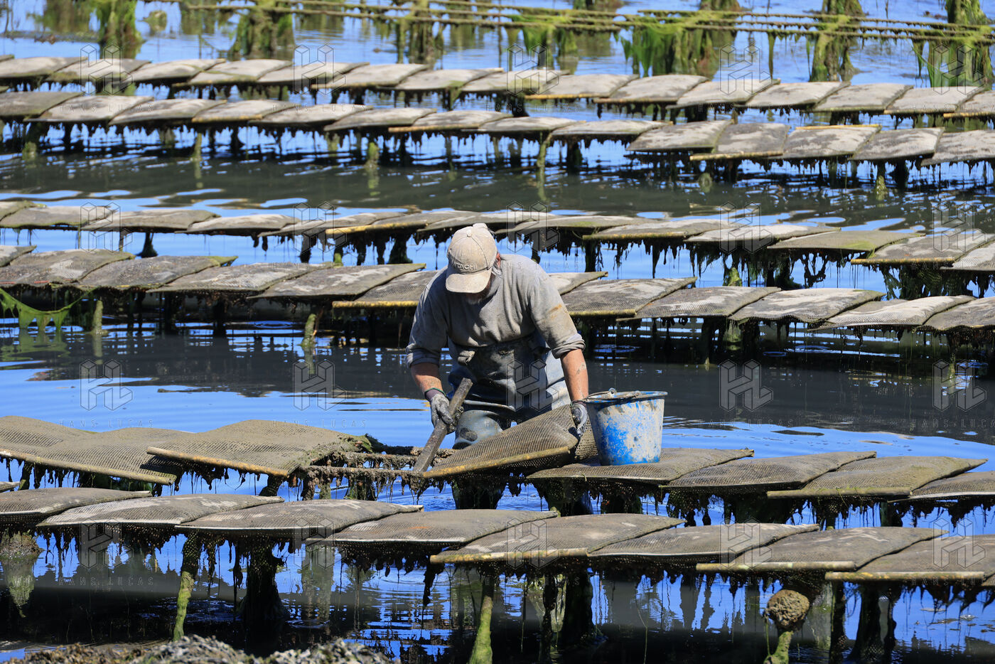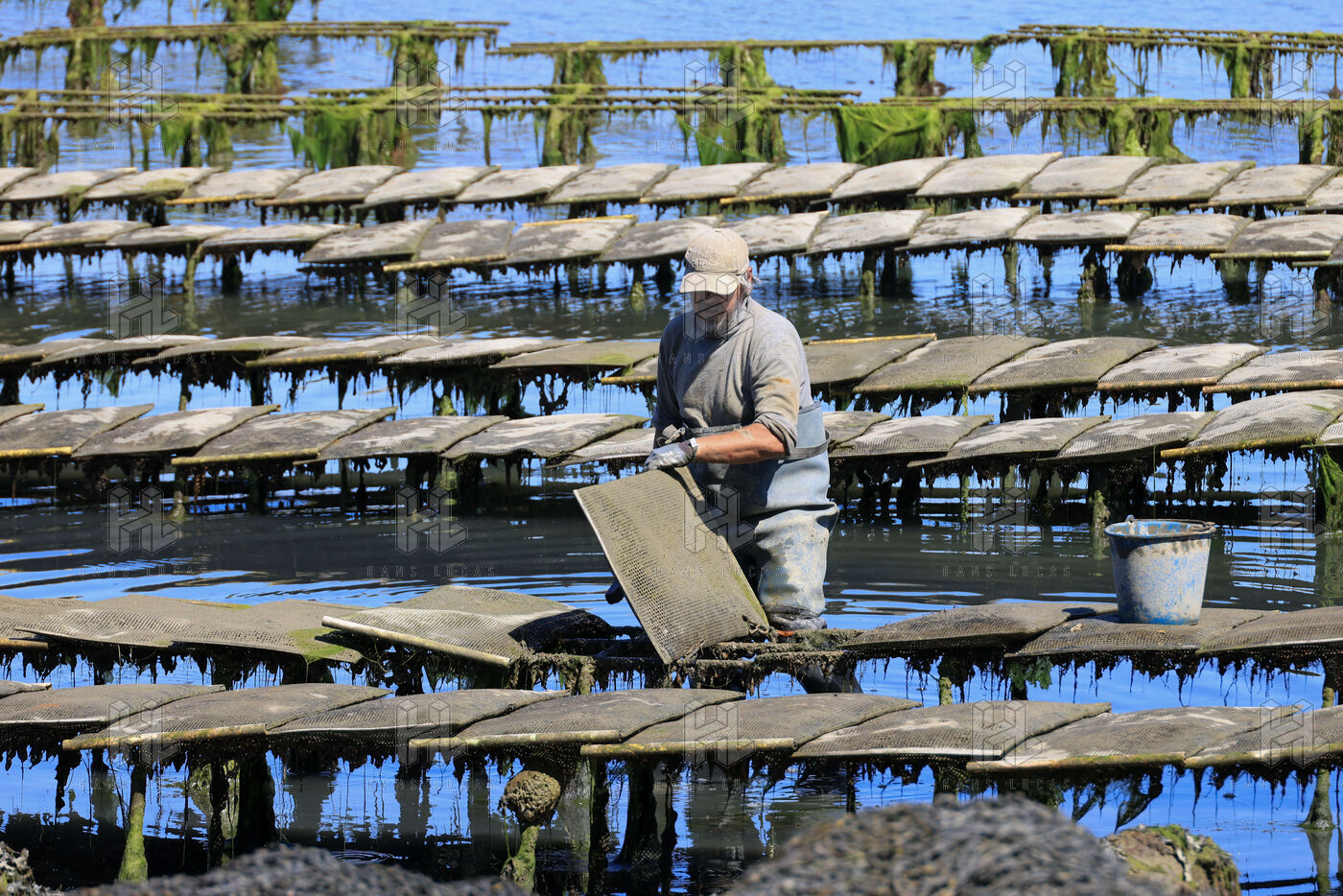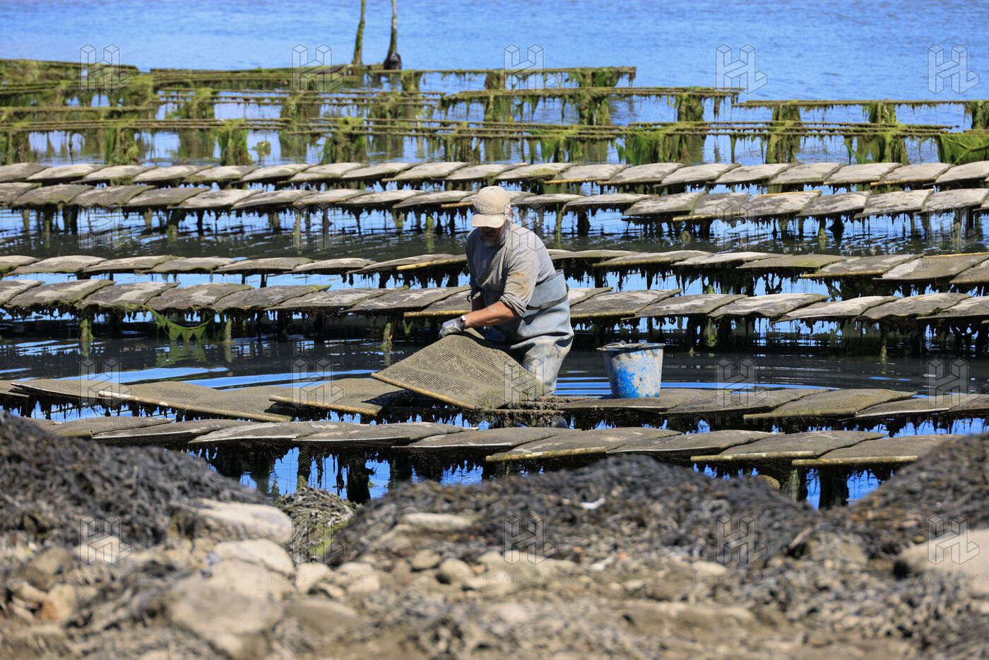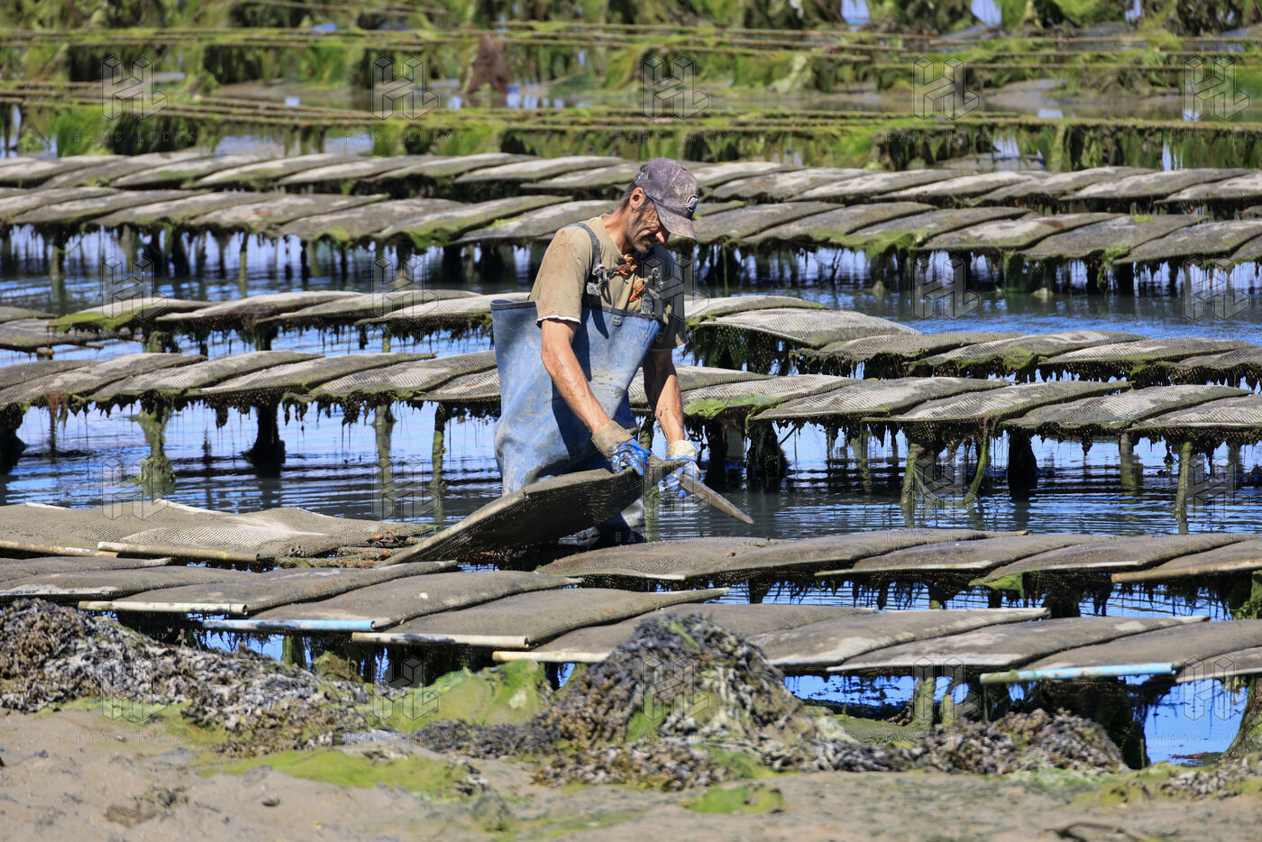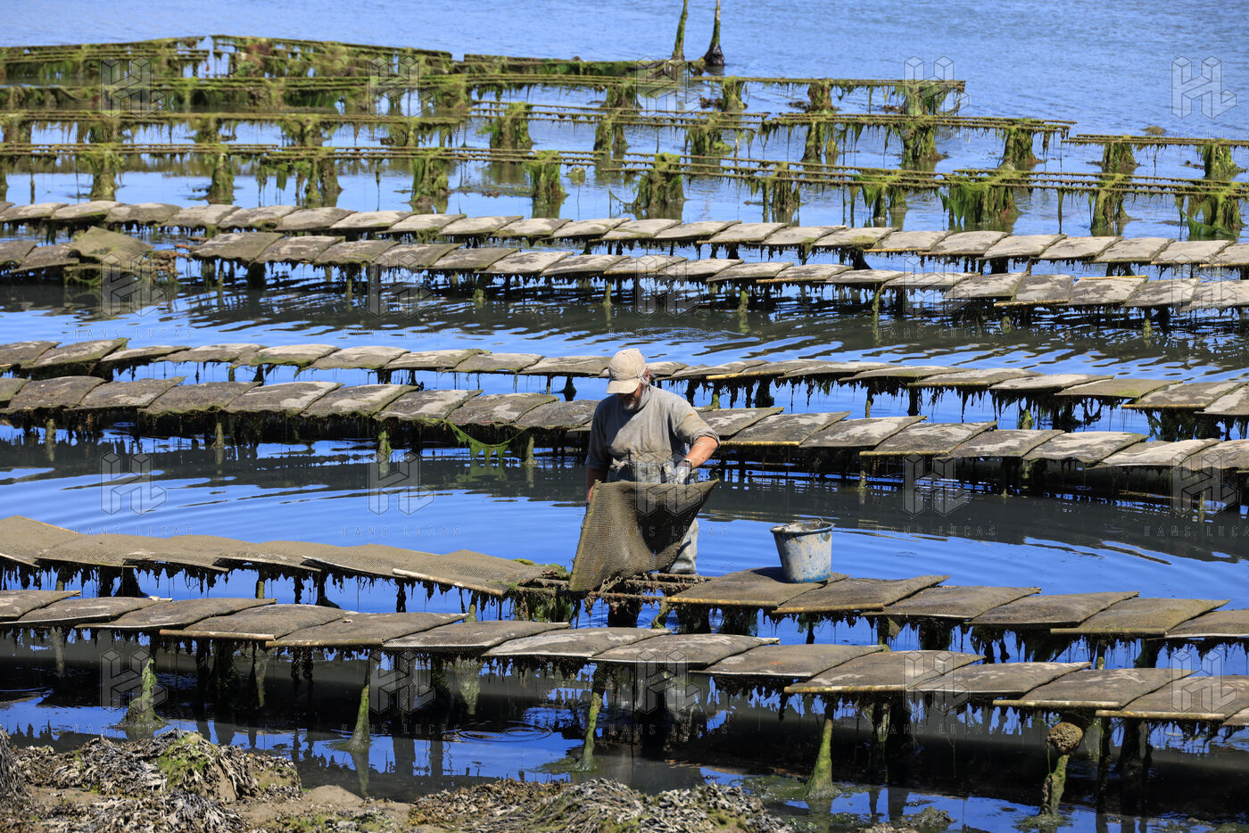 Un ostreiculteur tourne les sacs d huitres dans son parc a huitres a Saint Cado pres de Belz dans le Morbihan le 16 juillet 2025.