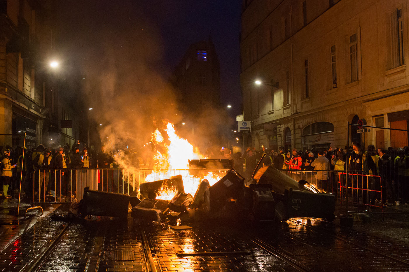 Samedi 22 décembre 2018, plusieurs milliers de manifestants ont défilé dans les rues de Bordeaux à l'occasion de l'acte 6 des Gilets jaunes. Le face à face avec la Police a été très violent; les manifestants se sont retranchés derrières leurs barricades pendant plusieurs heures avant de se disperser.