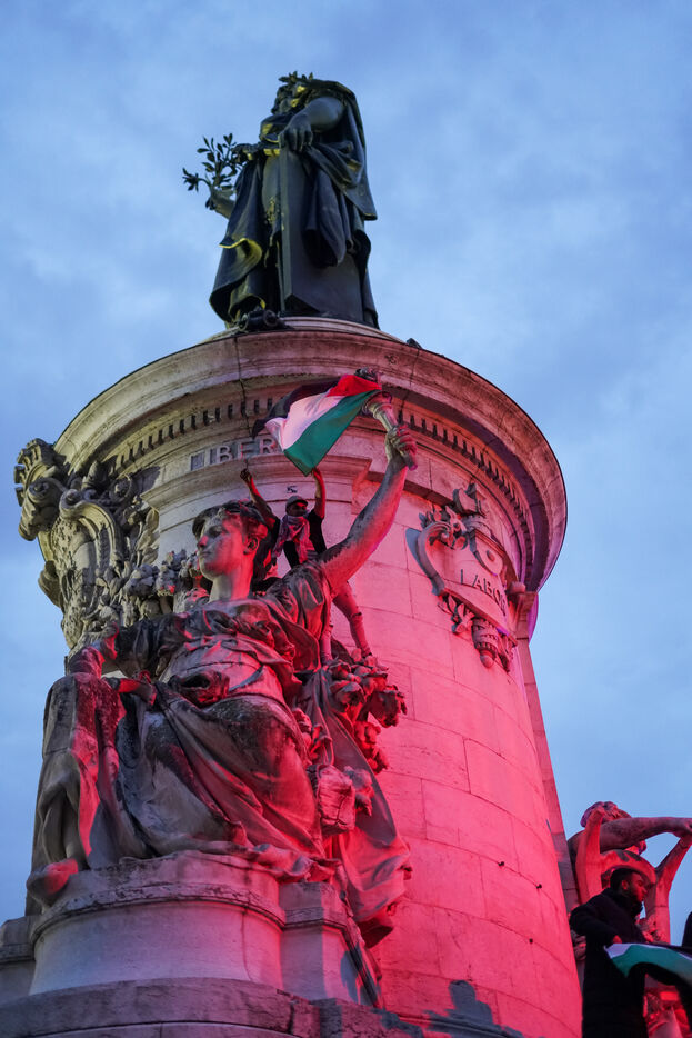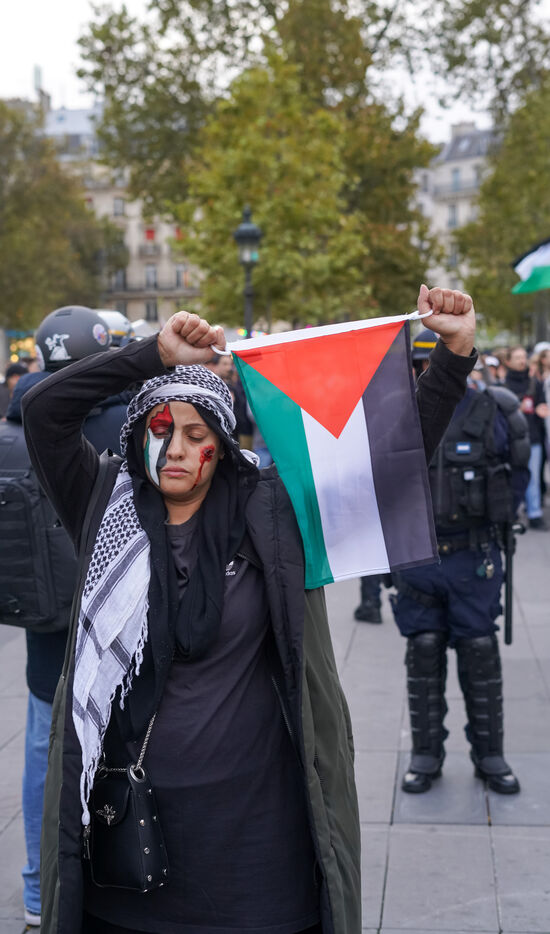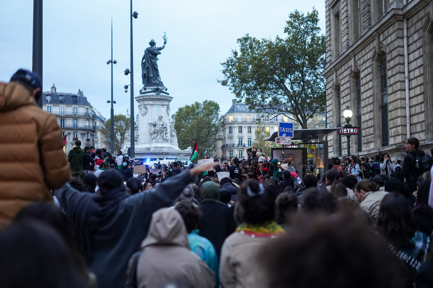 On October 19, 2023, demonstrators gather at Place de la République in Paris to express their support for the Palestinian people and call for a ceasefire in the Gaza Strip. The rally takes place in the context of the military escalation between Israel and Hamas following the attacks of October 7, 2023. Palestinian flags and protest signs calling for peace and solidarity with Gaza are visible among the crowd gathered around the statue of the Republic.