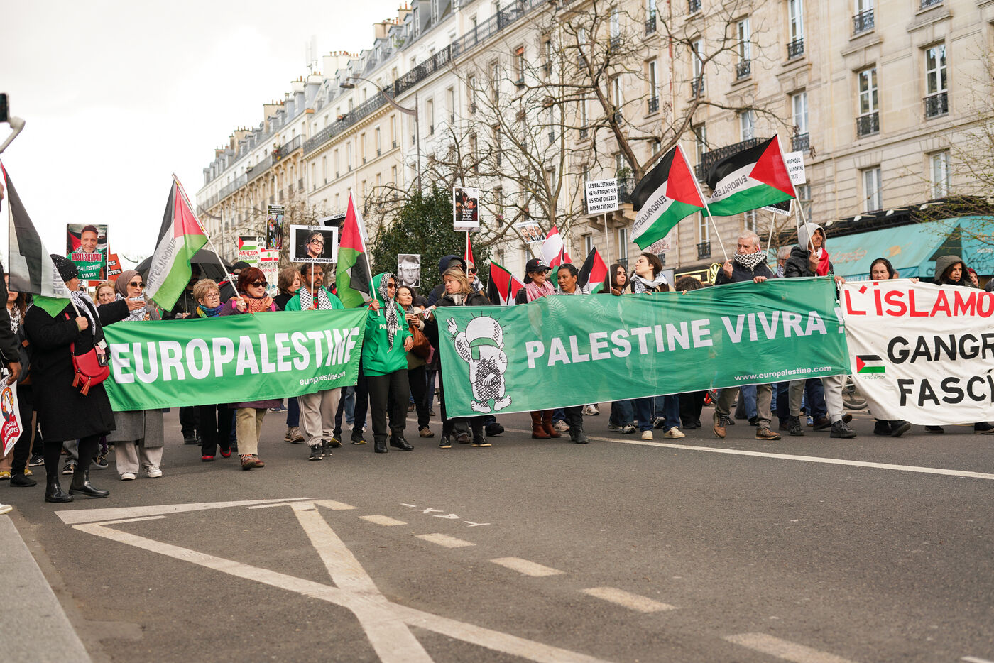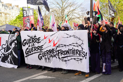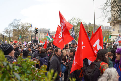 On March 14, 2026, thousands of demonstrators gather at Place de la Nation in Paris, France, during a protest against racism, far-right movements and state violence. The rally takes place as part of a nationwide day of demonstrations organized in several French cities. Protesters carry banners, placards and flags to denounce discrimination and call for solidarity.