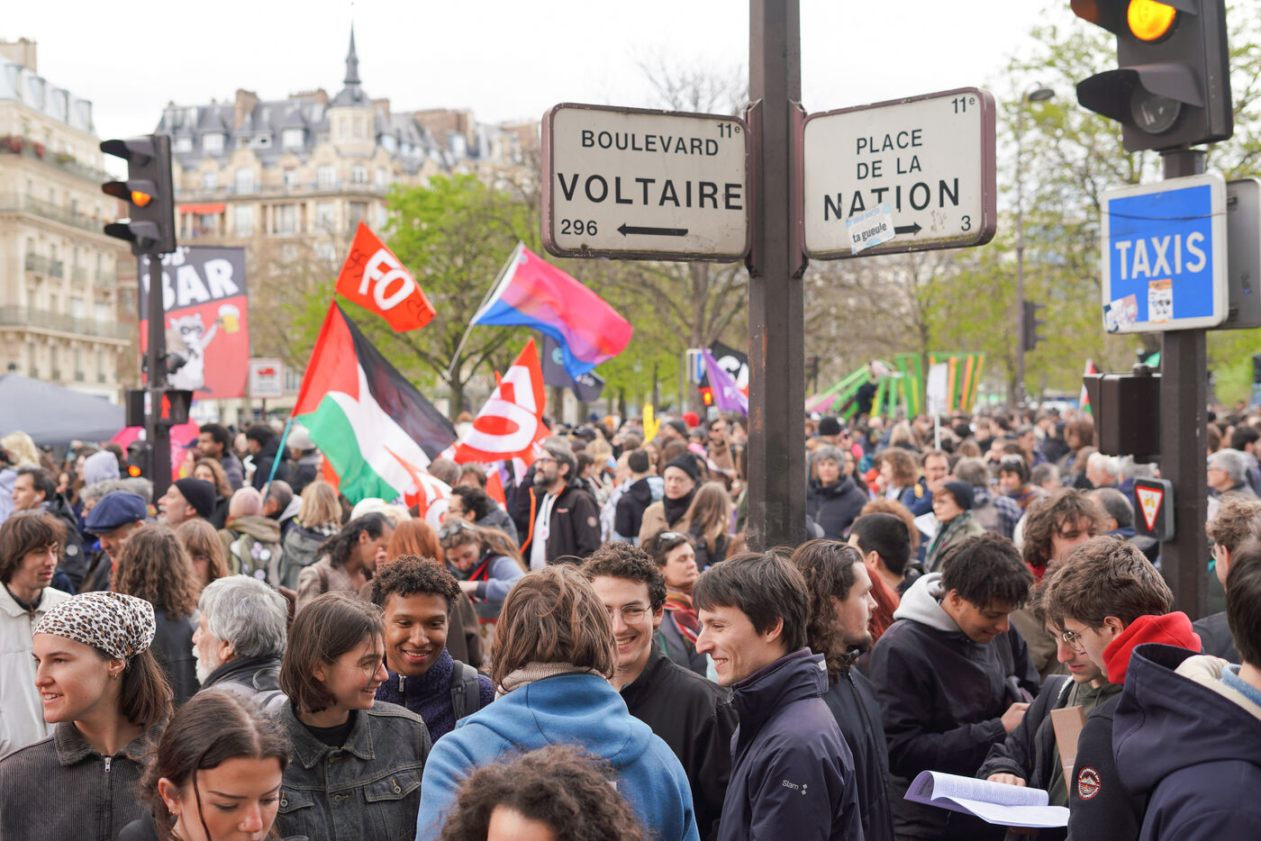 Le 14 mars 2026, des milliers de personnes se rassemblent à Paris, place de la Nation, lors d’une manifestation contre le racisme, l’extrême droite et les violences d’État. Cette mobilisation s’inscrit dans une journée nationale d’actions organisée dans plusieurs villes de France. Les manifestants brandissent pancartes, banderoles et drapeaux pour dénoncer les discriminations et appeler à la solidarité.