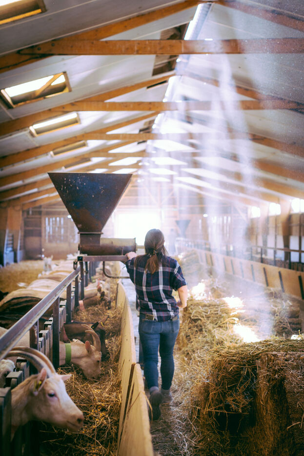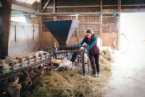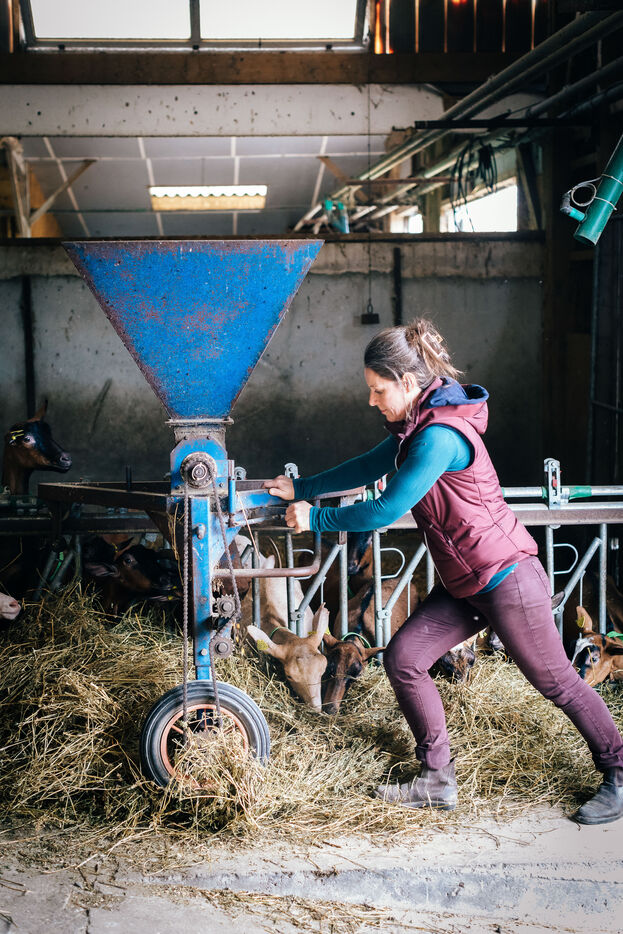 Les chèvres sont nourries à partir des céréales et des fourrages produits sur l'exploitation. Les rations sont adaptées aux besoins des animaux en fonction de leur âge et de leur niveau de lactation.