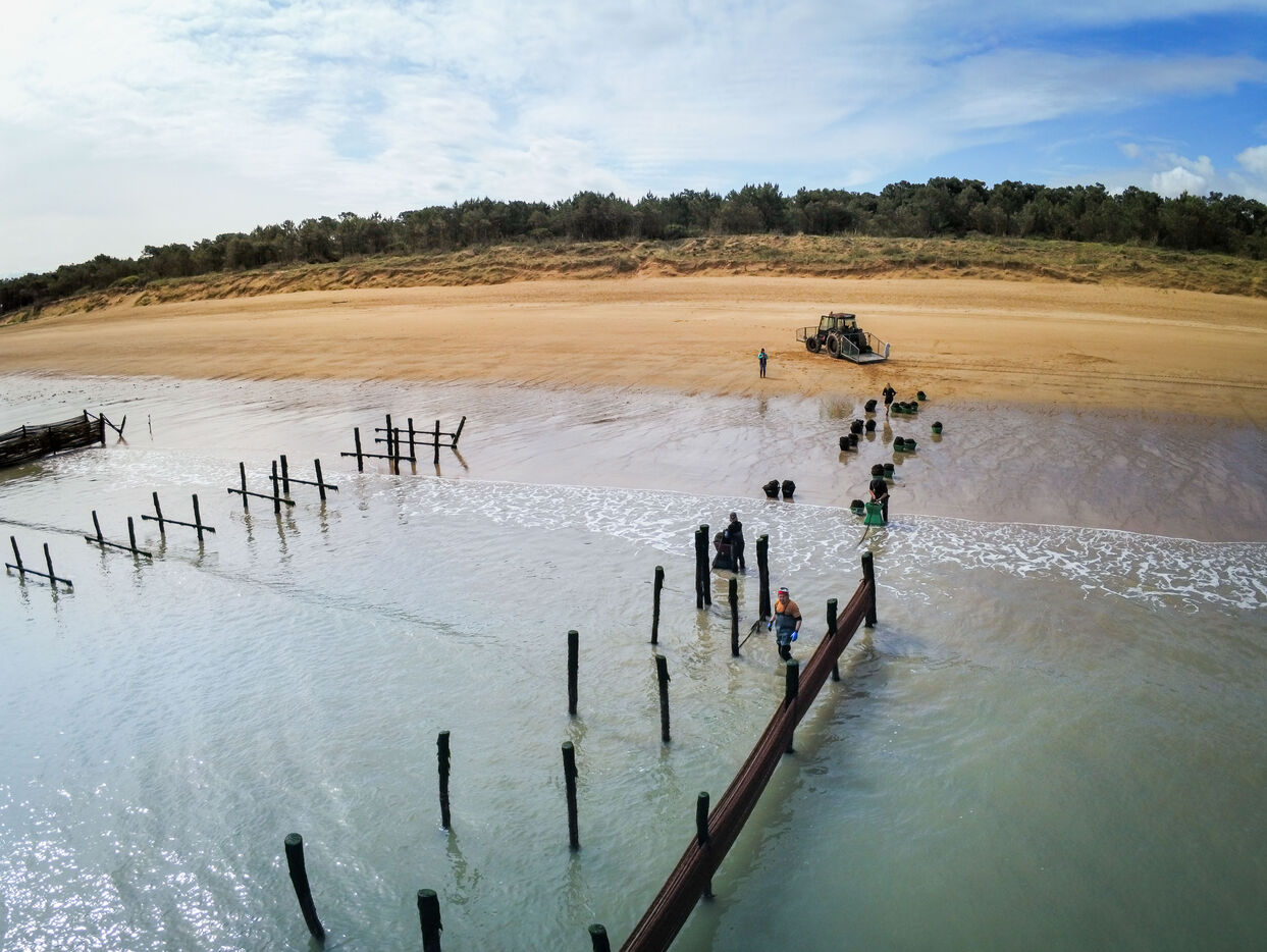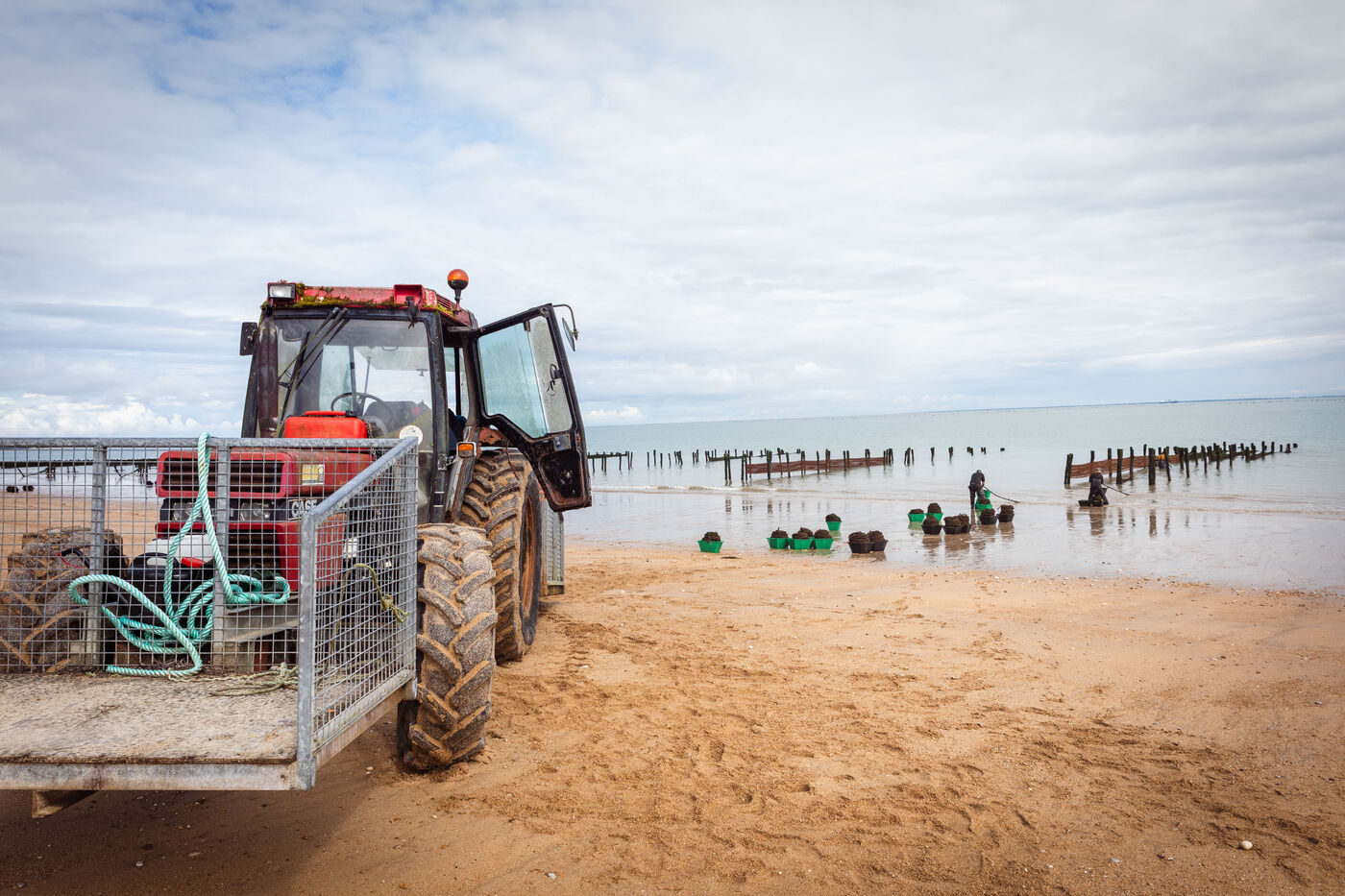 It's on the Saumonards beach, on the outskirts of the famous Fort Boyard, that the work of raising mussels begins. The first step is the collection stage: long coconut fiber ropes are installed on wooden stakes along the beach for several months (between February and May). This ancestral technique enables the mussel larvae (spat) to attach themselves to the ropes and develop. By May, the spat are large enough to move the ropes.The ropes are then unhooked, wound into mantles (each mantle contains 100m of rope filled with spat) and sold to breeders who will allow the mussels to grow to adult size.