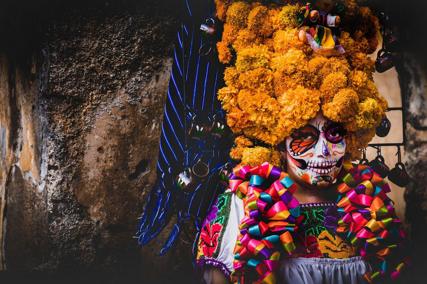 The festivities of “Los Dias de Los Muertos” take place on the first two days of November in an explosion of color and joie de vivre. The theme remains death, but it is about showing love and respect for deceased family members. In towns and villages across Mexico, people take part in this celebration by wearing makeup and costumes, organizing parades and parties, singing, dancing, and making offerings to their departed loved ones.