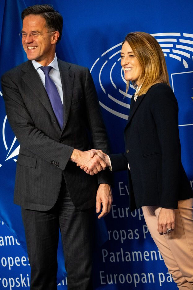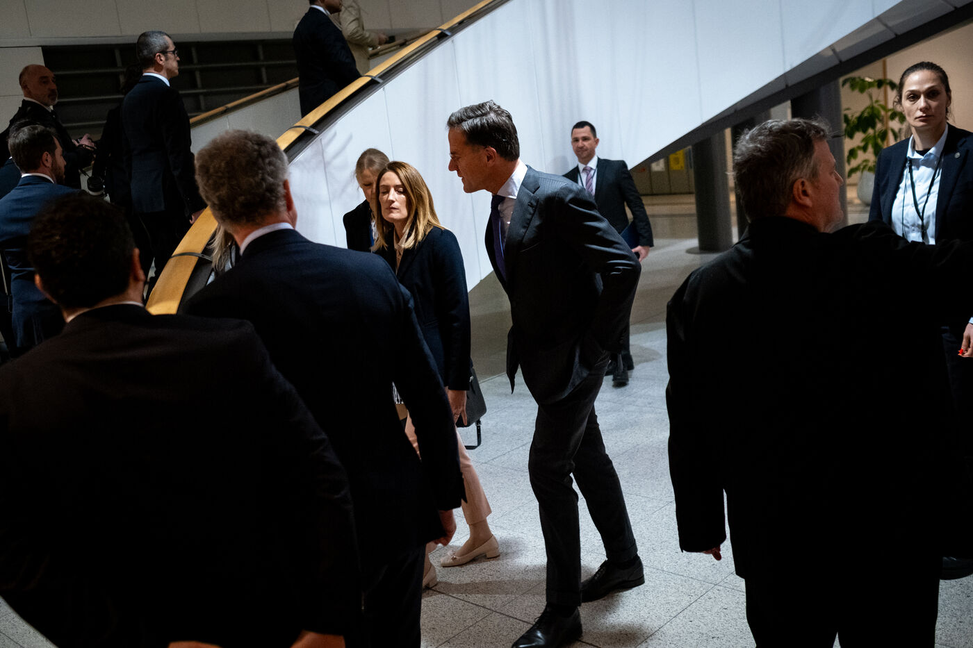 Rencontre entre la Présidente du Parlement Européen Roberta Metsola et le Secrétaire général de l'OTAN (Organisation du traite de l Atlantique nord) Mark Rutte suivi d'un débat sur la sécurité européenne et mondiale entre Mark Rutte et les députés européen, en présence de Jordan Bardella, Président du parti français le Rassemblement National.
