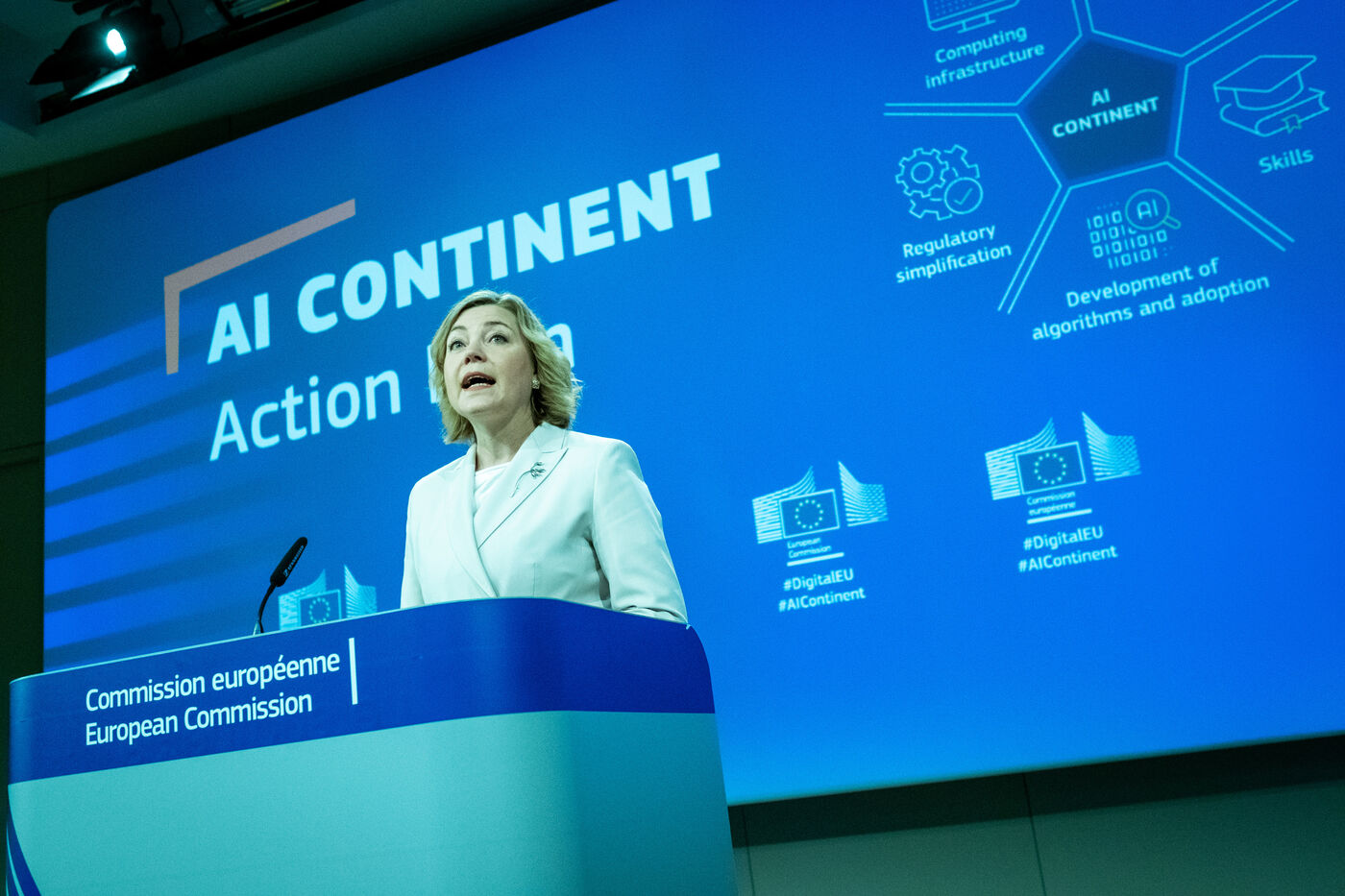 Press conference of Executive Vice-President of the European Commission for Tech Sovereignty and Security and Democracy Henna Virkkunen on the AI Continent Action Plan. The AI Continent Action Plan outlines key areas where efforts need to intensify to make Europe a leading Artificial Intelligence Continent.