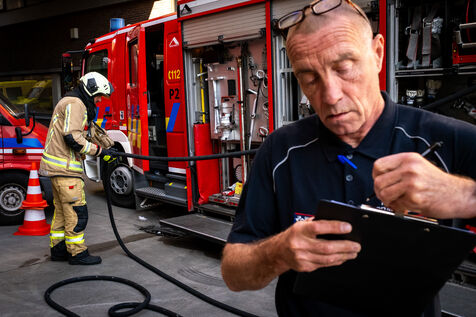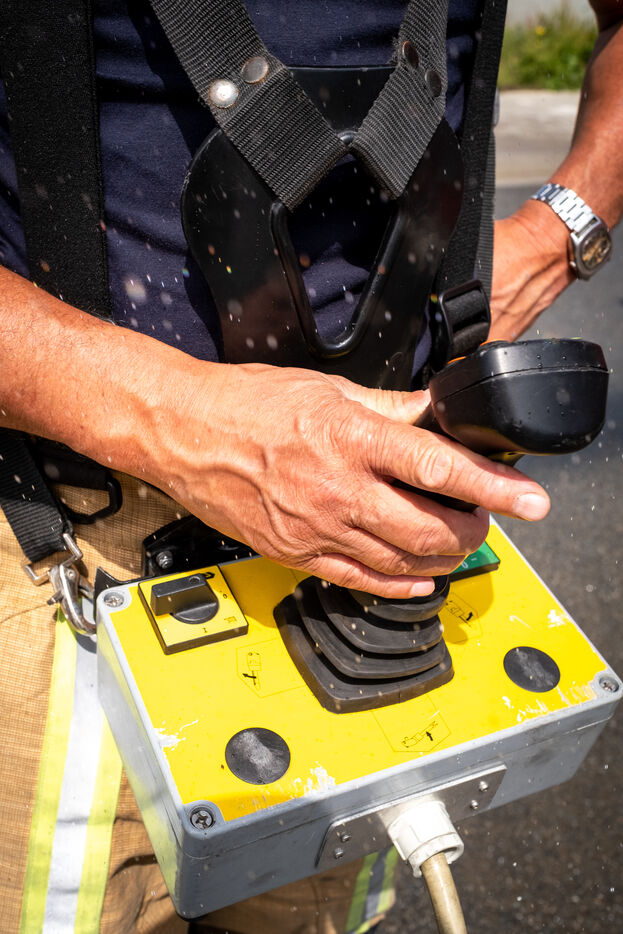 The following Monday, an exercise is conducted at a fuel depot on the TotalEnergies site, at the Port of Brussels along the Willebroek Canal. Corporal Luc Van Ussel explains: “Today’s objective is to test the water supply and the safety systems around the fuel tanks, some of which exceed 30,000 liters. These are large reservoirs several meters high and in circumference.”