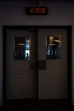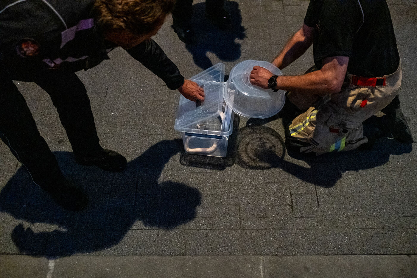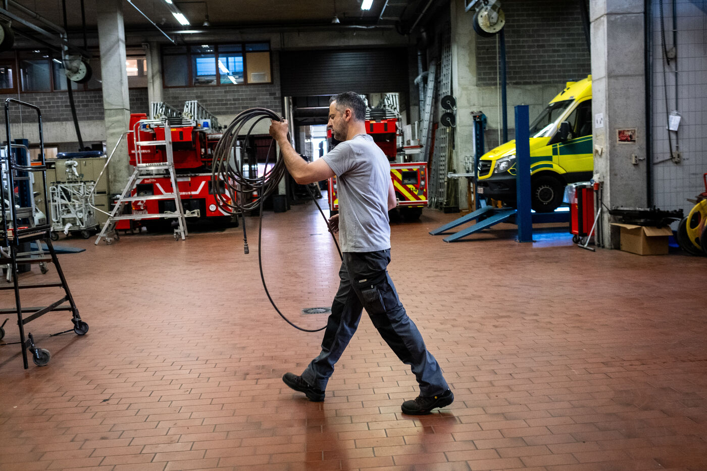 At the beginning of the afternoon, an alert reports a fire in an underground parking garage in the municipality of Saint-Gilles. The radio announces “heavy smoke coming out, but the fire was apparently extinguished by the butcher from the shop across the street.” When the firefighters arrive, the entrance is nothing more than a dark, smoke-filled tunnel into which they disappear one after another. Thanks to the rapid intervention of the neighboring shopkeeper, the incident seems under control, but the firefighters carefully check for any risk of reignition. The new electrical panel, installed two days earlier, is said to have gone up in flames. The electrician from the responsible company is, in fact, waiting on the other side of the street to be allowed onto the scene.