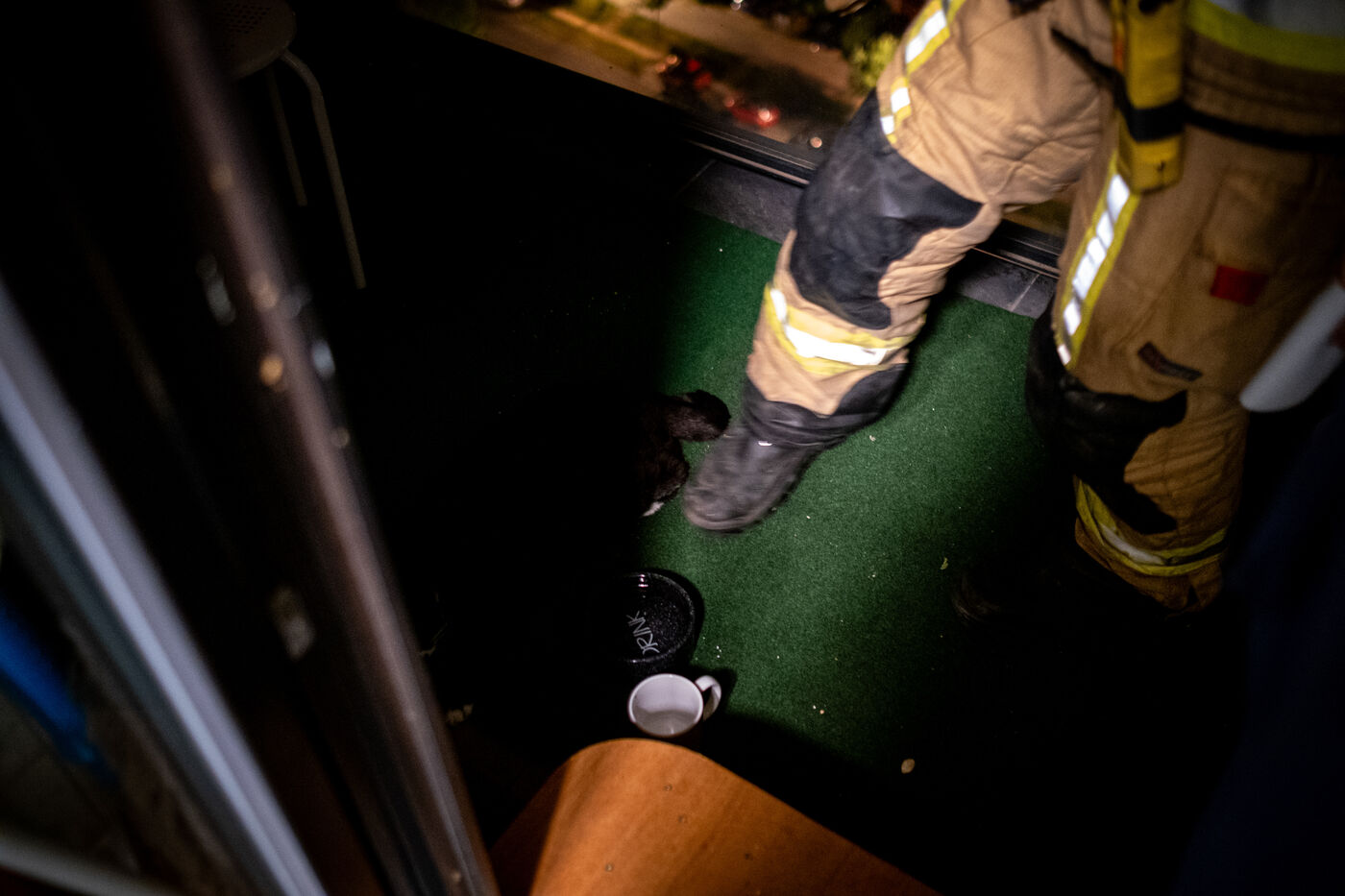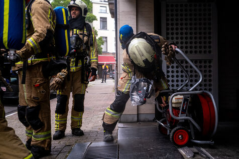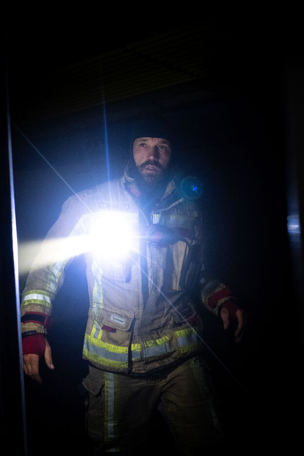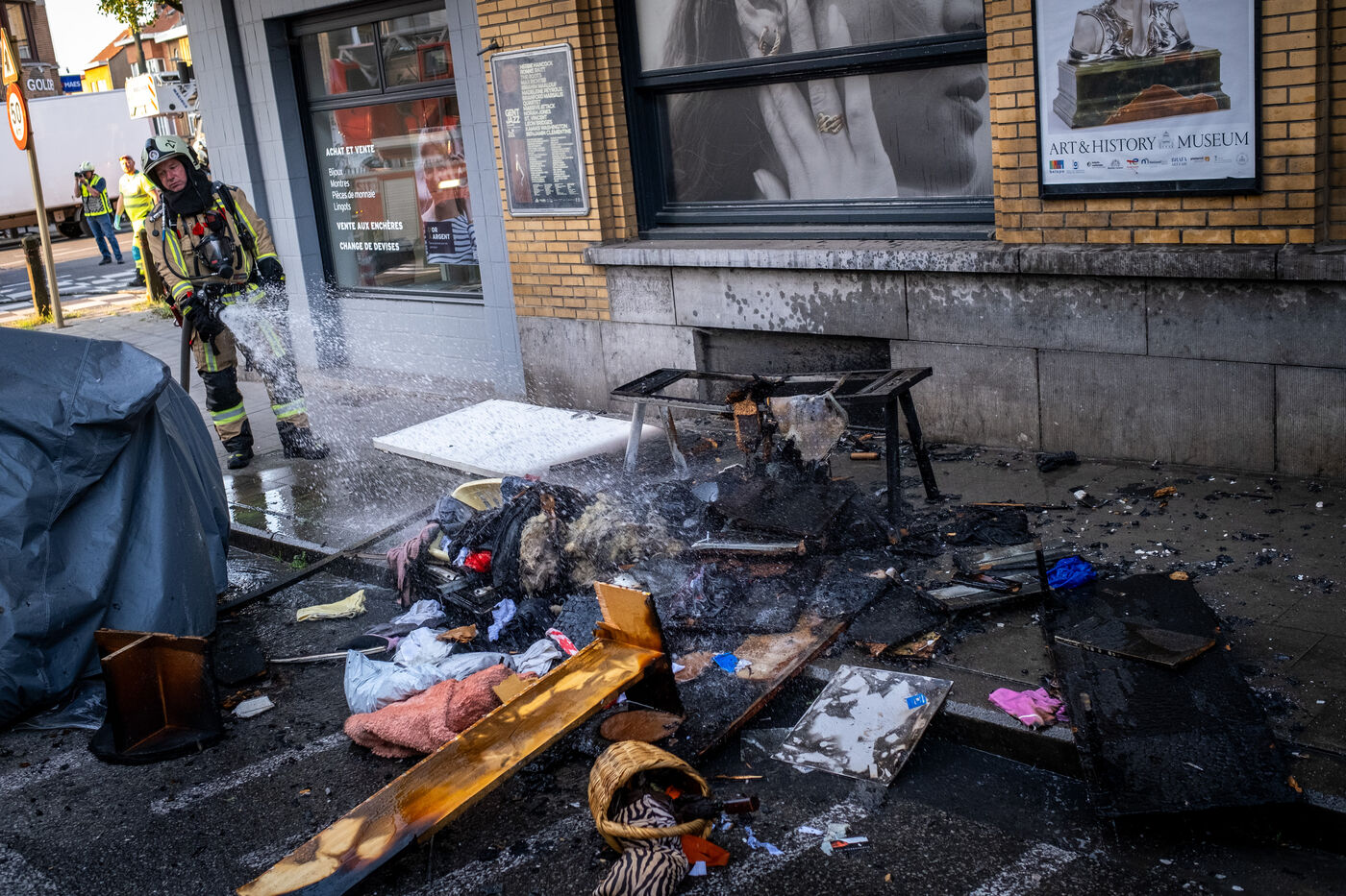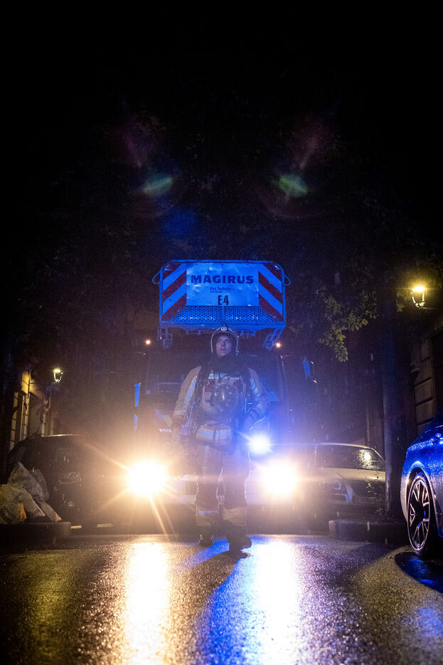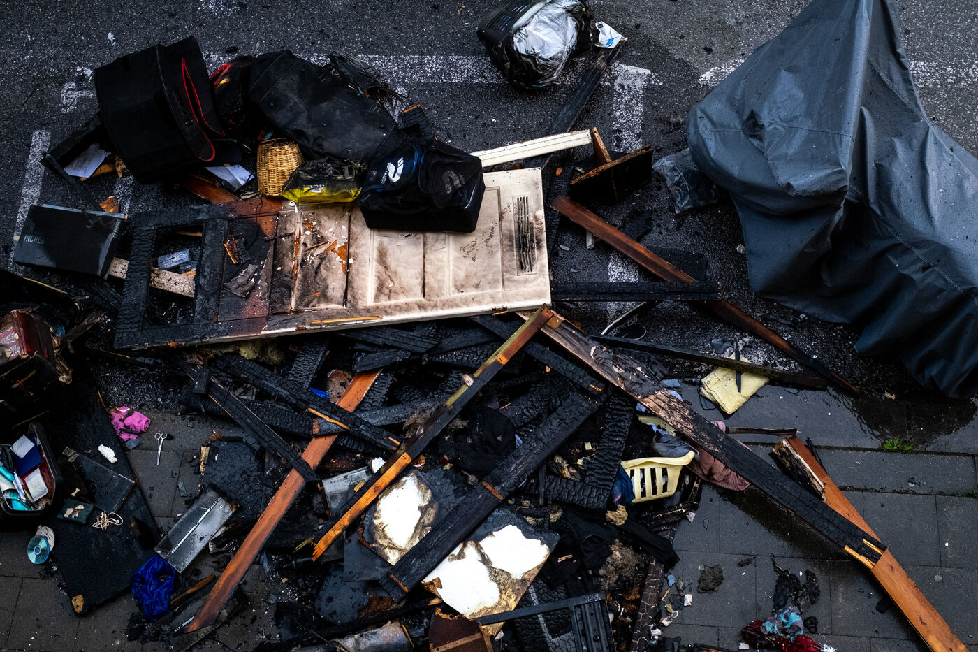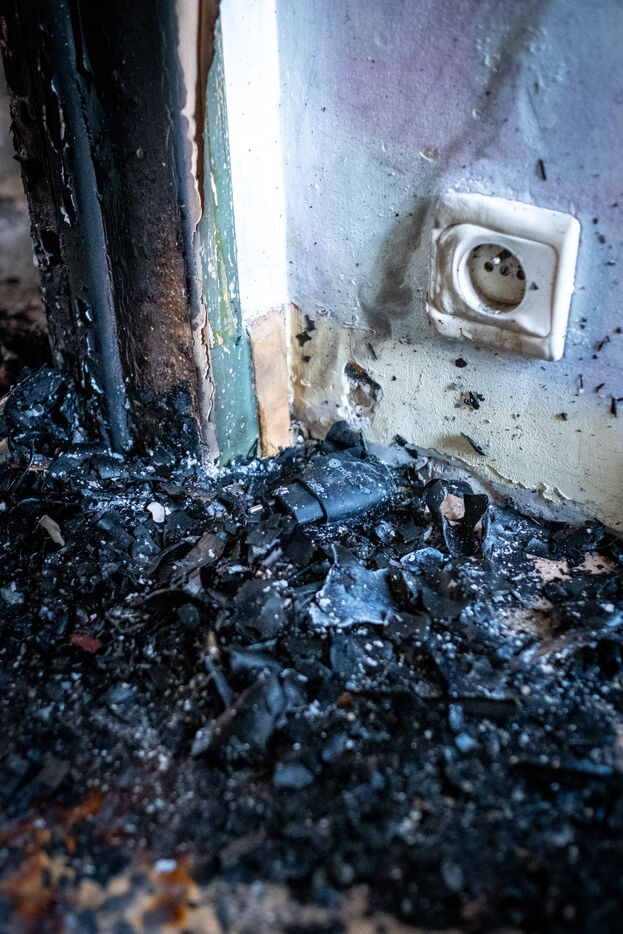 The work is still far from over in securing the building and making sure the fire does not flare up again. The bedroom is soaked and the charred wall sections are torn away. Every object or piece of furniture still hot is thrown out of the window, crashing onto the asphalt to gradually form a pile that will be continuously sprayed with water for a quarter of an hour.