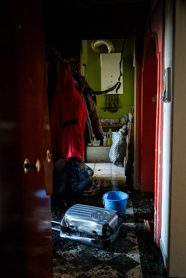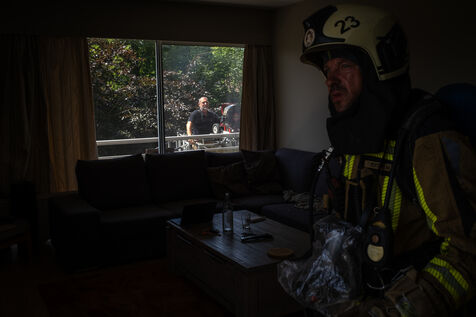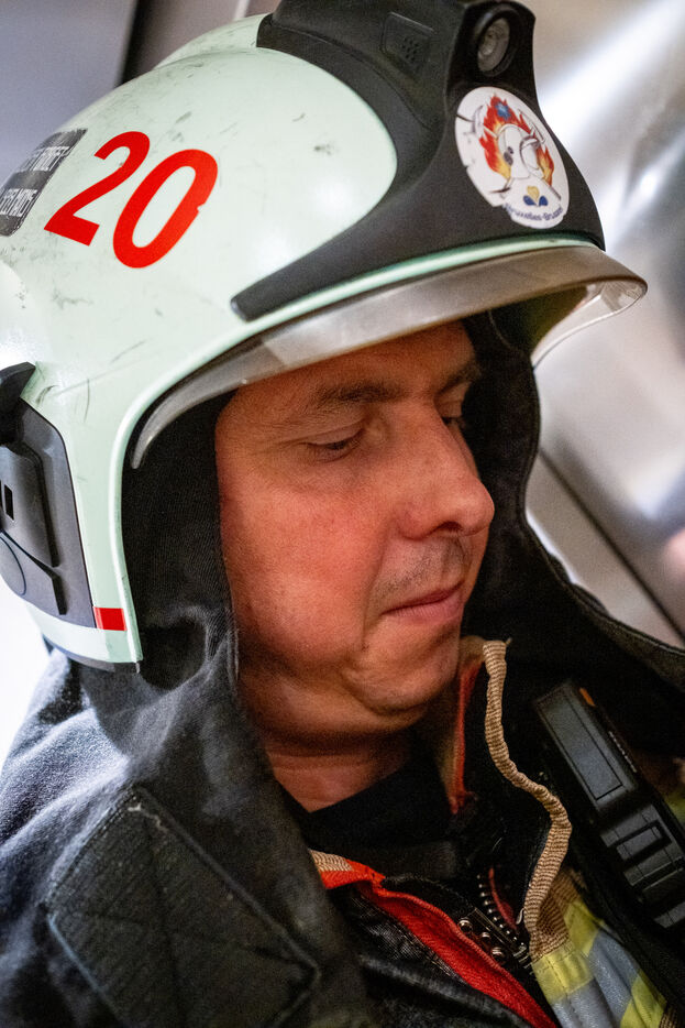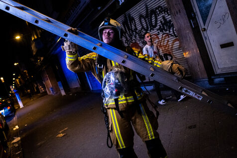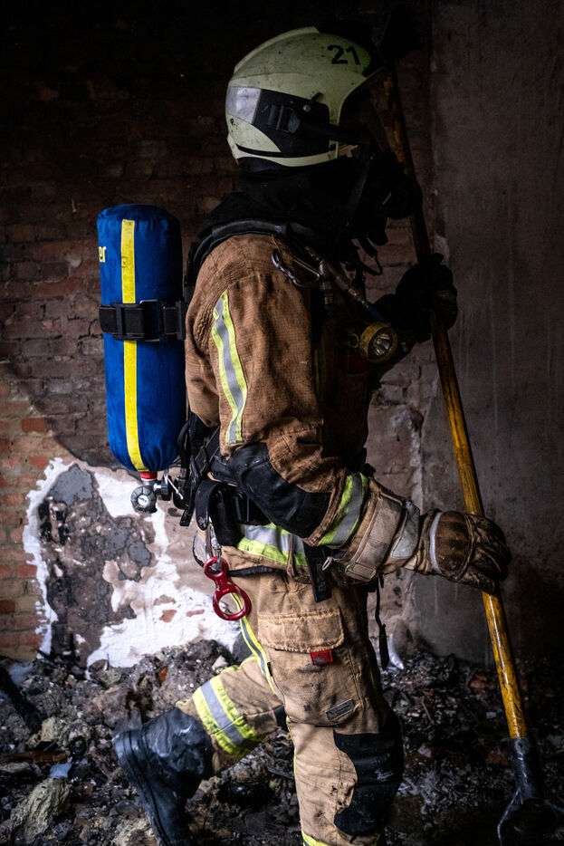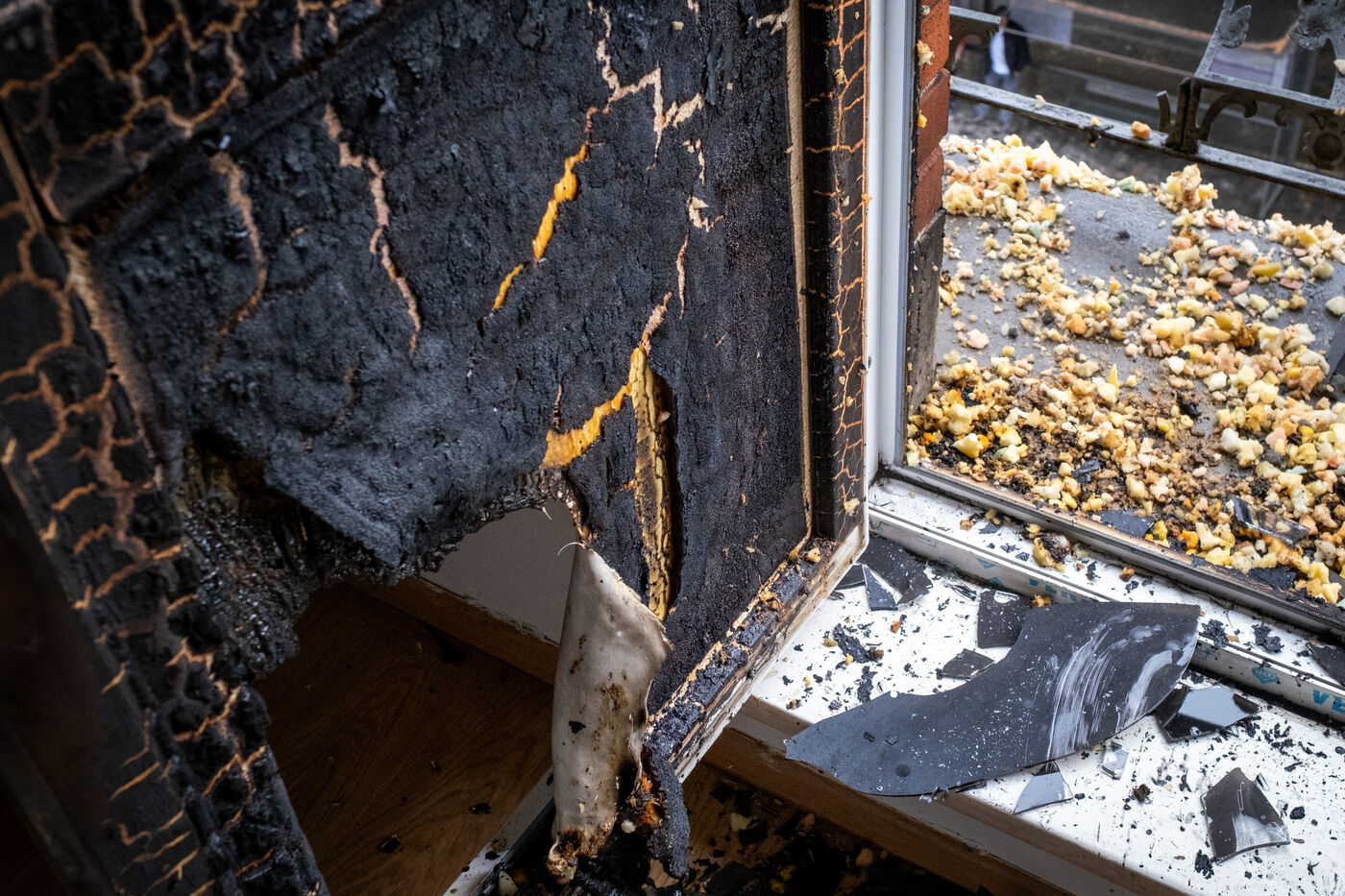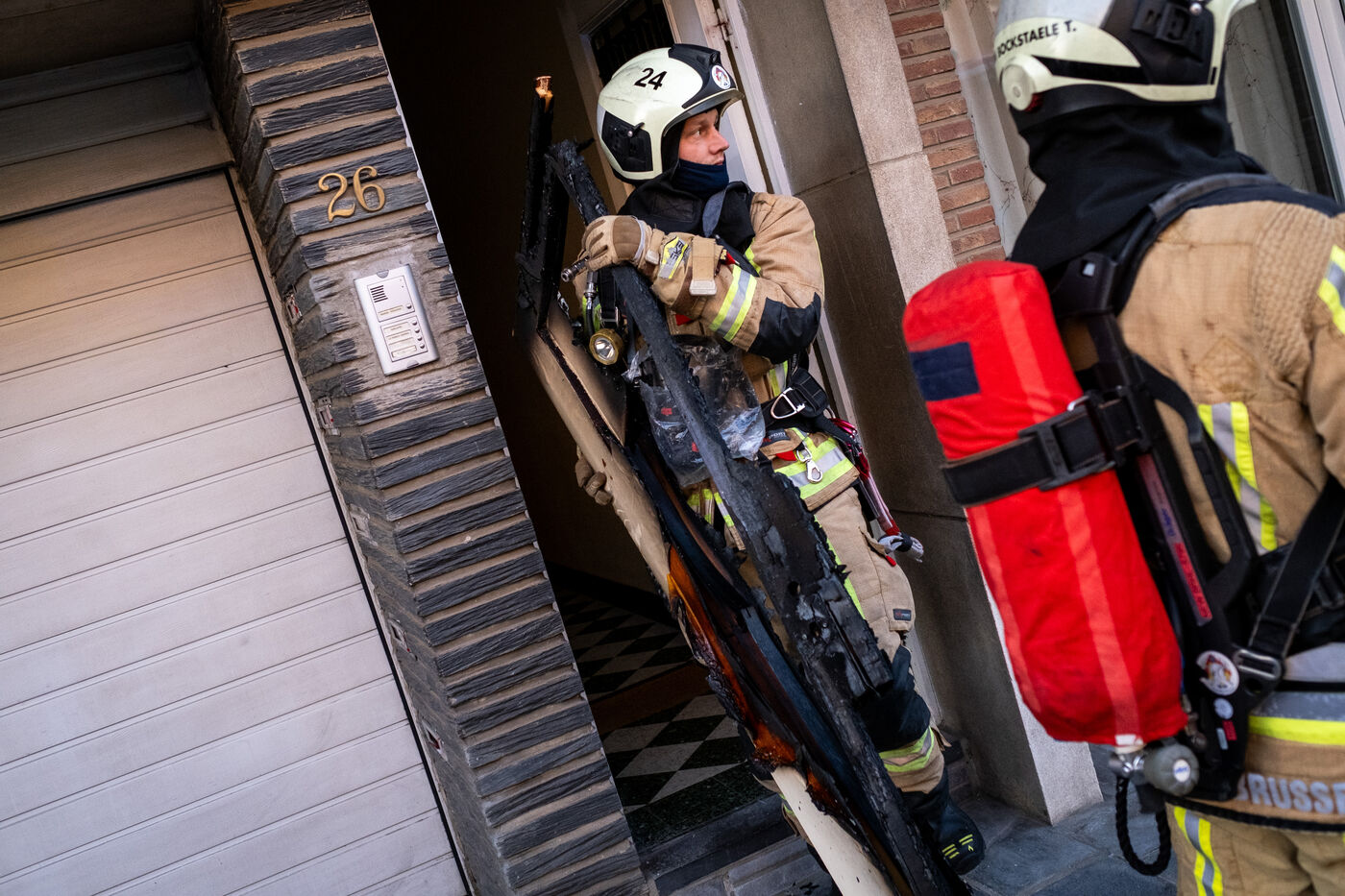 The work is still far from over in securing the building and making sure the fire does not flare up again. The bedroom is soaked and the charred wall sections are torn away. Every object or piece of furniture still hot is thrown out of the window, crashing onto the asphalt to gradually form a pile that will be continuously sprayed with water for a quarter of an hour.