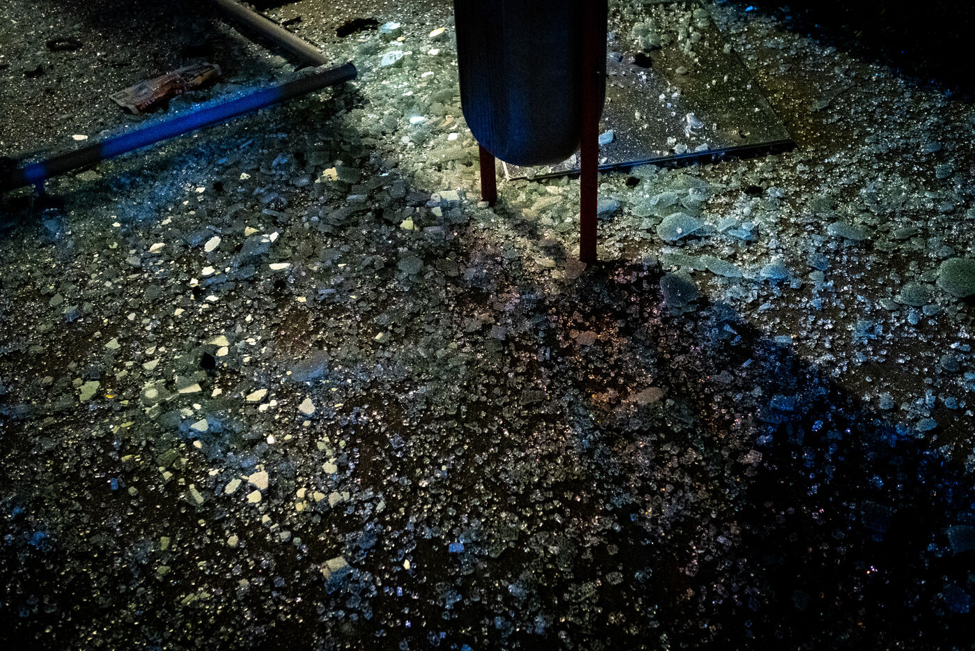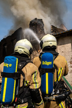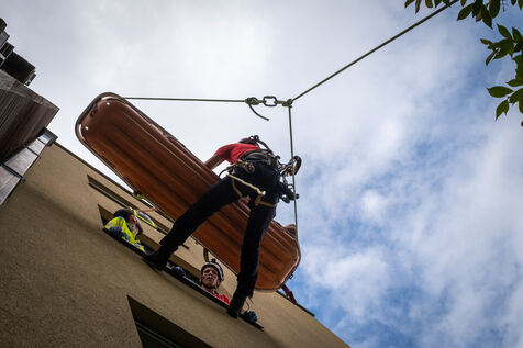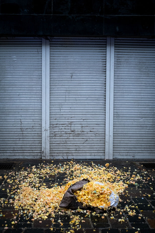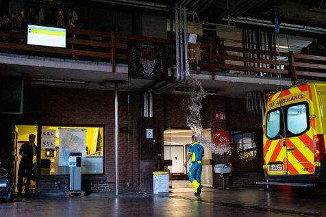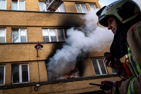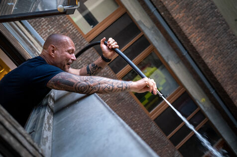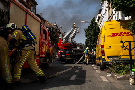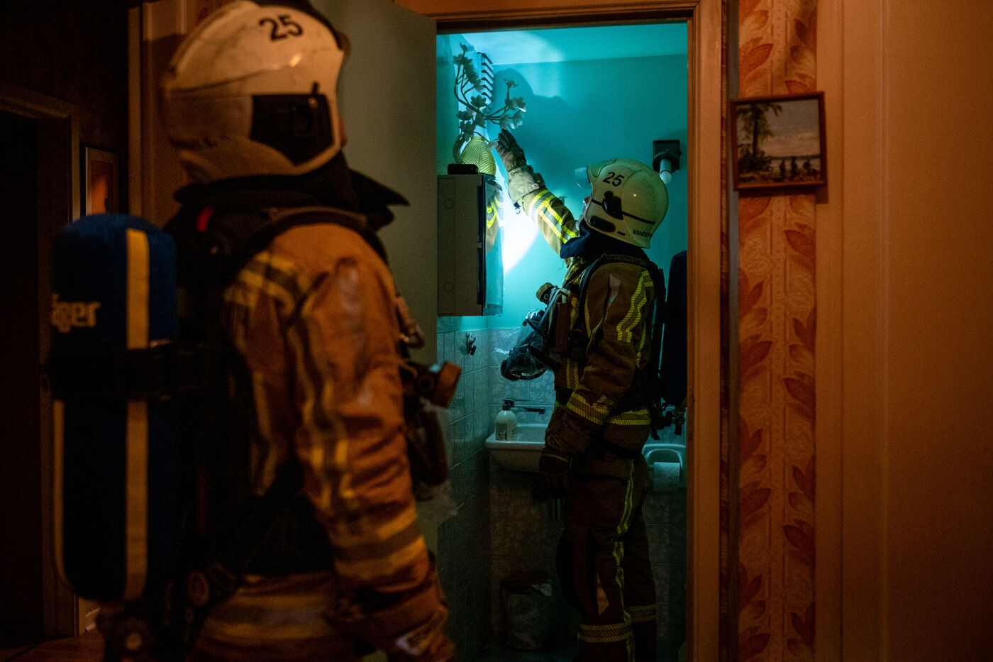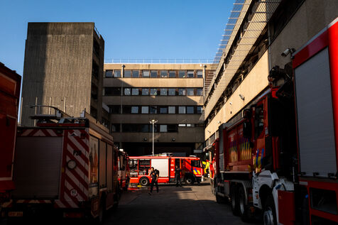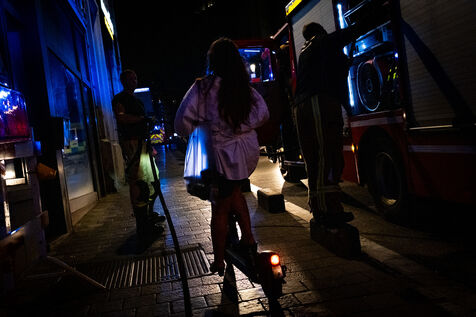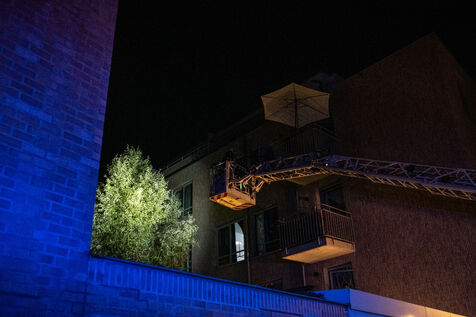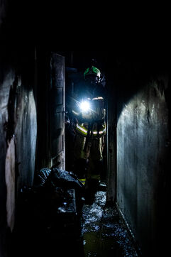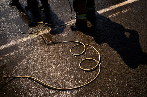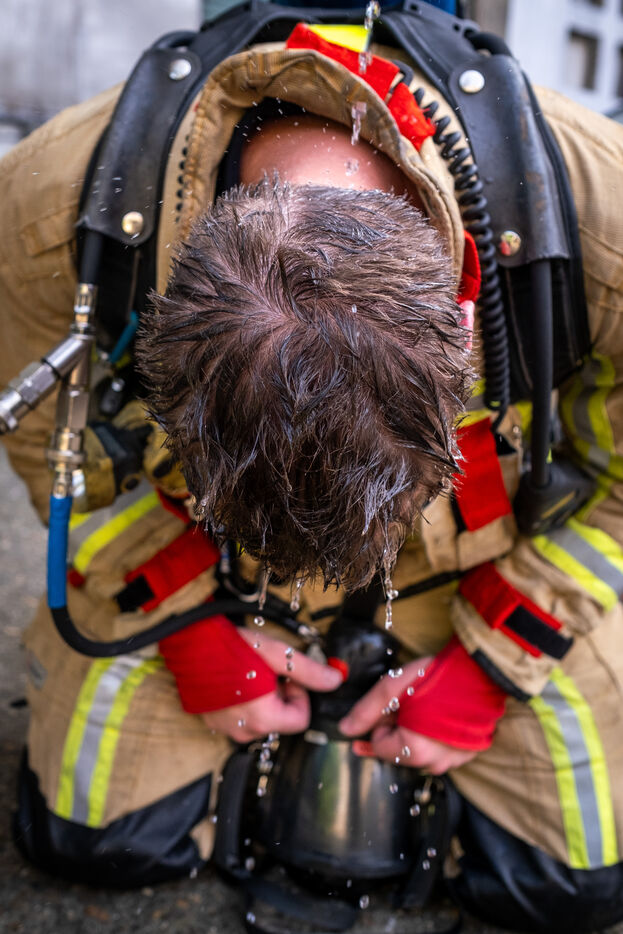 The work is still far from over in securing the building and making sure the fire does not flare up again. The bedroom is soaked and the charred wall sections are torn away. Every object or piece of furniture still hot is thrown out of the window, crashing onto the asphalt to gradually form a pile that will be continuously sprayed with water for a quarter of an hour.