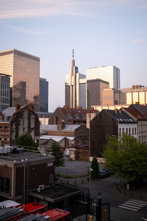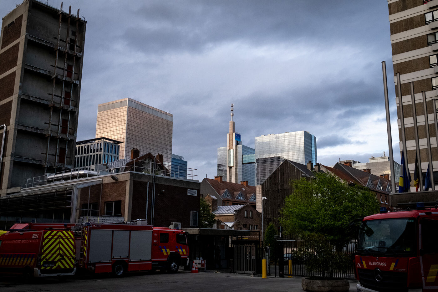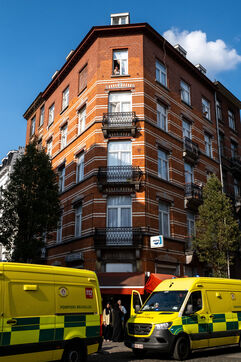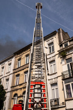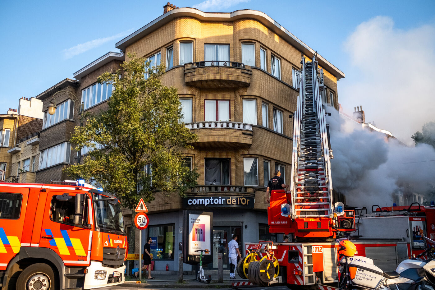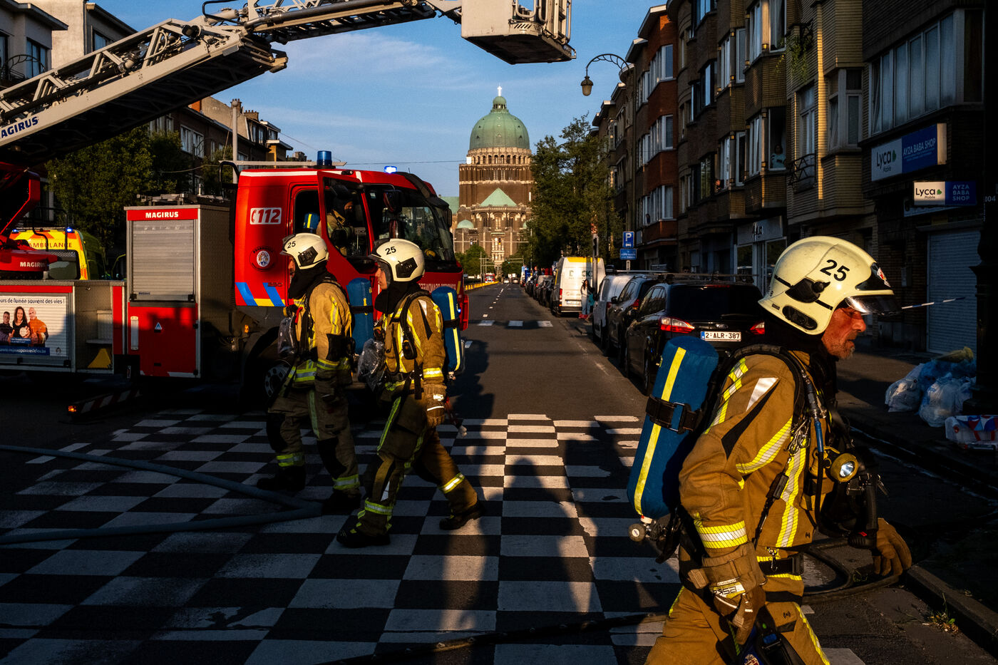 The building stands on the corner of Rue de Ganshoren and Avenue Charles-Quint. It is on this wide boulevard—with the 93-meter Basilica of Koekelberg in the background, bathed in the last rays of the sun—that the firefighters deploy with two pump engines.