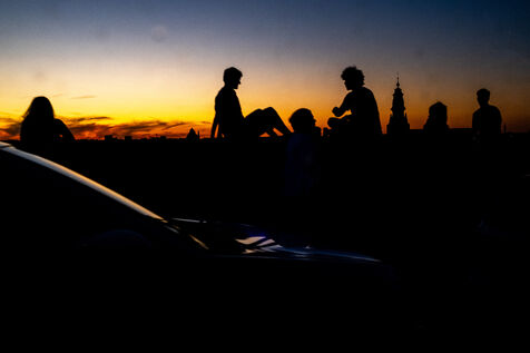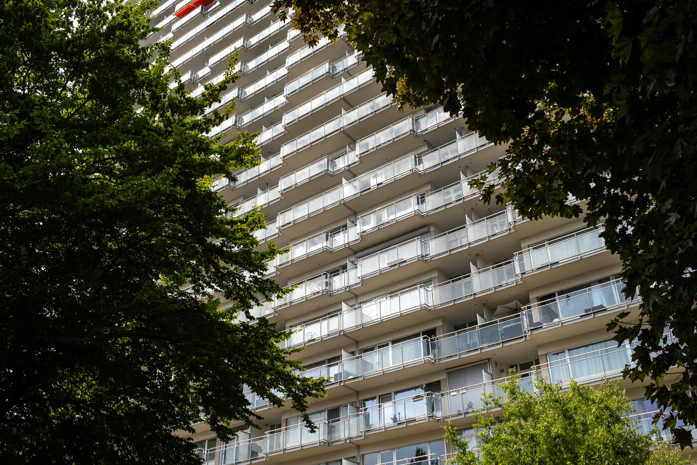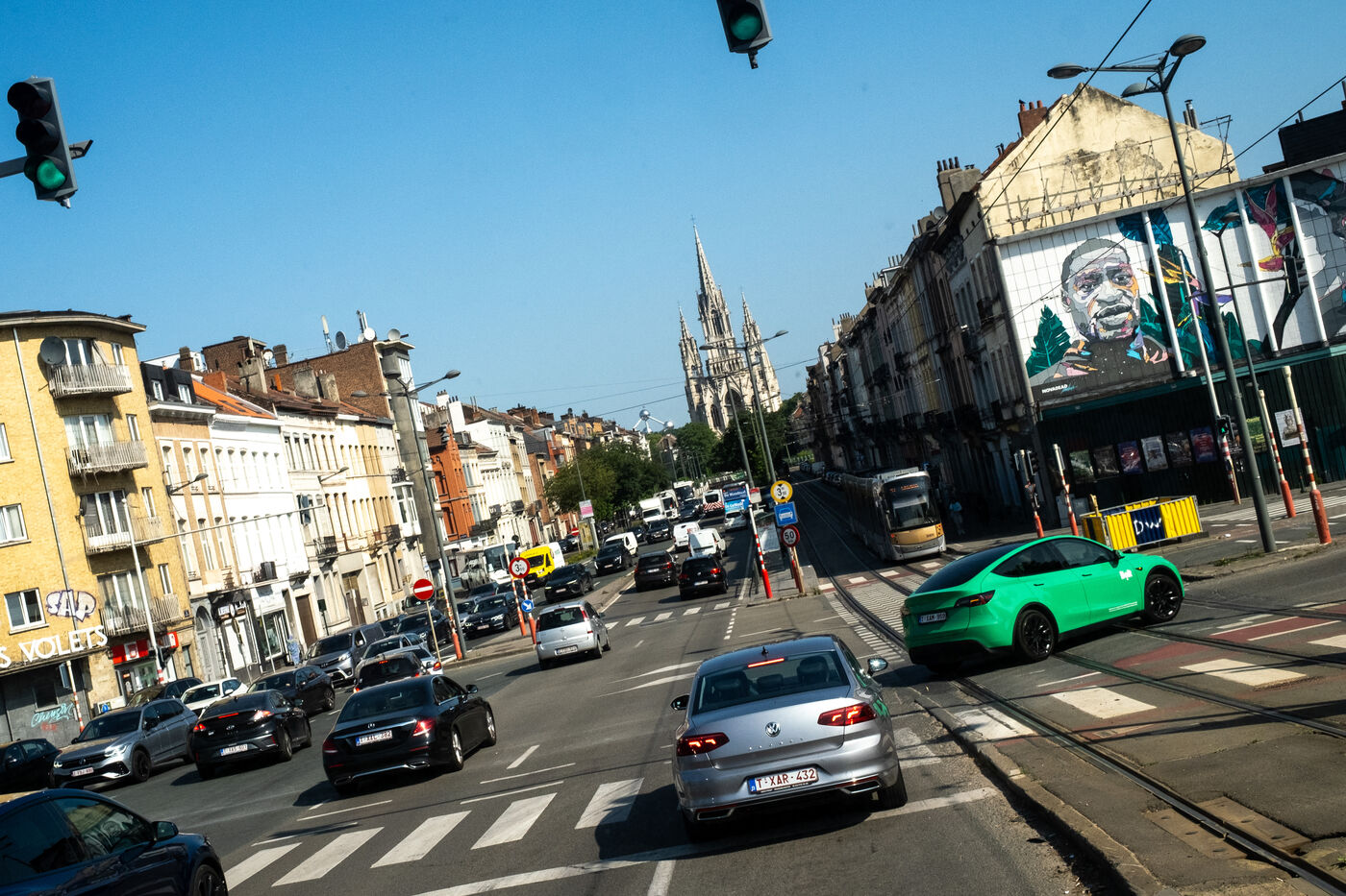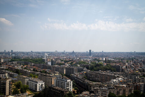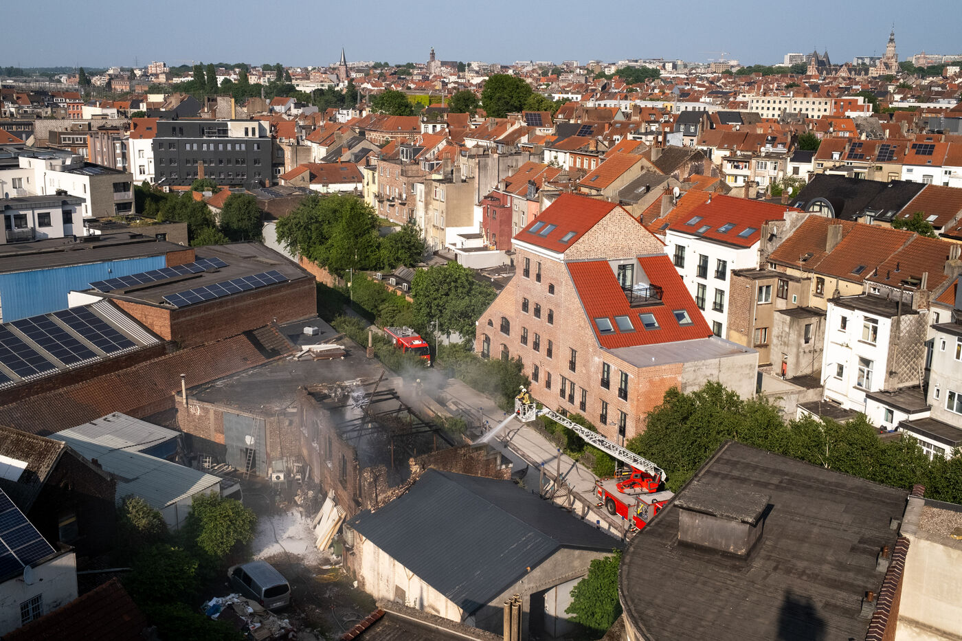 The building stands on the corner of Rue de Ganshoren and Avenue Charles-Quint. It is on this wide boulevard—with the 93-meter Basilica of Koekelberg in the background, bathed in the last rays of the sun—that the firefighters deploy with two pump engines.