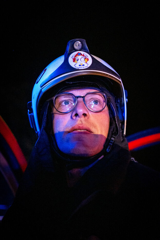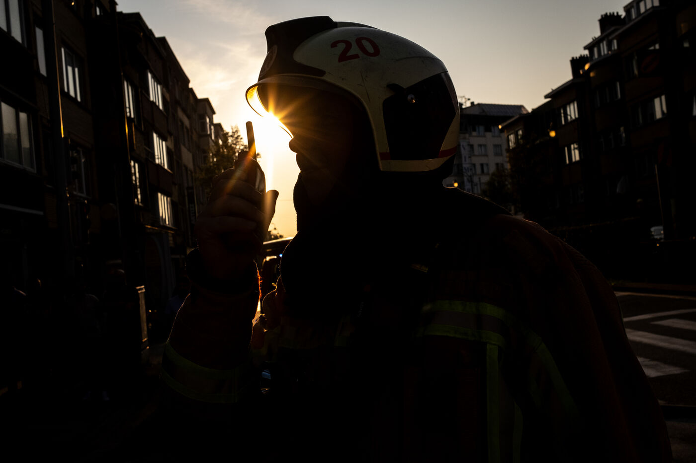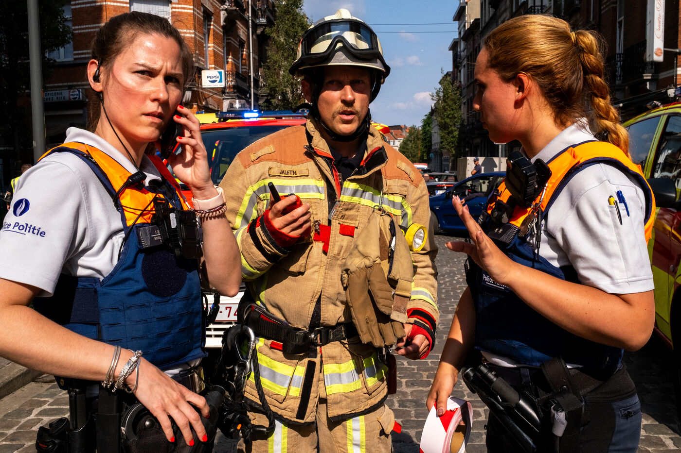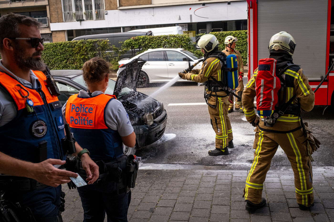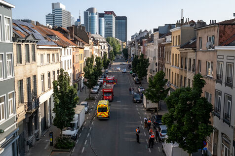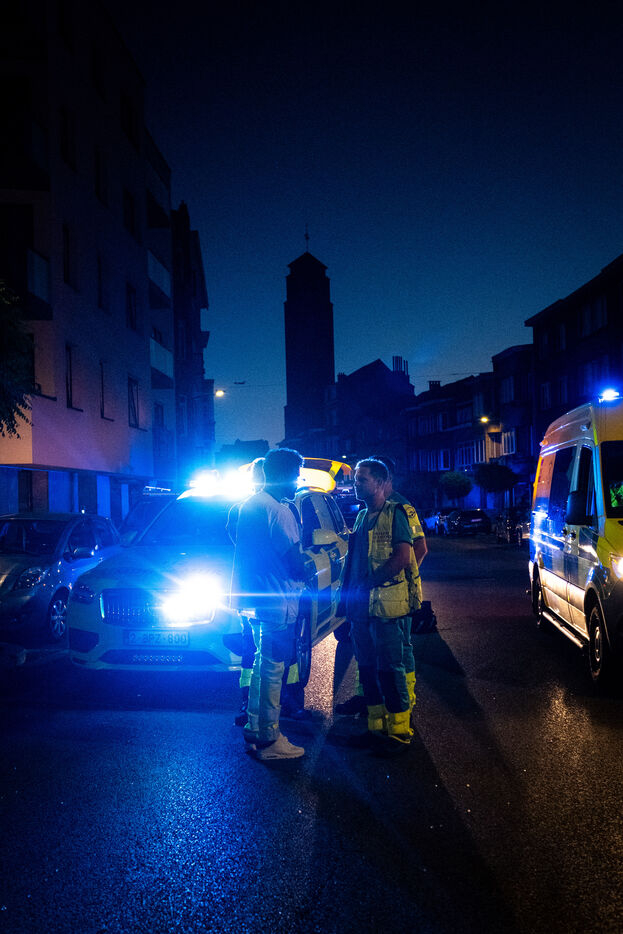 Officer Jamart is the last one on the scene, handling the final details with the police. That is when a man in his sixties, wearing a blue-and-white striped shirt tucked into his trousers, arrives. It is the mayor of Berchem-Sainte-Agathe, who has come to get information. He seems annoyed by the incorrect information he received about the fire’s location. The officer gives his conclusions. “We were confronted with a violent fire. We evacuated seven people, who were taken to hospital for smoke inhalation. The stairwell is full of soot and unusable. The first floor is uninhabitable; the electricity and gas have been shut off. The second and third floors are also affected. We advised the owners to bring in a cleaning company. Finally, rehousing is being organized: according to the police, the residents will be taken in by their families.”