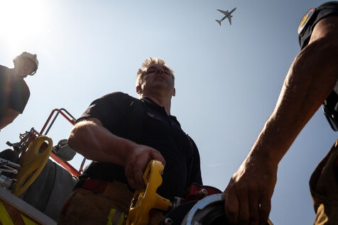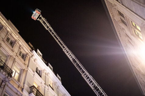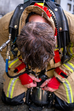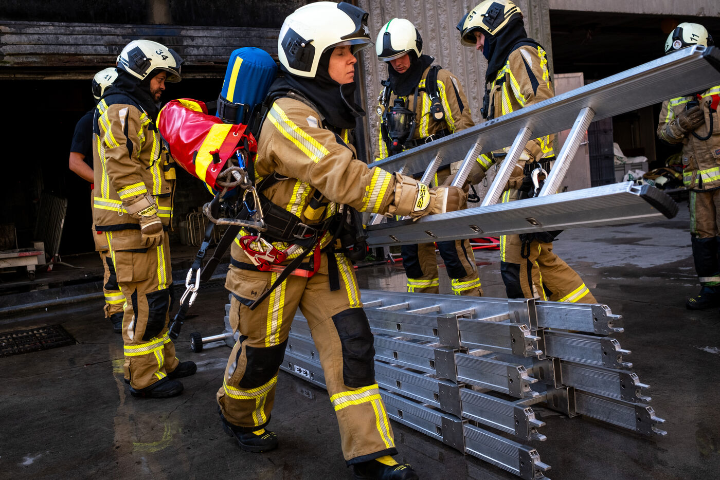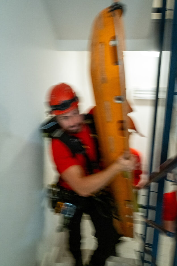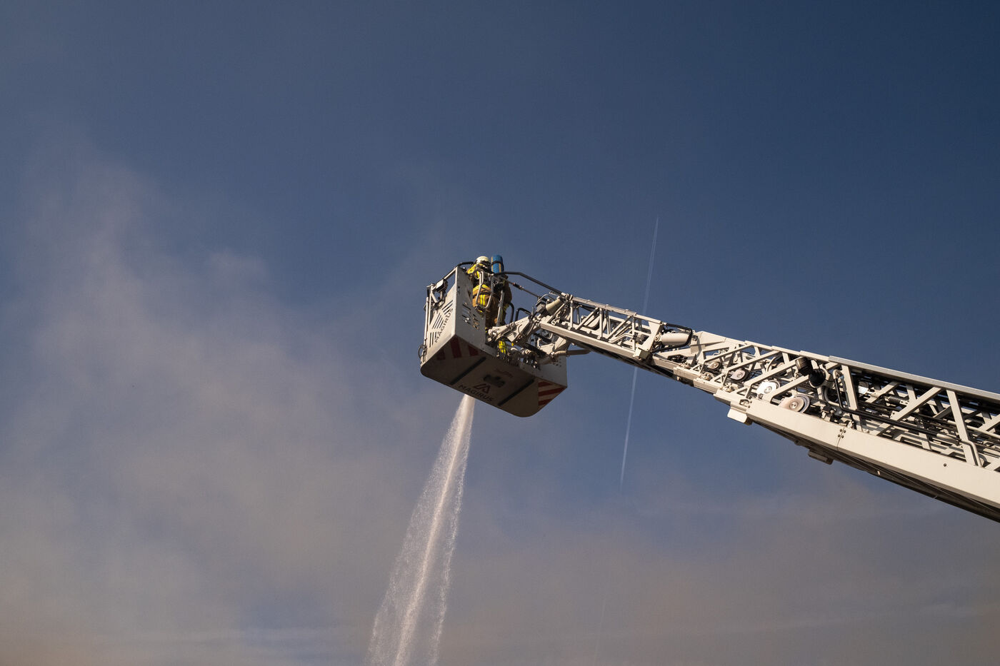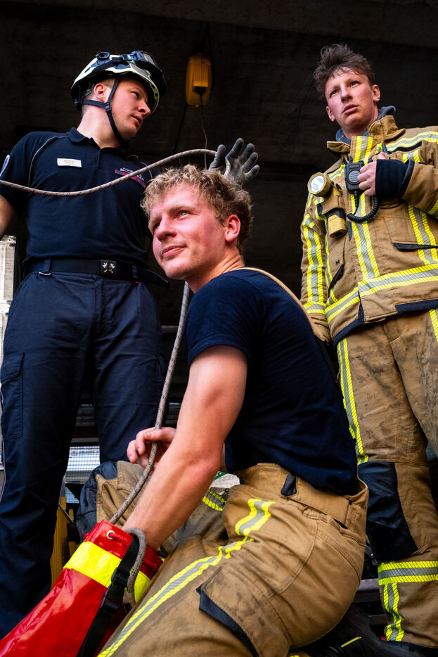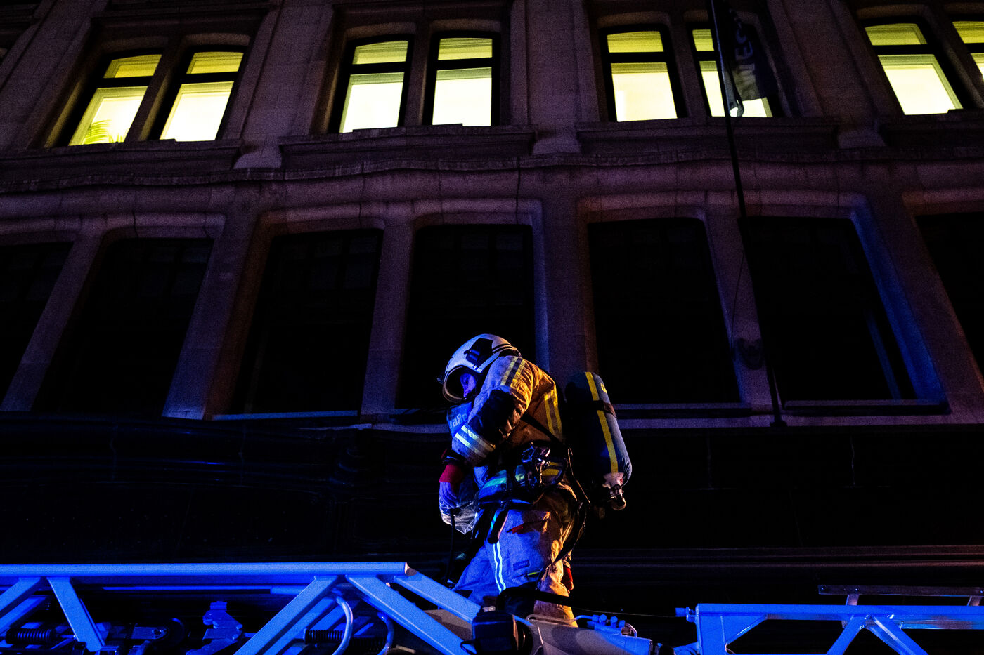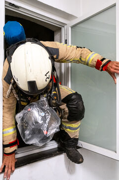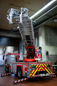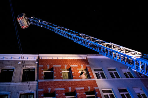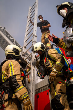 The experienced firefighters mobilize on several fronts. A hose line enters the building, and two firefighters, each on their own platform, inspect both sides of the building for any people still trapped. It is a rapid, perfectly coordinated ballet in which each person moves with complete mastery of their role. Very quickly, they overcome the flames, but the reported child, amid the confusion, remains unaccounted for.
