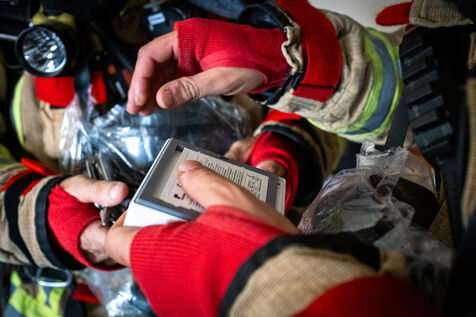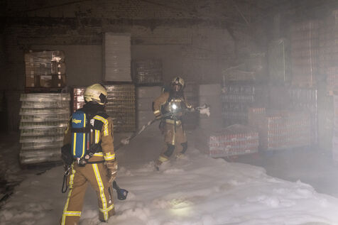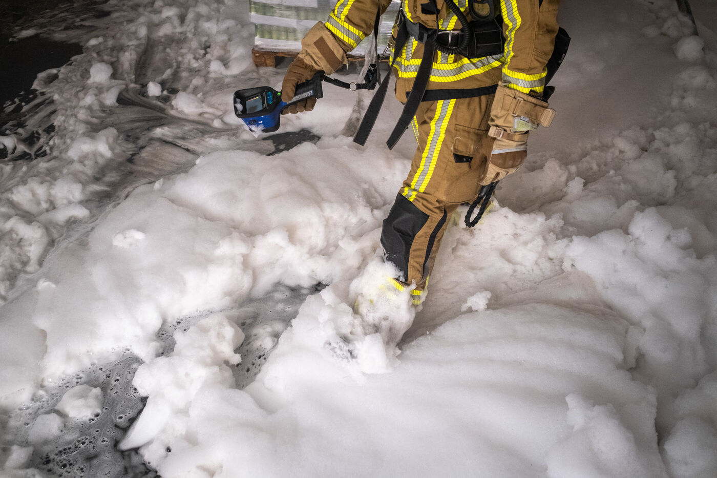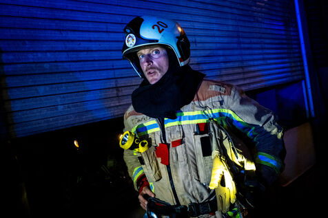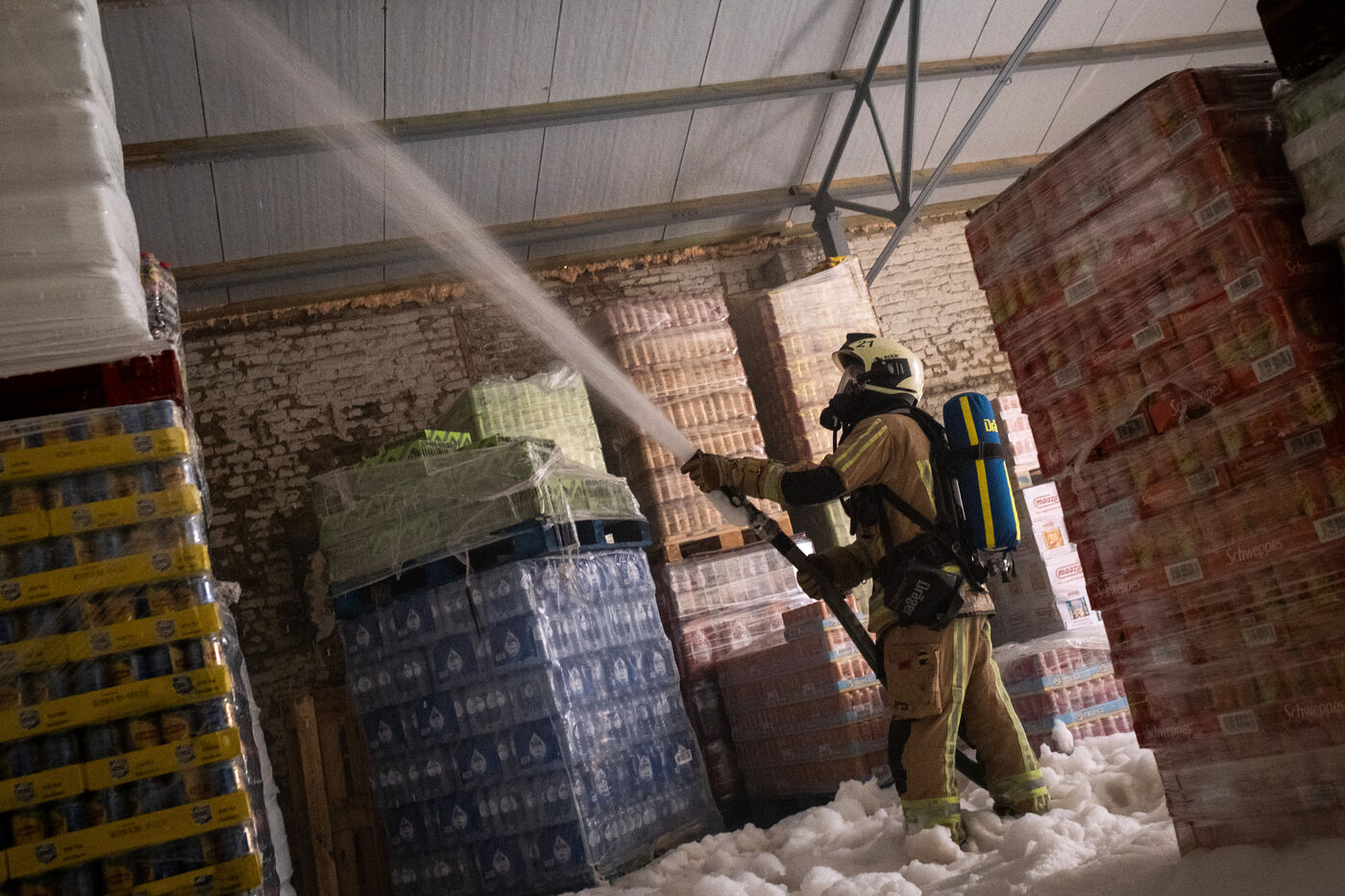 The main objective remains preventing the fire from spreading to the adjoining warehouses. Naturally worried, the tenant of one of them has been watching over his stored goods for more than an hour. Inside, the firefighters monitor the temperature of the adjacent wall with a thermal imaging camera while spraying it with an extremely foamy liquid solution. “We use water with a foam agent designed for Class A fires, meaning anything solid, like wood. It reduces the water’s surface tension, increases the wetting effect, and therefore improves the water’s cooling power.”