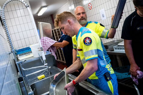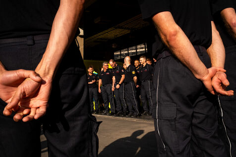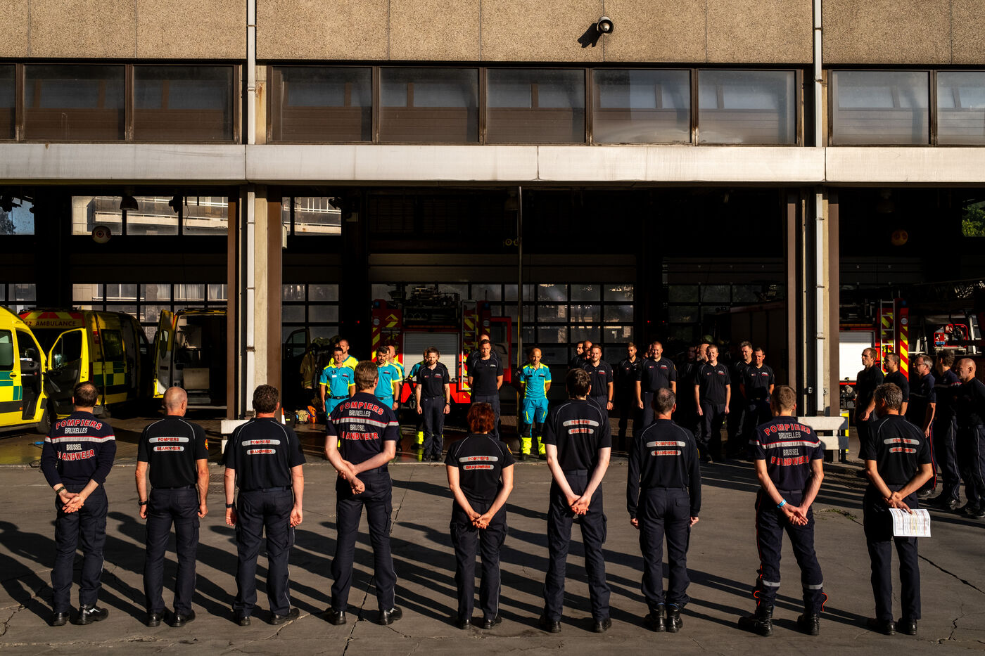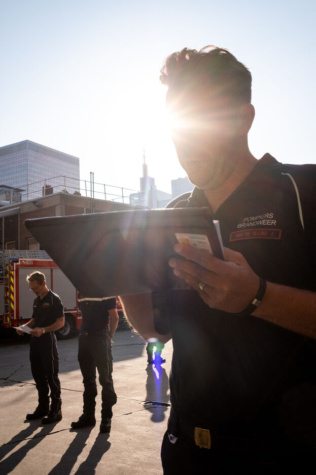 Jeudi, 8 h, Bruxelles se réveille sous un soleil éclatant en cette fin juin. À la 21e compagnie, la relève démarre avec la traditionnelle prise de service pour 24 heures. La cinquantaine de pompiers plaisantent jusqu’à ce que le sergent-major Francotte s’impose avec autorité : « Silence, s’il vous plaît ! ». C’est l’heure de l’appel du matin, qui se déroule en français, ponctué de quelques « Aanwezig ! » (« Présent ! ») en néerlandais. Les informations majeures, comme la météo – « de fortes chaleurs aujourd’hui, pas d’exercice, faites attention à vous et hydratez-vous » –, sont systématiquement répétées en néerlandais pour tous.