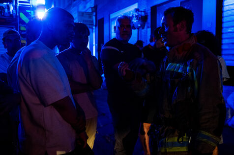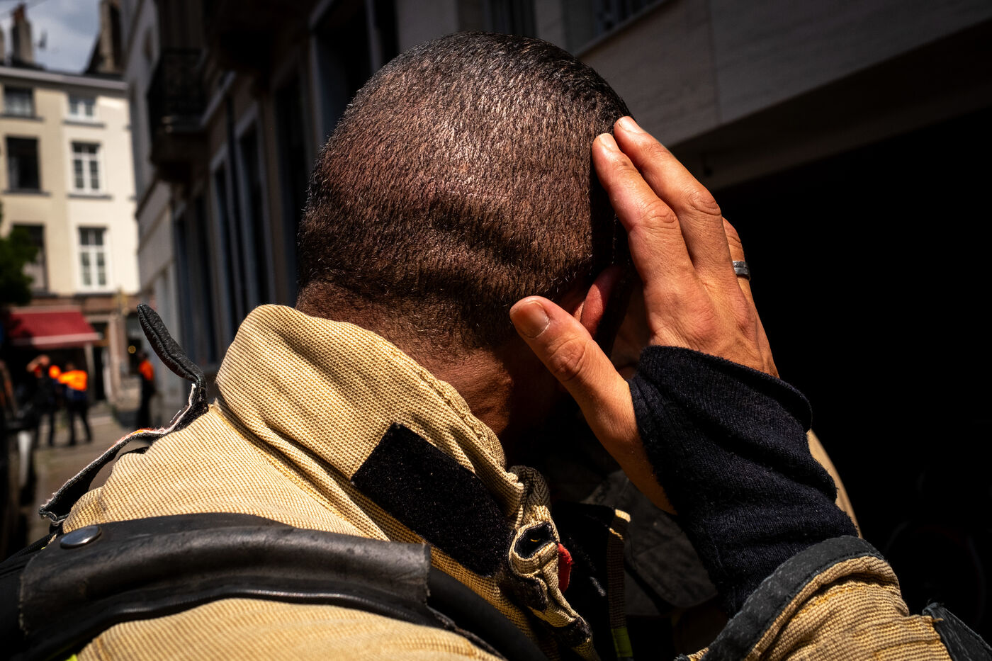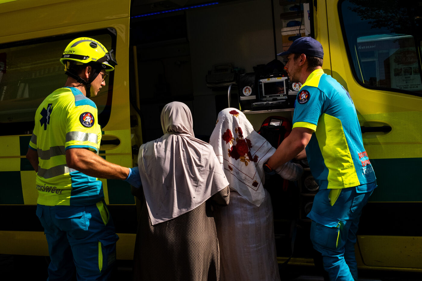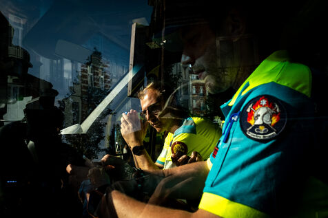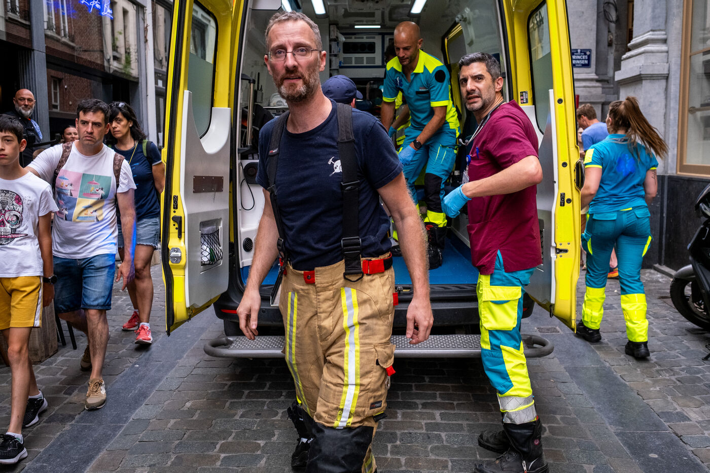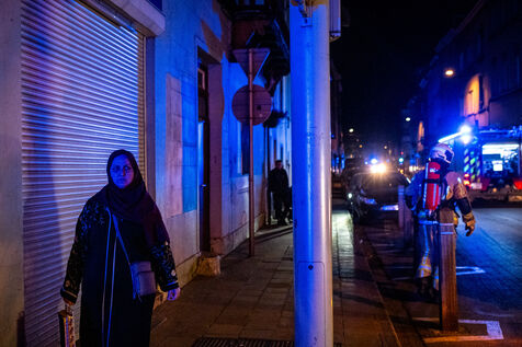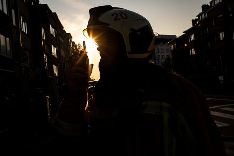 On the way back to the station, the radio reports a kitchen fire in Molenbeek, with many victims needing treatment. “We’re not very far away, we’re going there to set up a medical support area,” announces Officer Jalet. Three ambulances already on site have taken charge of some of the injured, including a teenager suffering continuous vomiting from smoke inhalation, and beside him his younger brother on oxygen. The fire is contained, but the building is still smoking. The street is narrow and agitated. Many onlookers are watching the scene behind the security cordons.