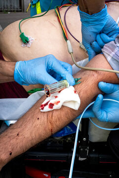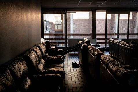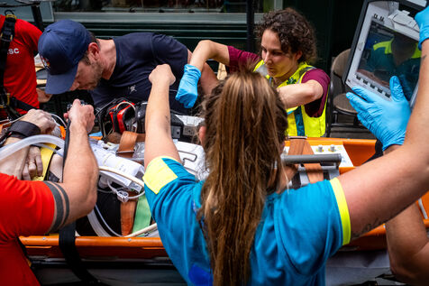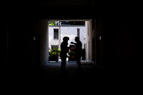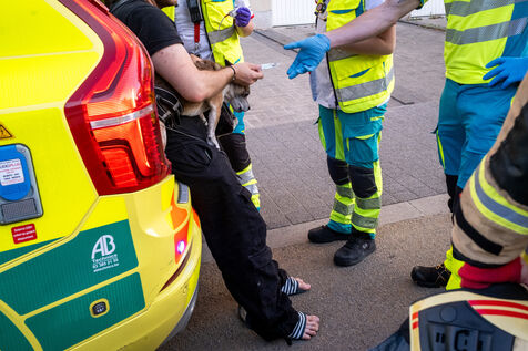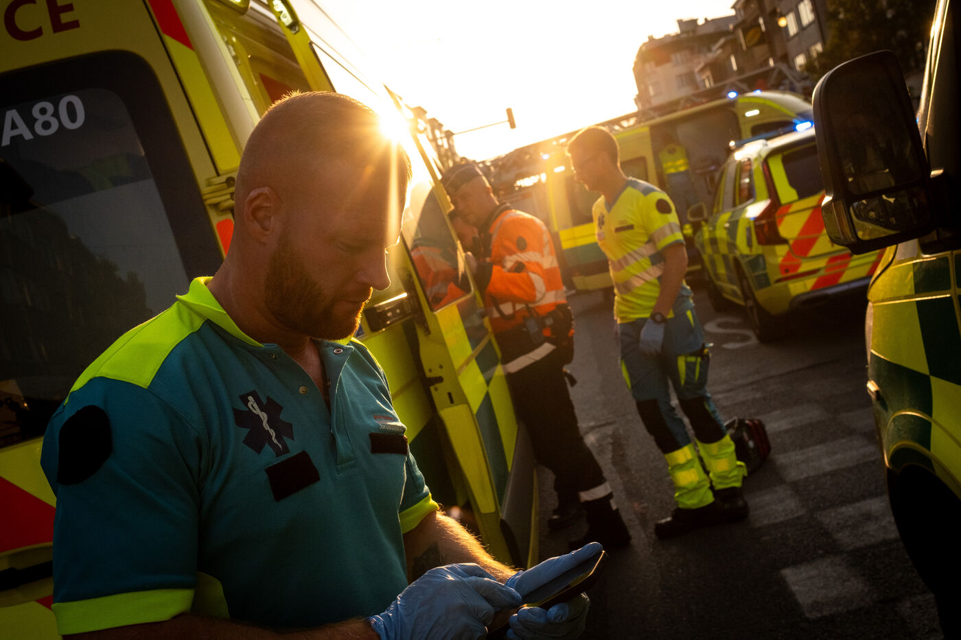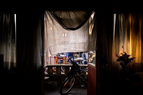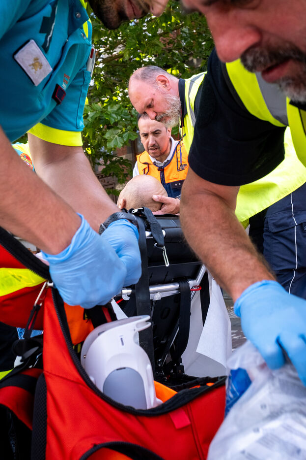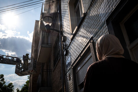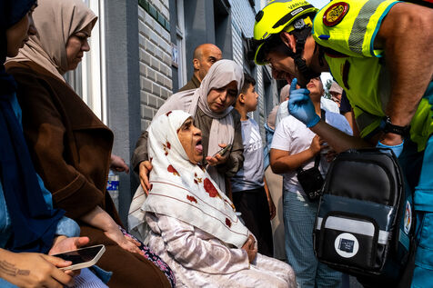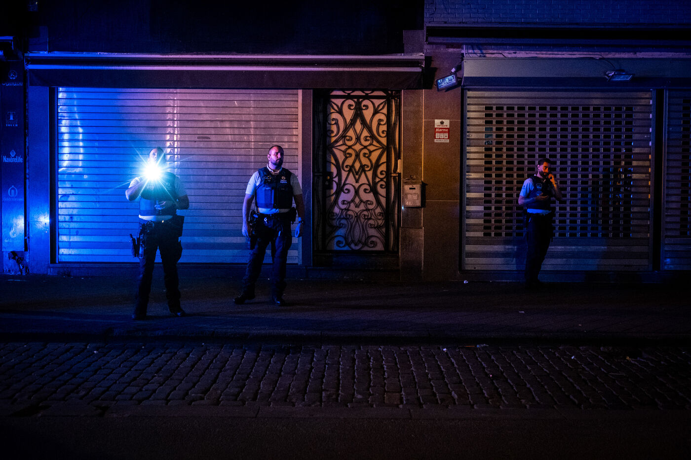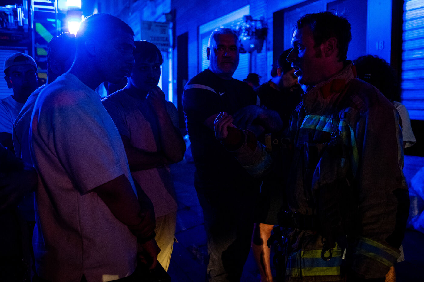On the way back to the station, the radio reports a kitchen fire in Molenbeek, with many victims needing treatment. “We’re not very far away, we’re going there to set up a medical support area,” announces Officer Jalet. Three ambulances already on site have taken charge of some of the injured, including a teenager suffering continuous vomiting from smoke inhalation, and beside him his younger brother on oxygen. The fire is contained, but the building is still smoking. The street is narrow and agitated. Many onlookers are watching the scene behind the security cordons.