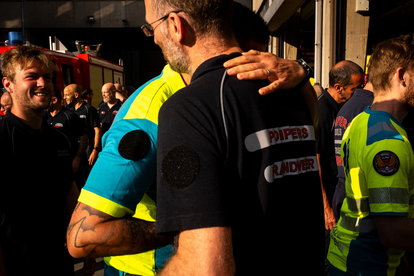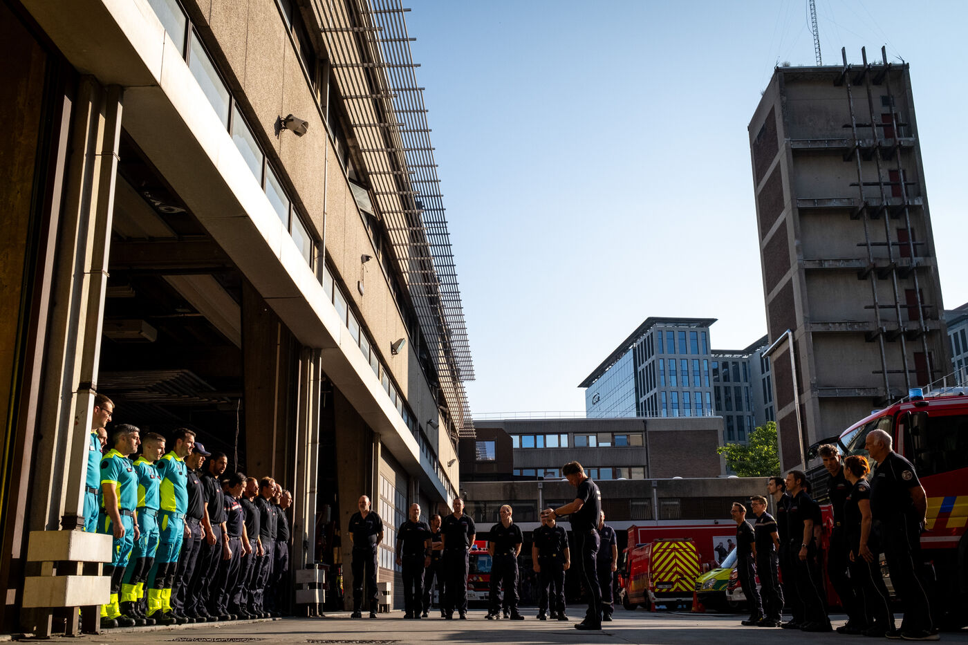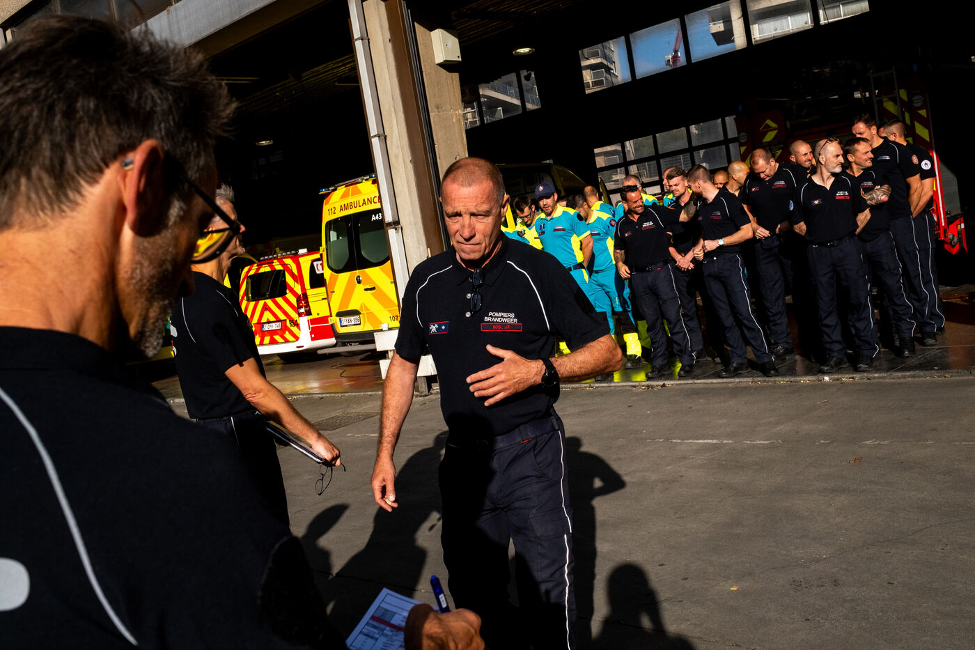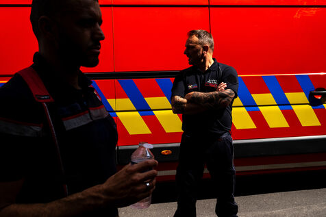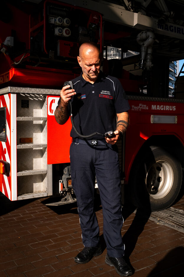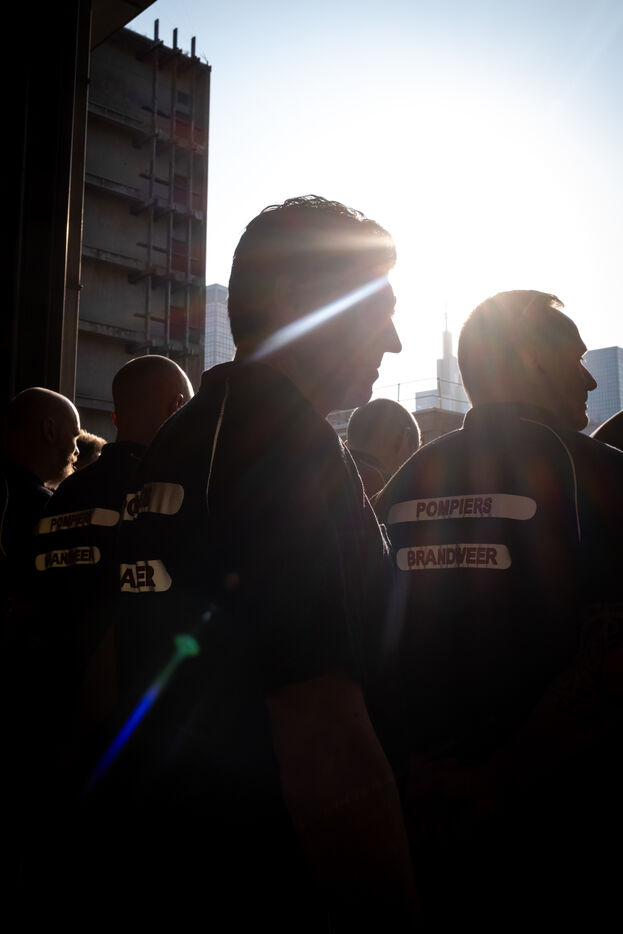 Thursday, 8 a.m., Brussels wakes up under bright sunshine at the end of June. At the 21st company, the shift begins with the traditional 24-hour handover. The fifty or so firefighters joke around until Sergeant Major Francotte imposes himself with authority: “Silence, please!” It is time for the morning roll call, conducted in French and punctuated by a few “Aanwezig!” (“Present!”) in Dutch. Major information, such as the weather—“very hot today, no drill, take care of yourselves and stay hydrated”—is systematically repeated in Dutch for everyone.