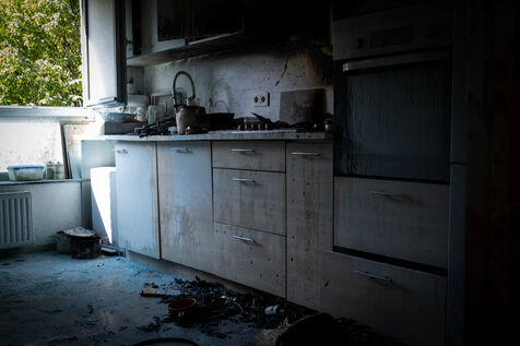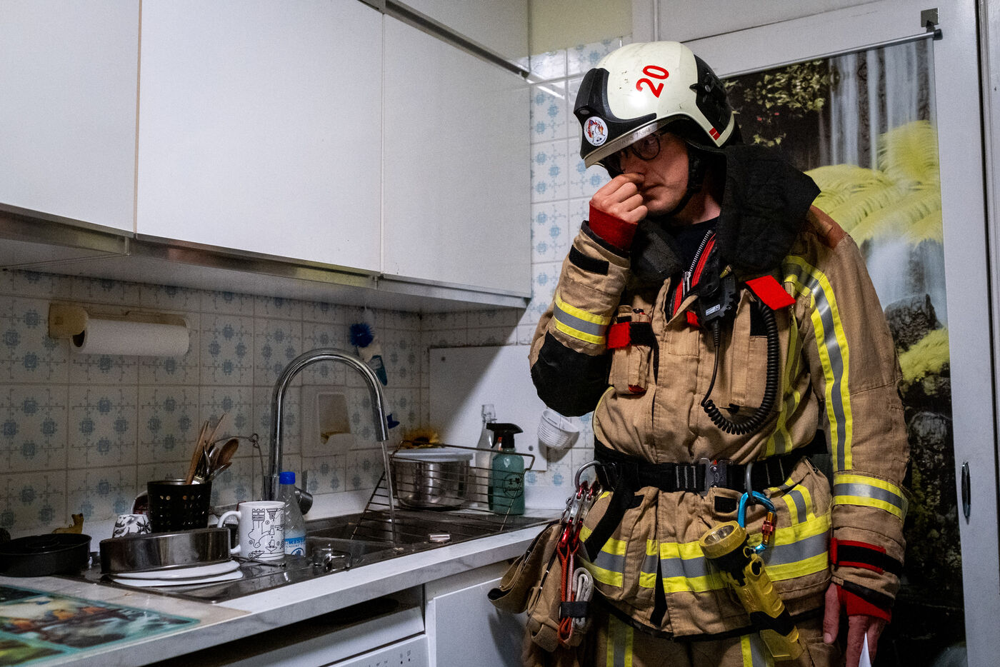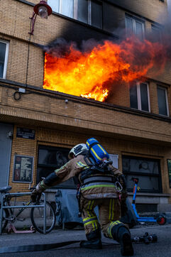 About fifteen minutes later, the fire is under control and the building has been cleared of smoke. The family living in the apartment where the fire broke out will have to be rehoused. The officer accompanies the father back inside so he can retrieve a few personal belongings. His home is unharmed except for the kitchen, ravaged by the powder extinguisher; it bears an unusual bluish tint, while the stove reduced to ashes reveals the source of the fire: a saucepan left on the burner... In the ambulances, the condition of the injured is stable. Transfers to the various Brussels hospitals are being organized, taking care not to separate relatives.