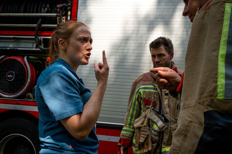 At the foot of the bustling building, several women suffering from smoke inhalation wait to be treated. One of them, older, clutches her cat rescued from the flames; Officer Jalet quickly escorts her, along with the other victims, to the medical reinforcements.