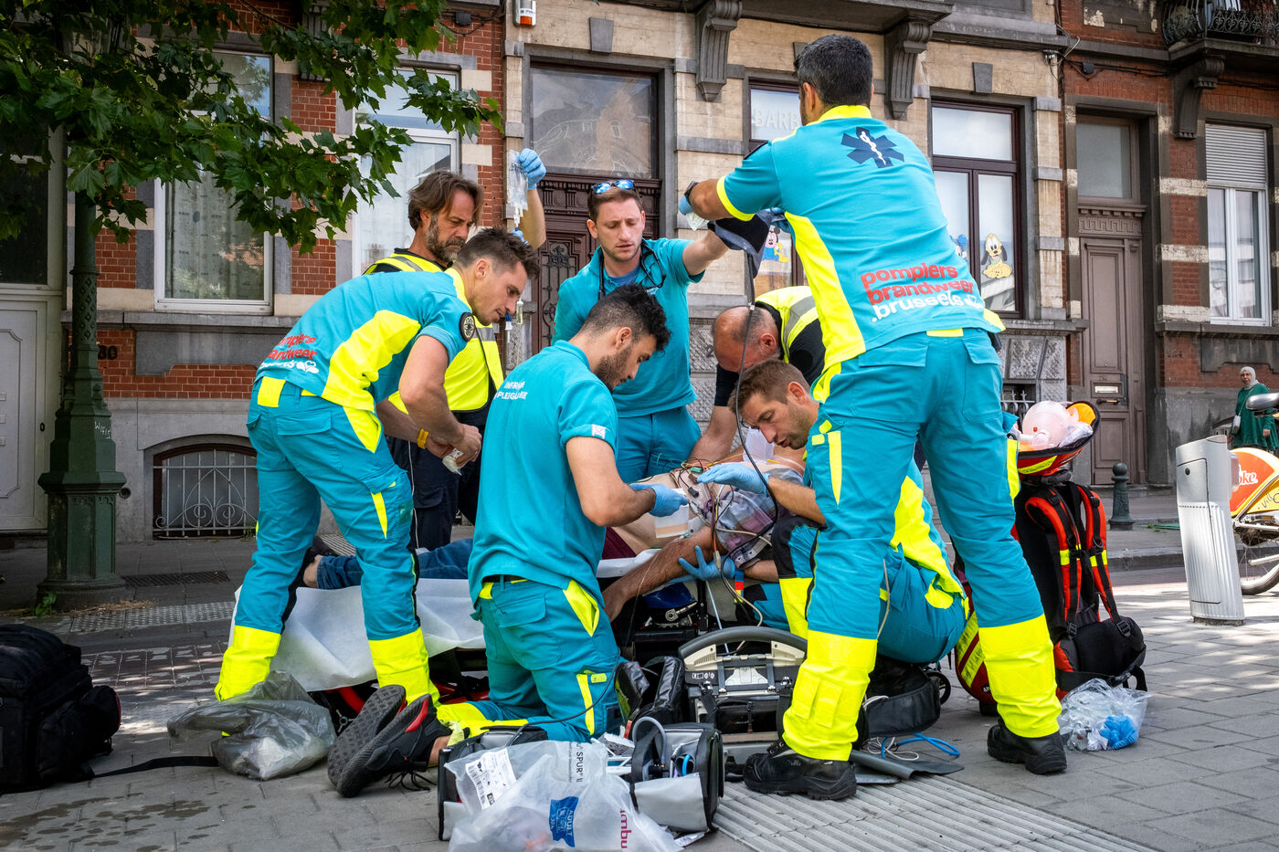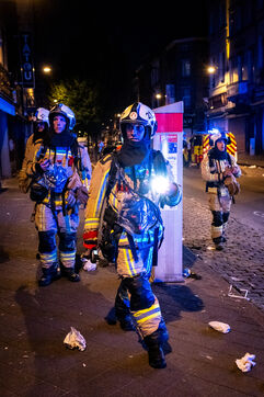 Sur le trajet du retour à la caserne, la radio annonce un feu de cuisine à Molenbeek, avec de nombreuses victimes à prendre en charge. « Nous ne sommes pas très loin, on va s’y rendre pour mettre en place un chantier d’appui médical », annonce l’officier Jalet. Trois ambulances sur place ont déjà pris en charge une partie des blessés, dont un adolescent pris de vomissements continus à cause des fumées inhalées, et, à côté de lui, son petit frère placé sous oxygène. Le feu est contenu, mais le bâtiment est encore fumant. La rue est étroite et agitée. Beaucoup de badauds assistent à la scène derrière les cordons de sécurité.